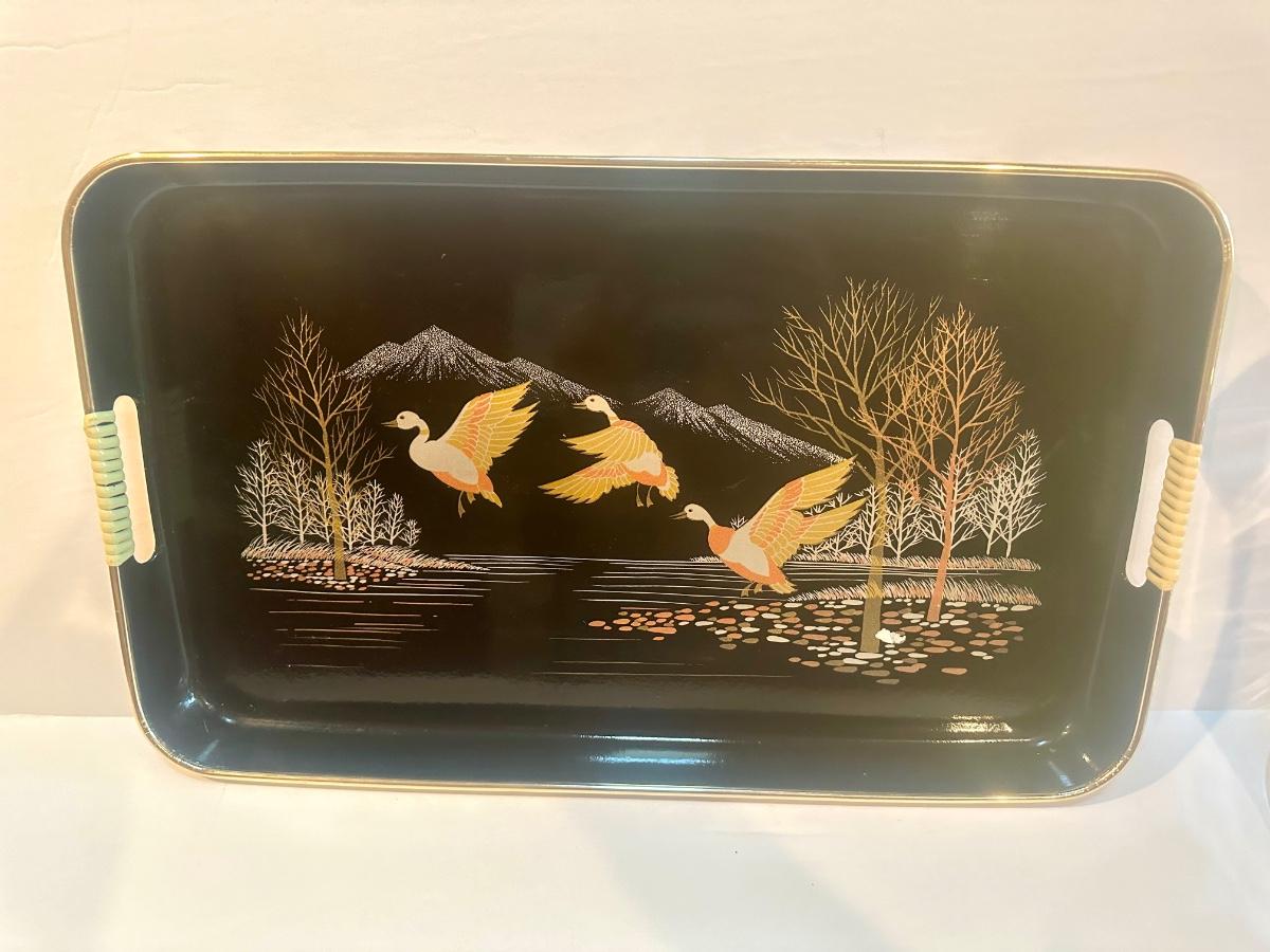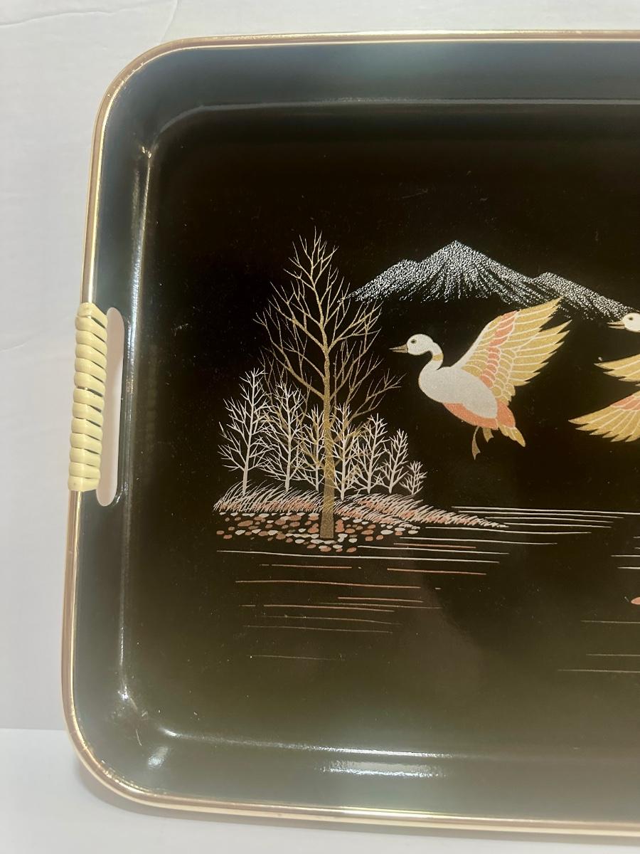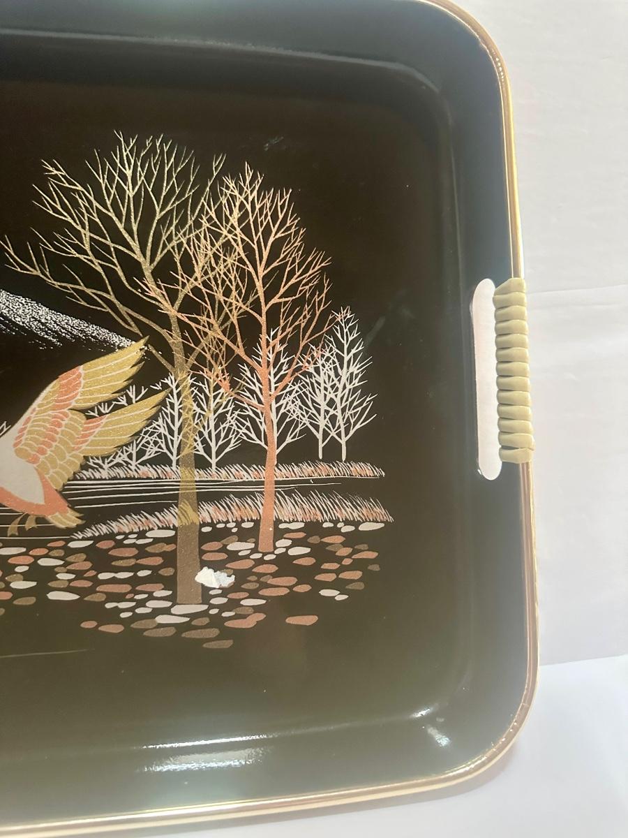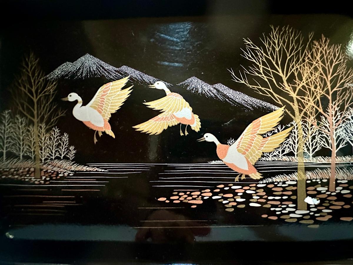 Beautiful nature scene, in gold and silver on black, gold trim.