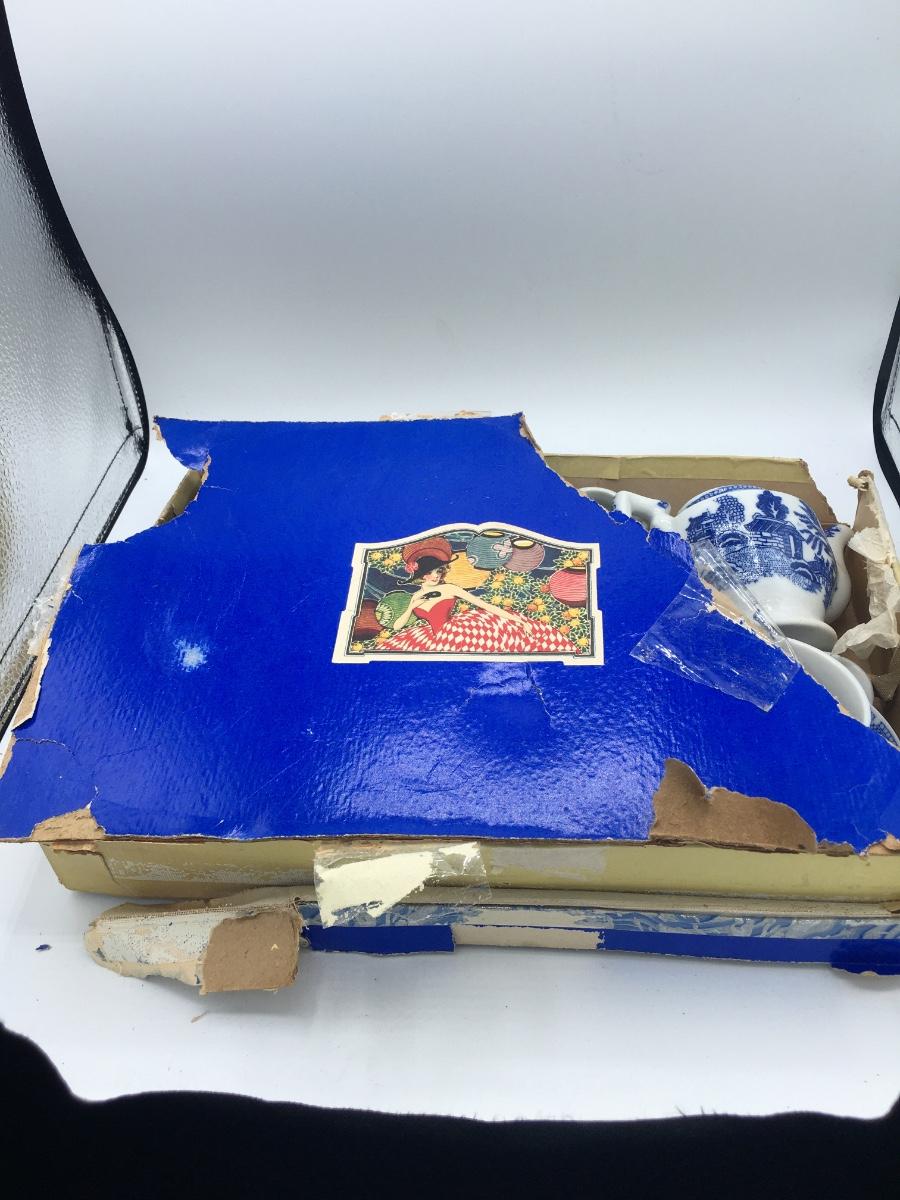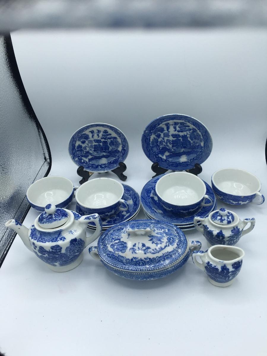 Vintage 16 pc. Japanese Blue Willow Children’s Tea Set. Some of the pieces the plates and saucers are marked “made in Japan”. The teapot, tureen, sugar and creamer and cups are not marked. All In good condition no chips or cracks.