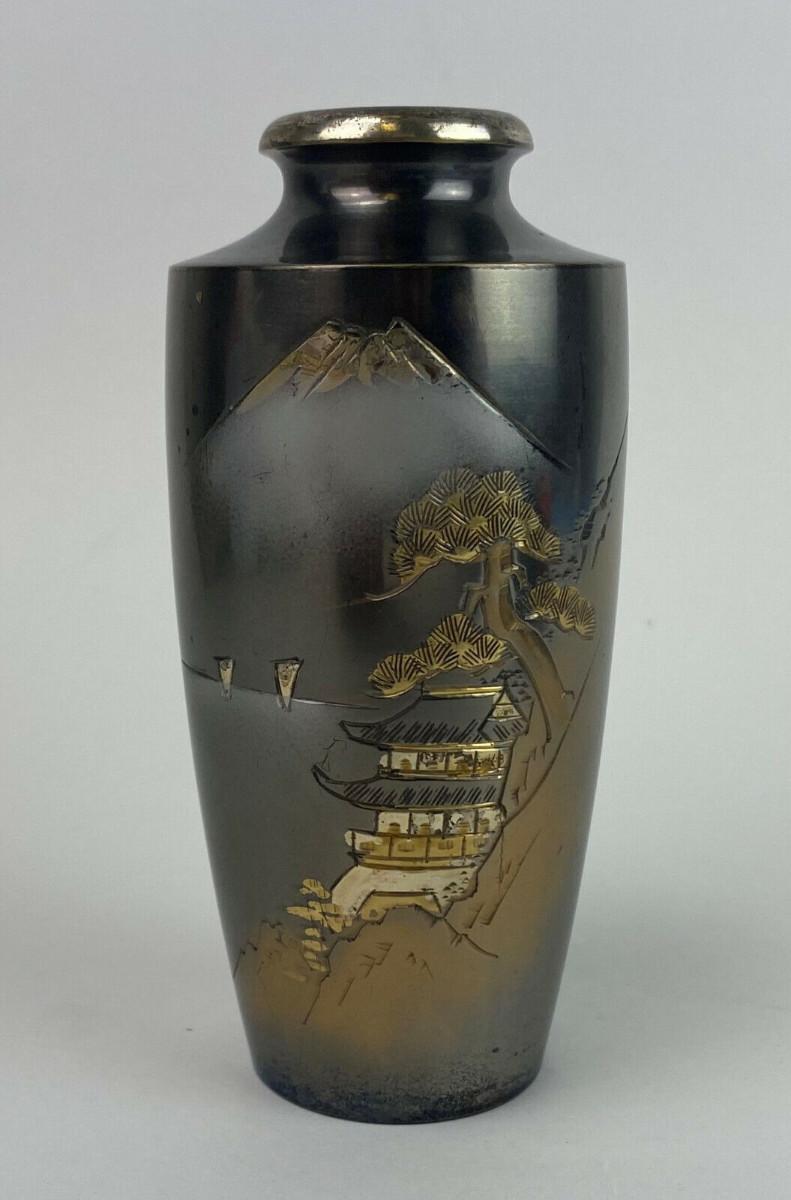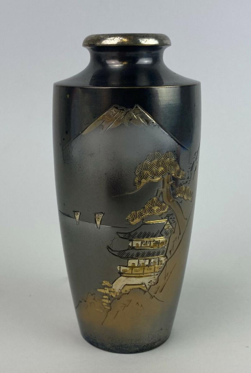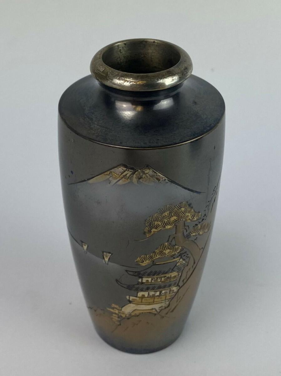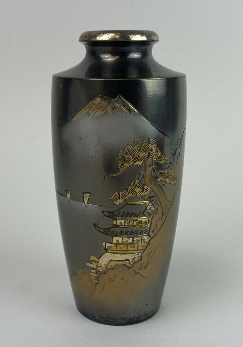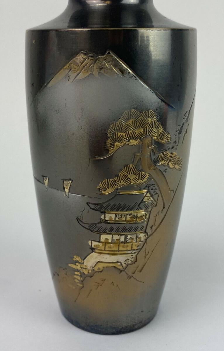 Here is a recent estate find..a small vintage Japanese Bronze Mixed Metal Etched Vase...Stands just 4 1/2 inches tall...Good condition..Features a traditional scene of a landscaped Temple and Mount Fuji.