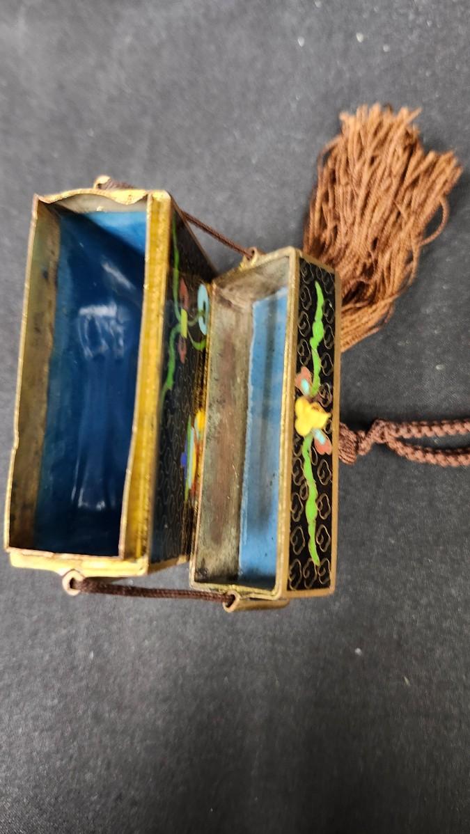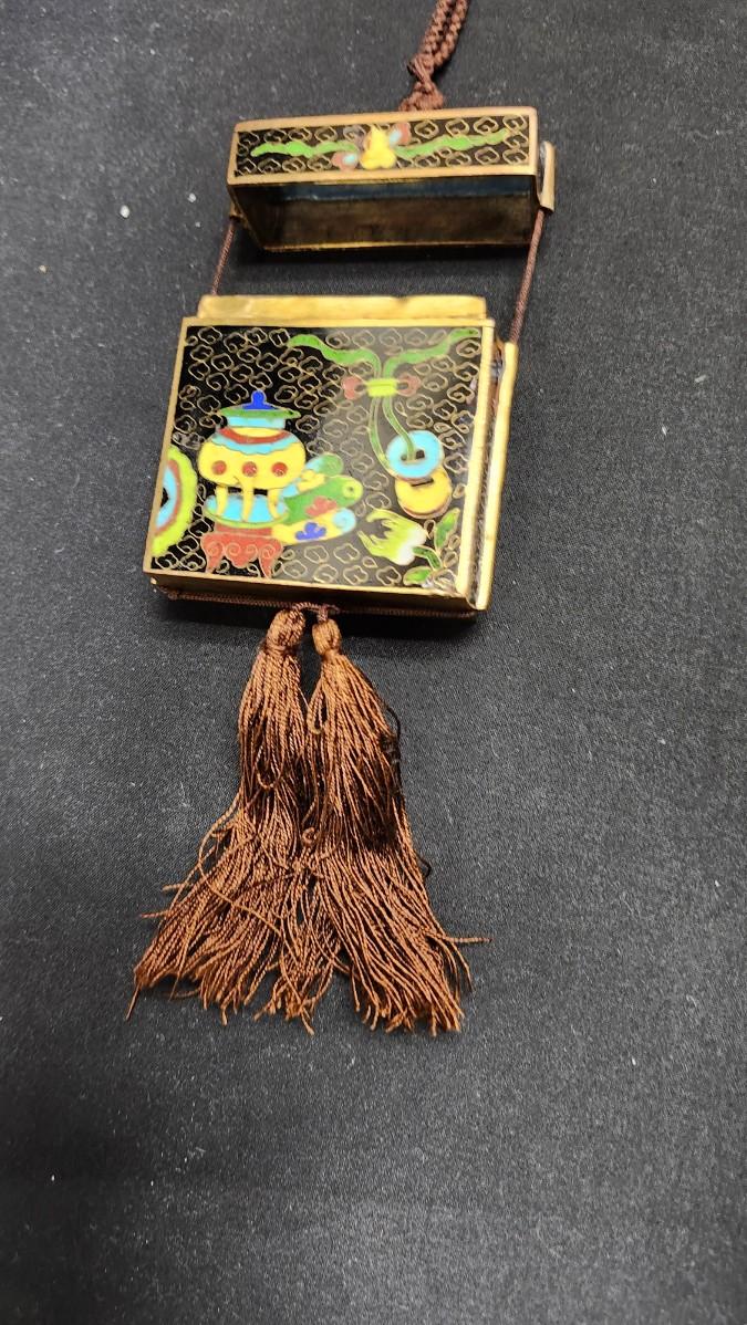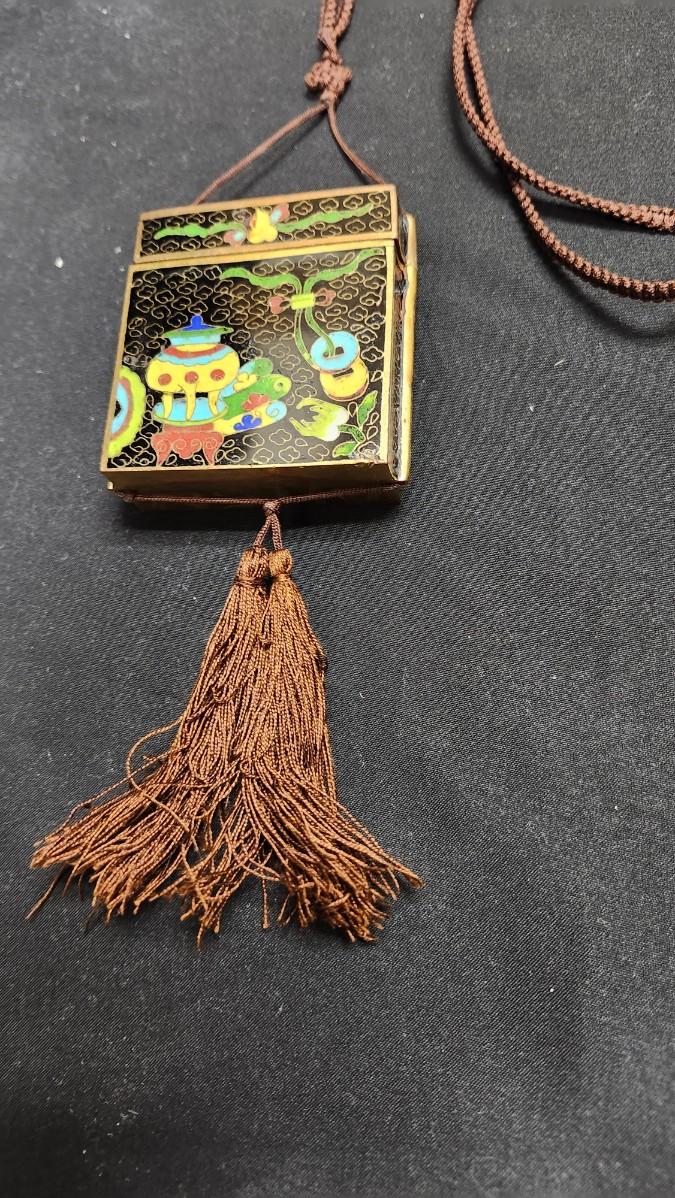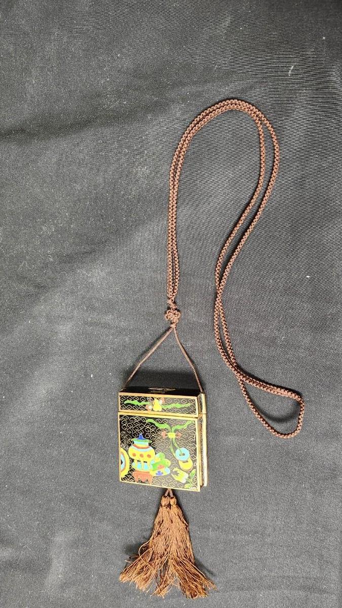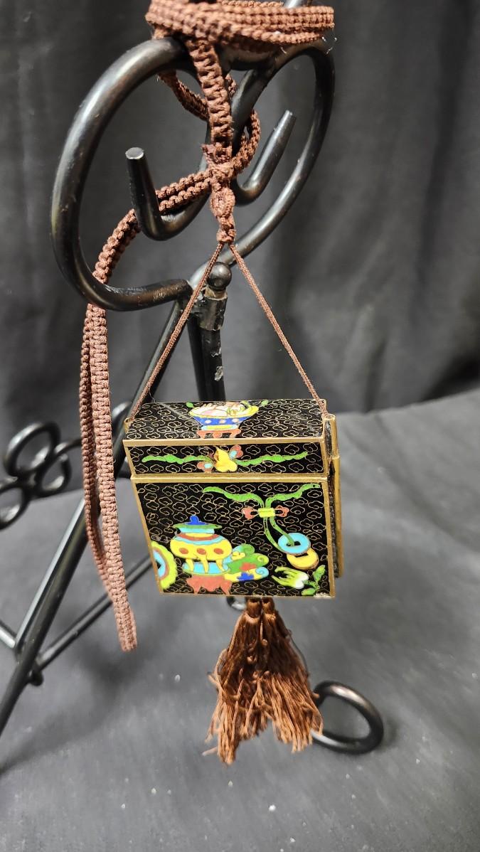 Beautiful Inro box, these were originally worn on the belt, as robes lacked pockets. Also called a sagemono, it can hold small objects, or may be used for opium. 2.5 x 2.5 x ~1 inch wide. Very nice condition.