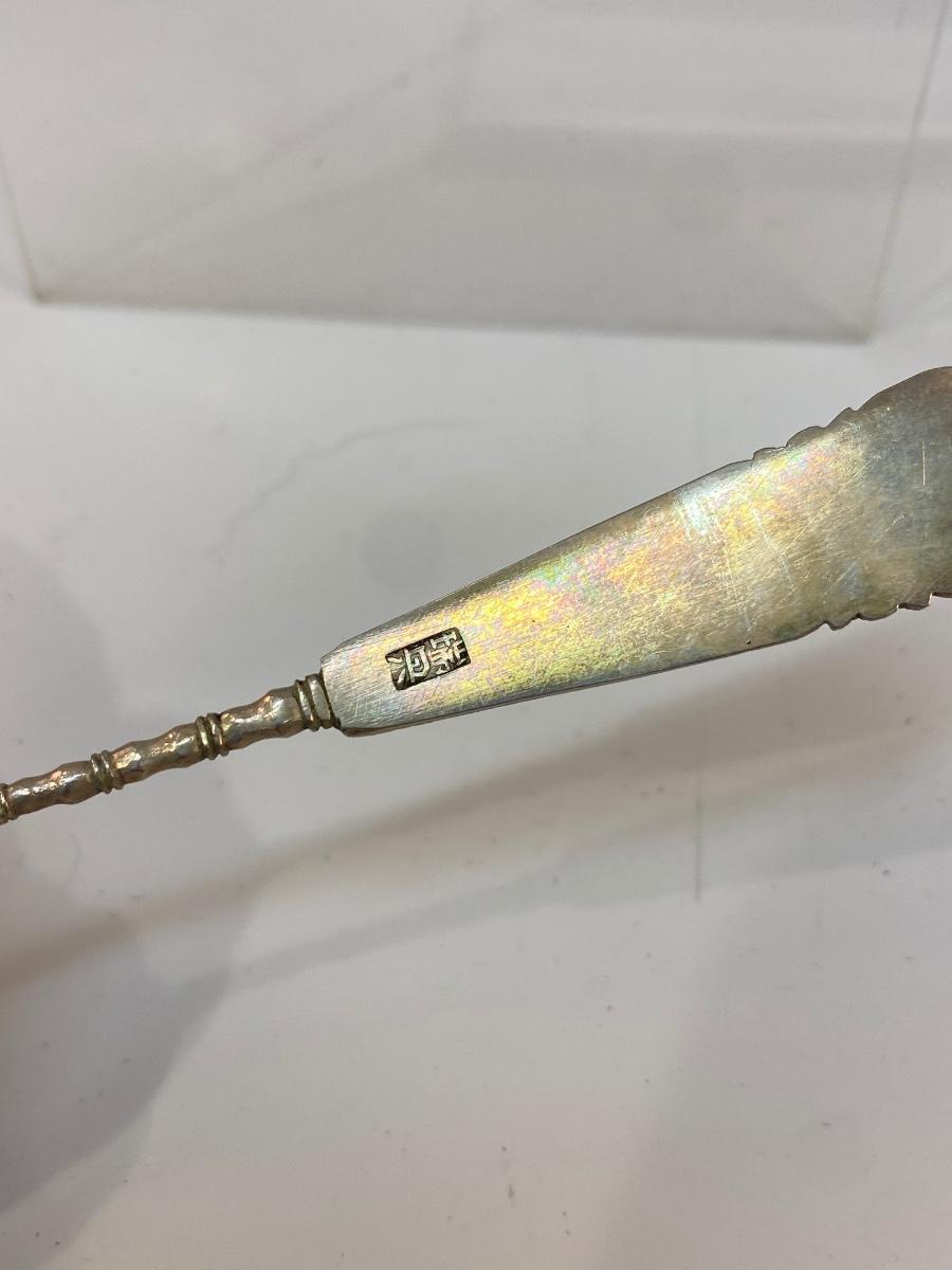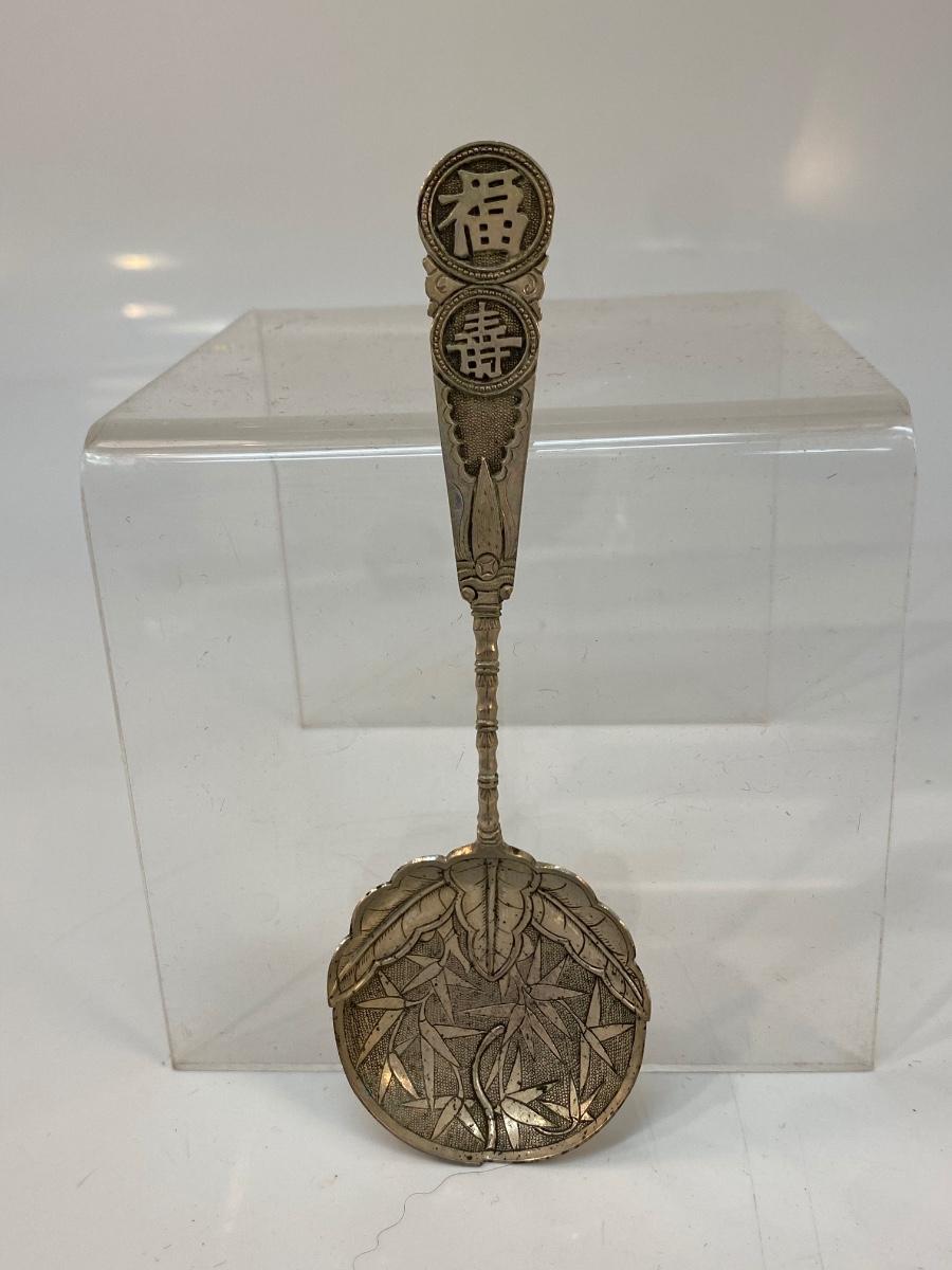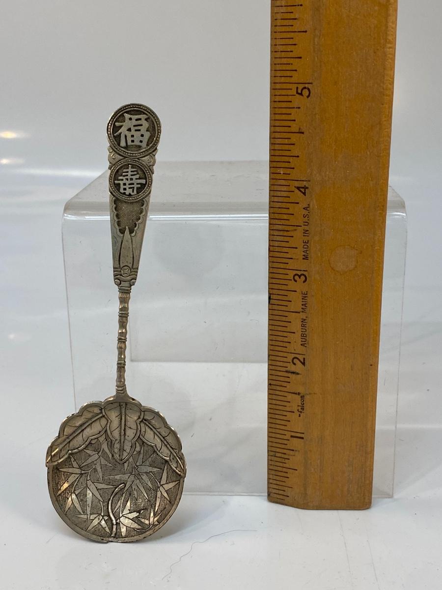 Vintage Japanese Bamboo Collector Spoon. Features lettering and bamboo. No sterling marks but it is stamped in Japanese on back of handle as well.