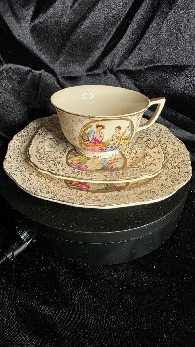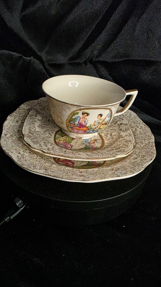 Buy early on our website at: https://treasuresofbako.com/products/vintage-japanese-courting-couple-tea-trio-cup-saucer-plate-gilt-rococo-watteau-scene-aw-japan-mark?utm_source=copyToPasteBoard&utm_medium=product-links&utm_content=web