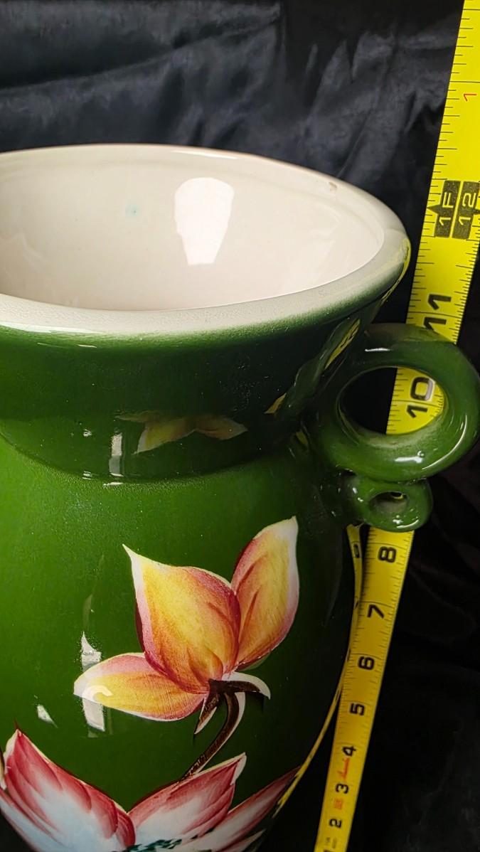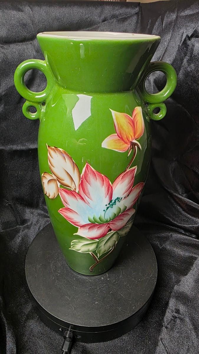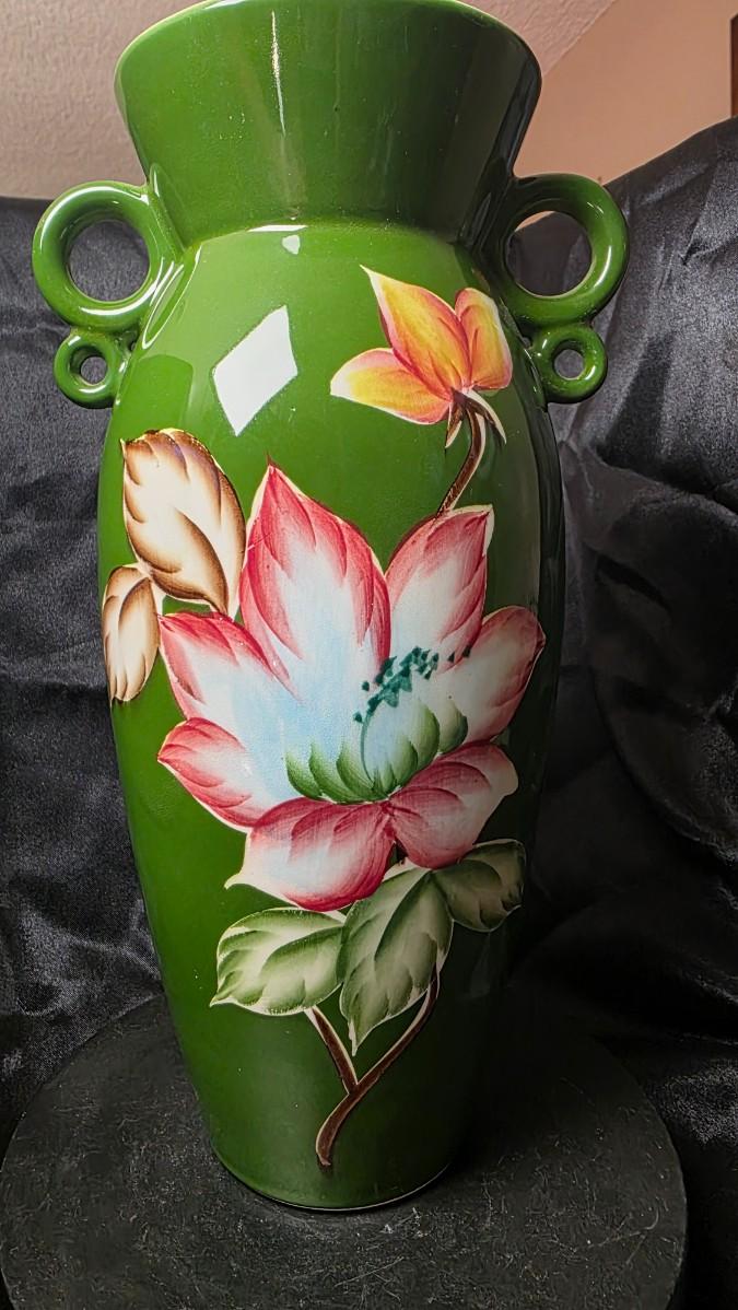 Vintage Japanese Hand-Painted Green Ceramic Vase – Twin Loop Handles, Lotus Floral Design