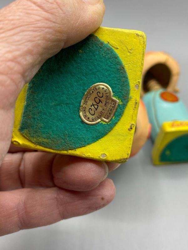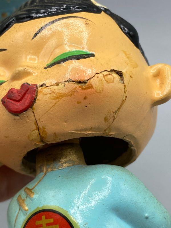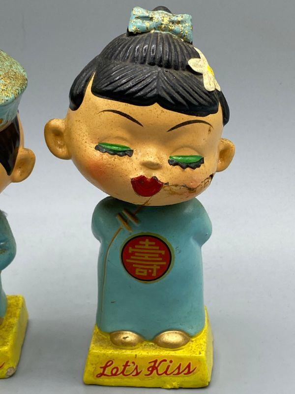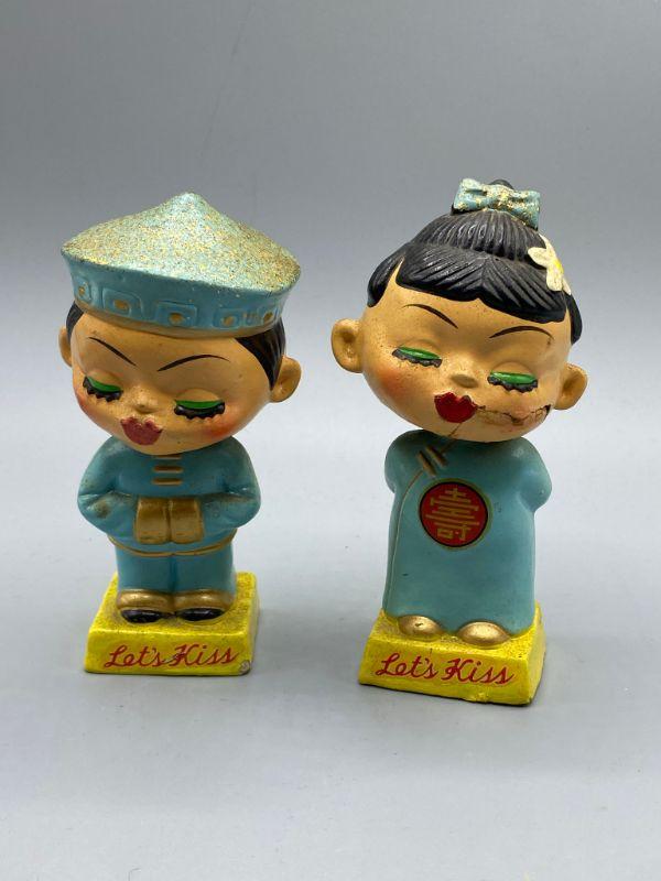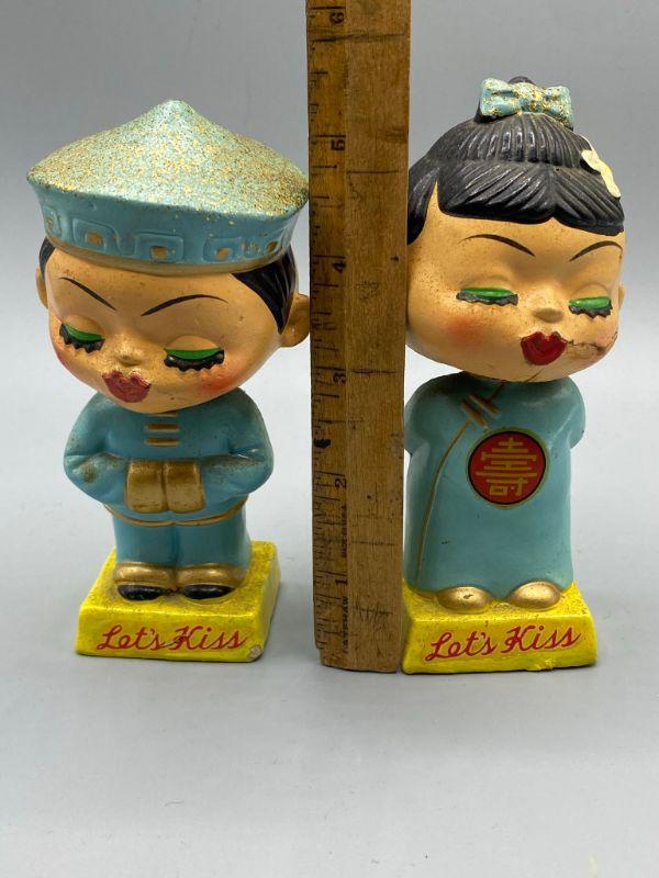 Vintage pair of bobblehead dolls. Made in Japan, these Japanese dolls are puckered up with the quote Let's Kiss at the bottom. Unfortunately one has been repaired. They have coin slots in their backs but bottom is felted so coins would be stuck inside. In vintage condition, show their age. About 5.5" tall.