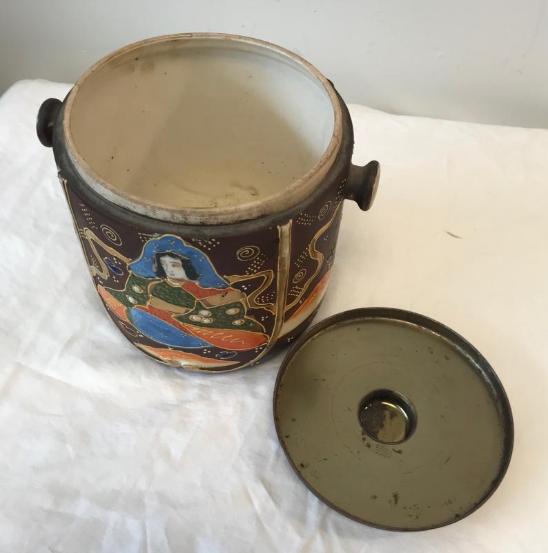 Description: Japanese ice Bucket and Cover. Measurements approximate: 10.5 H X 5 W. Material: Porcelain & Painted Metal. Shipping Charges: $17. Condition: Some tarnishing due to vintage nature of item otherwise good.