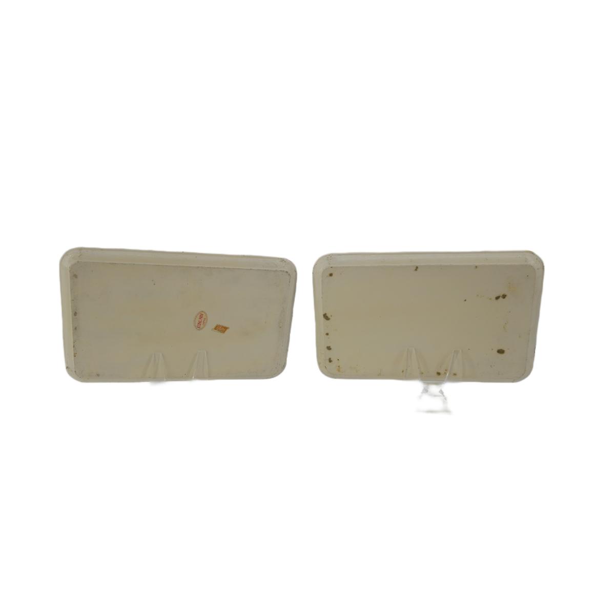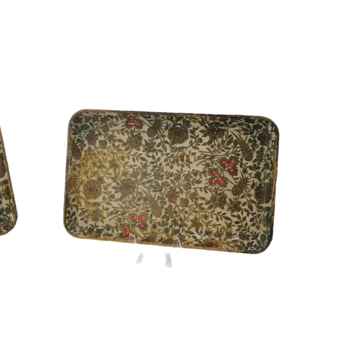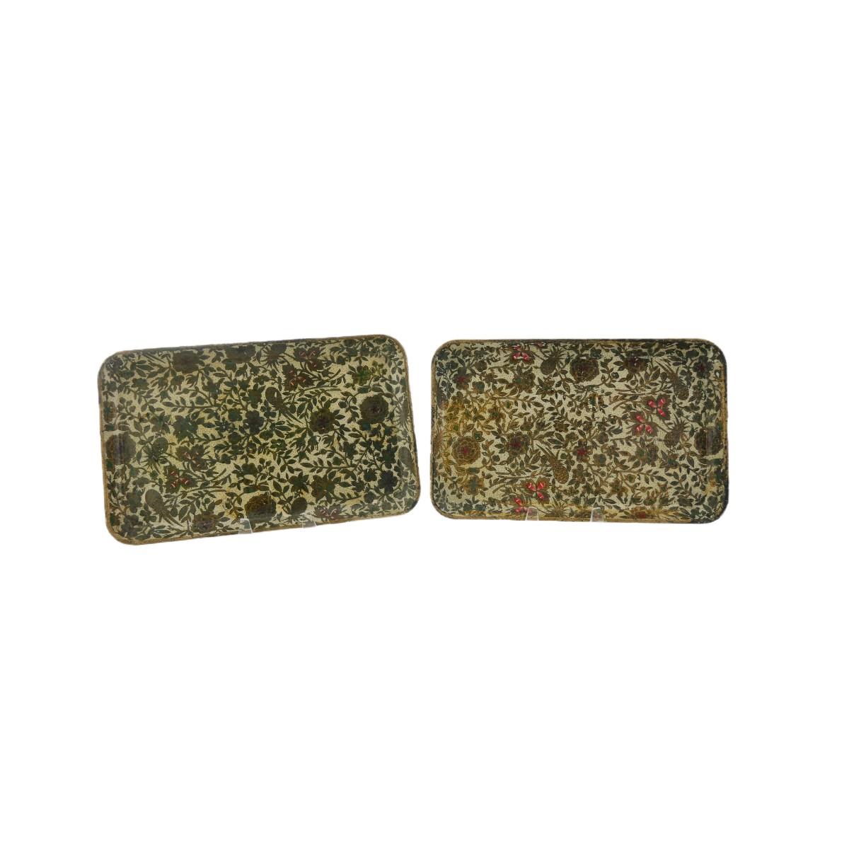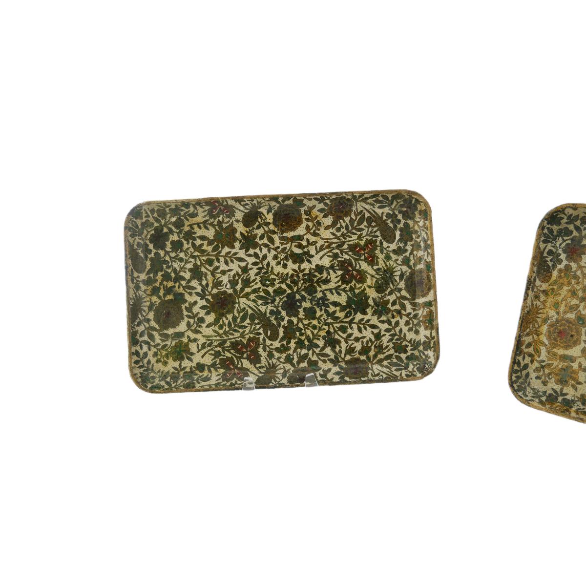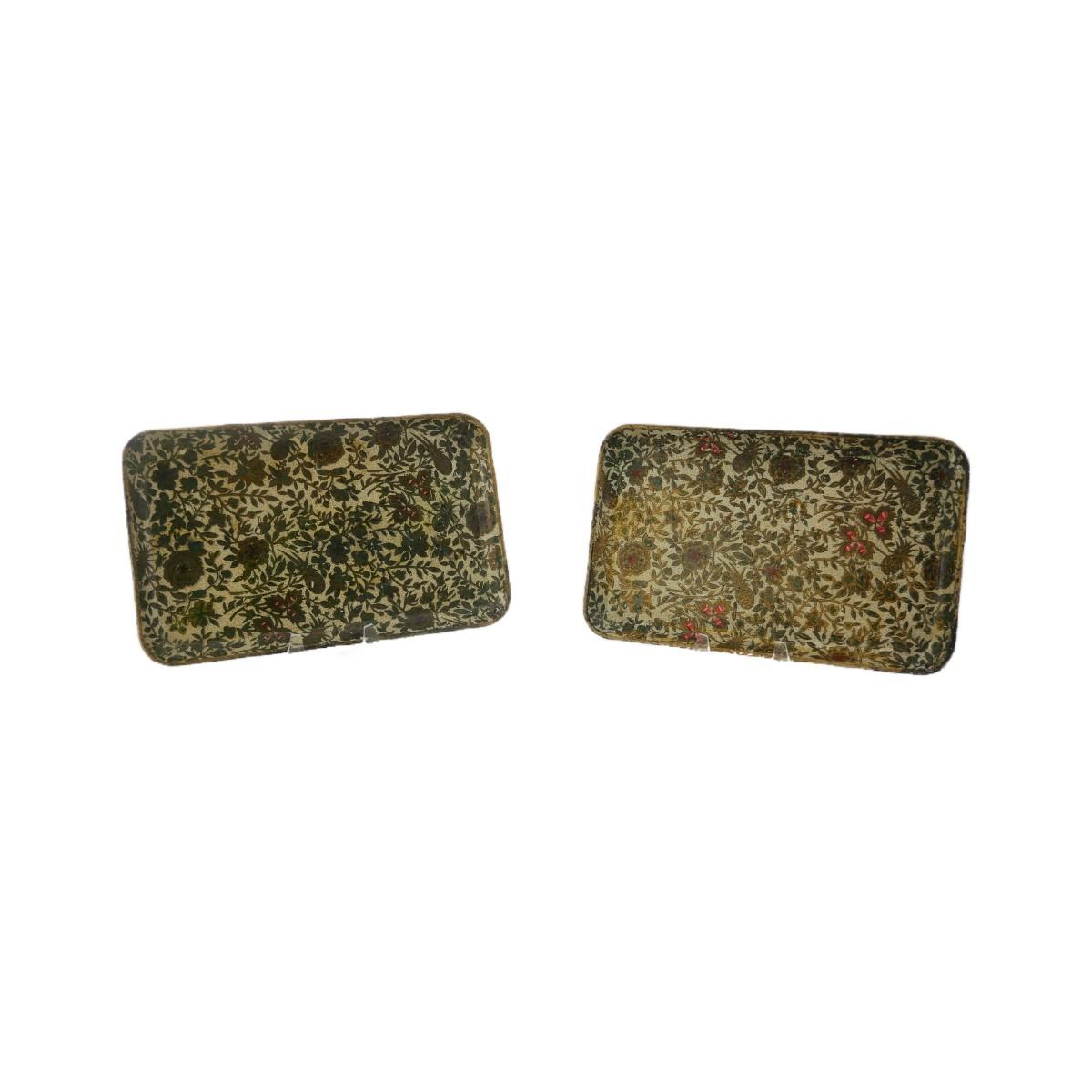 Set of two vintage 1900s Japanese flower and pineapple designed perfume, jewelry trays. Each measures 8.5" x 5". Lot weighs 6 oz. Heavy wear and use on both. Fair to good condition. (D63)