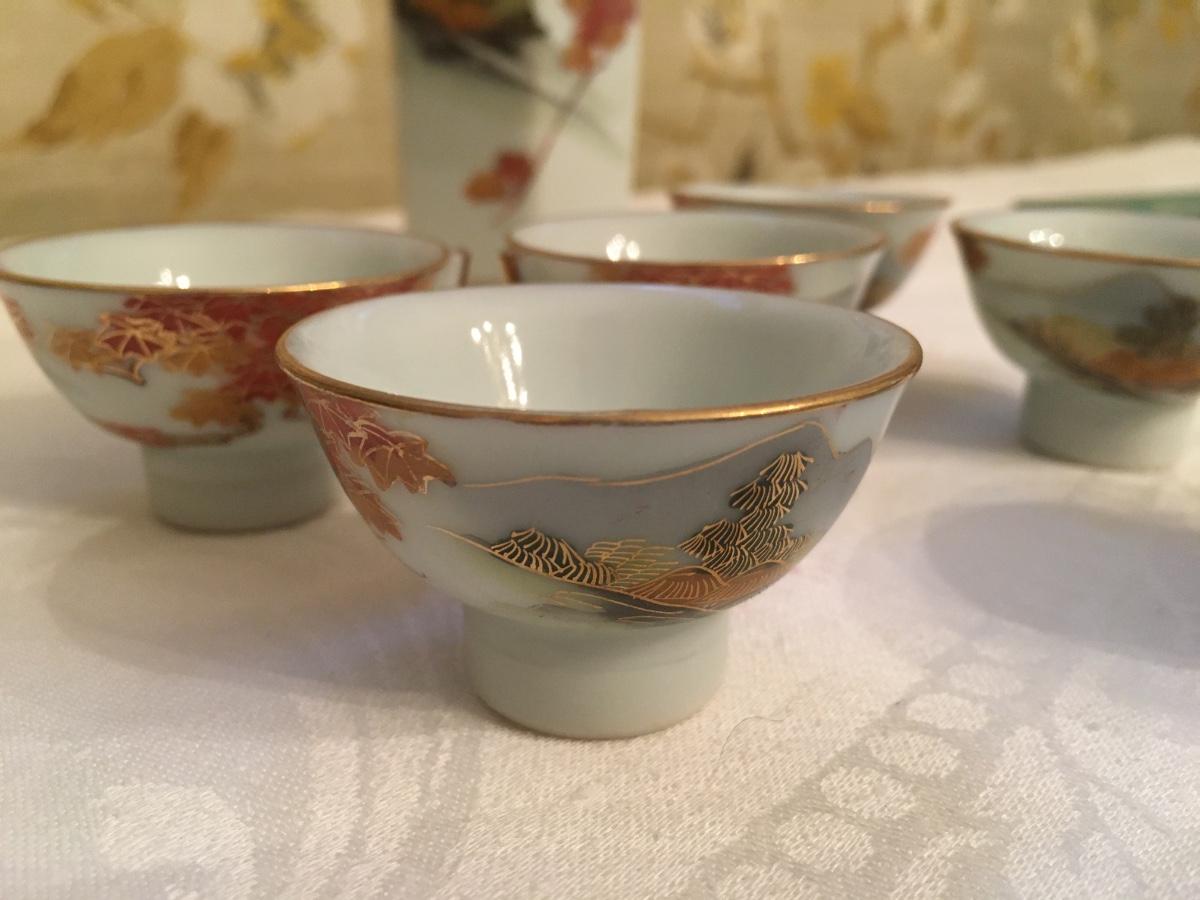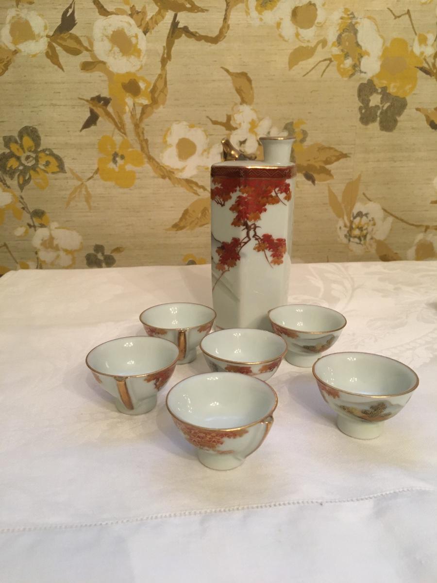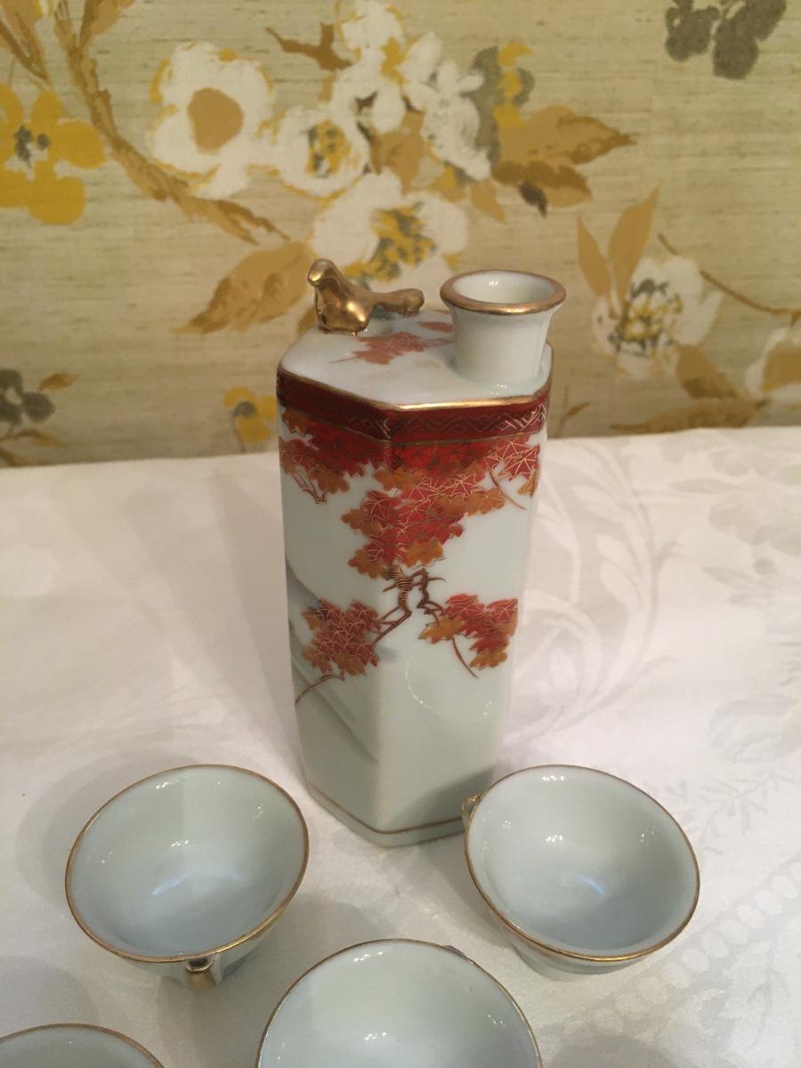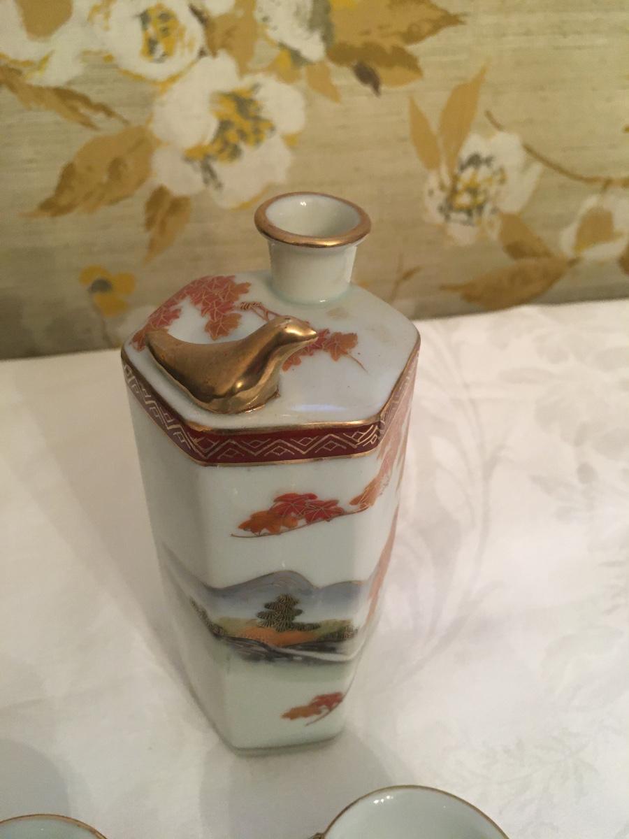 Small gold bird accent on vintage porcelain sake pourer with 6 cups.
