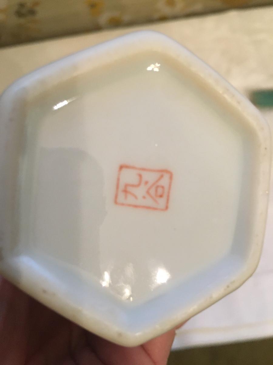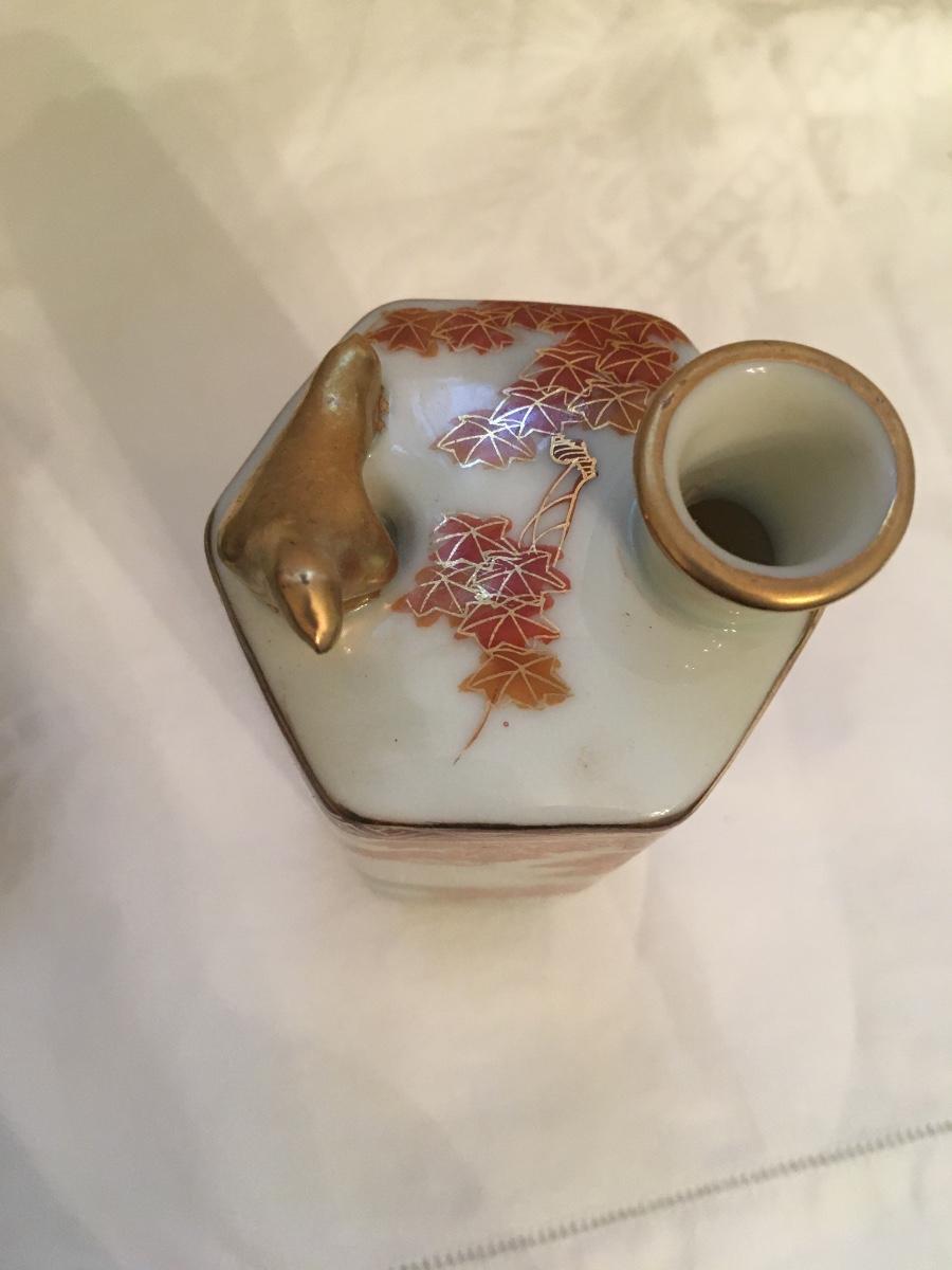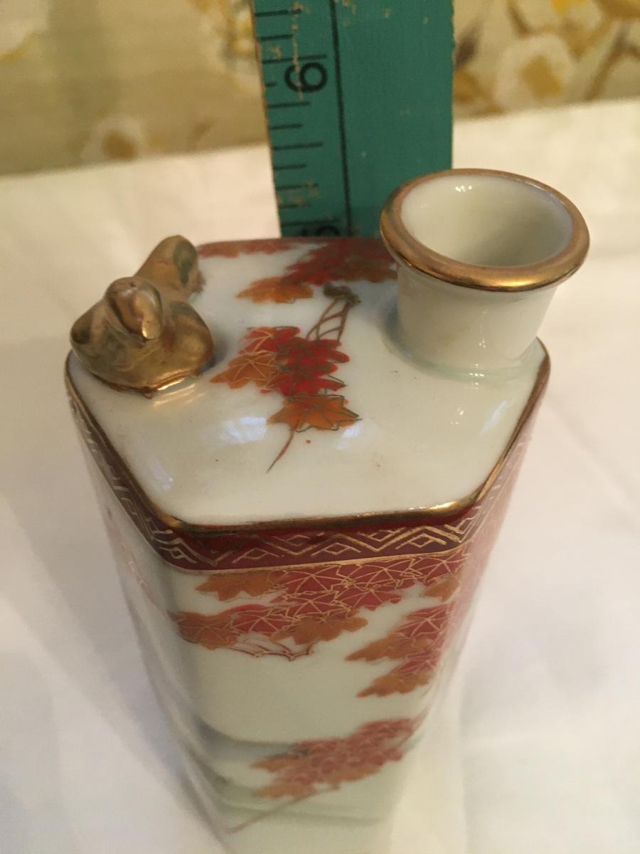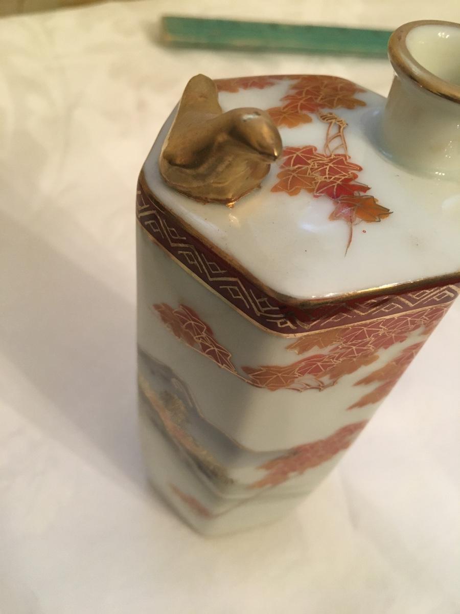 Small gold bird accent on vintage porcelain sake pourer with 6 cups.