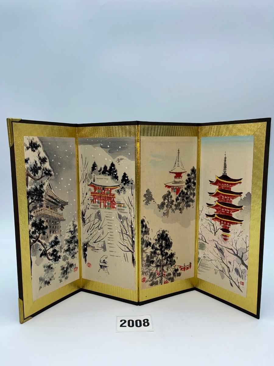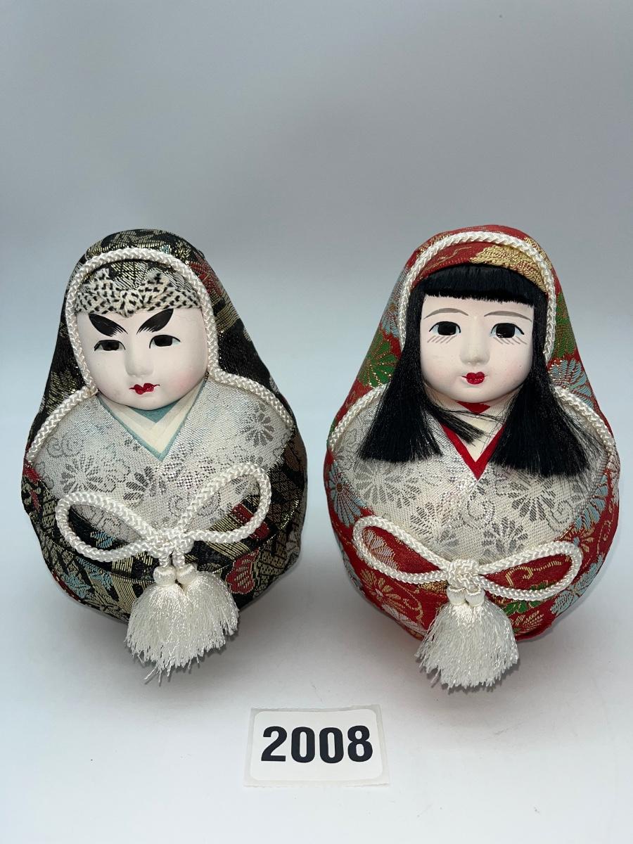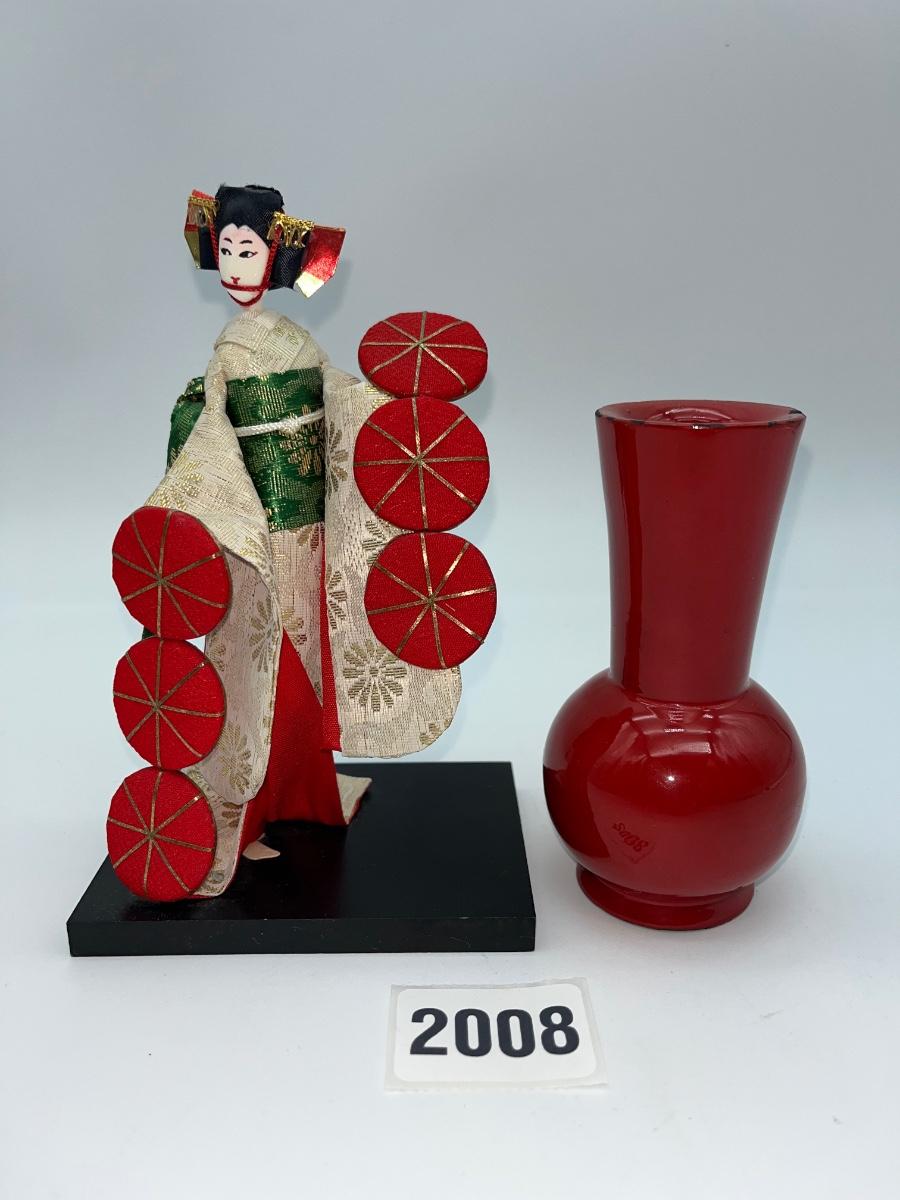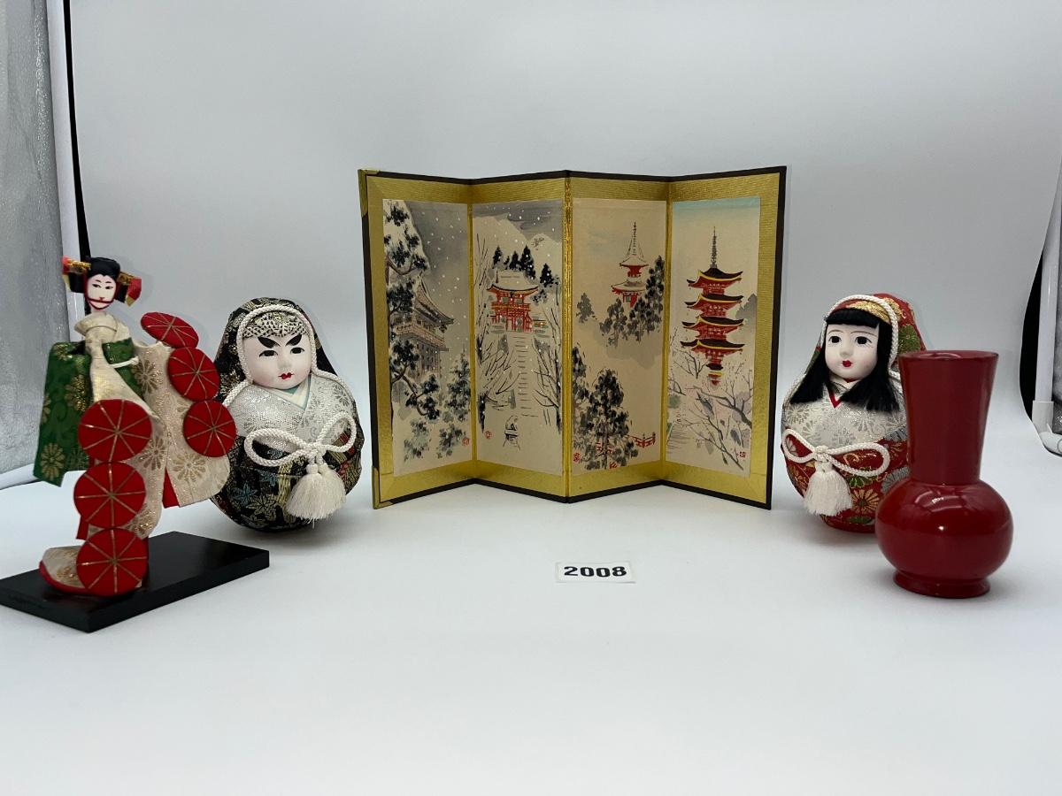 Vintage Japanese decor and 2 vintage Japanese wooden dolls. As shown.