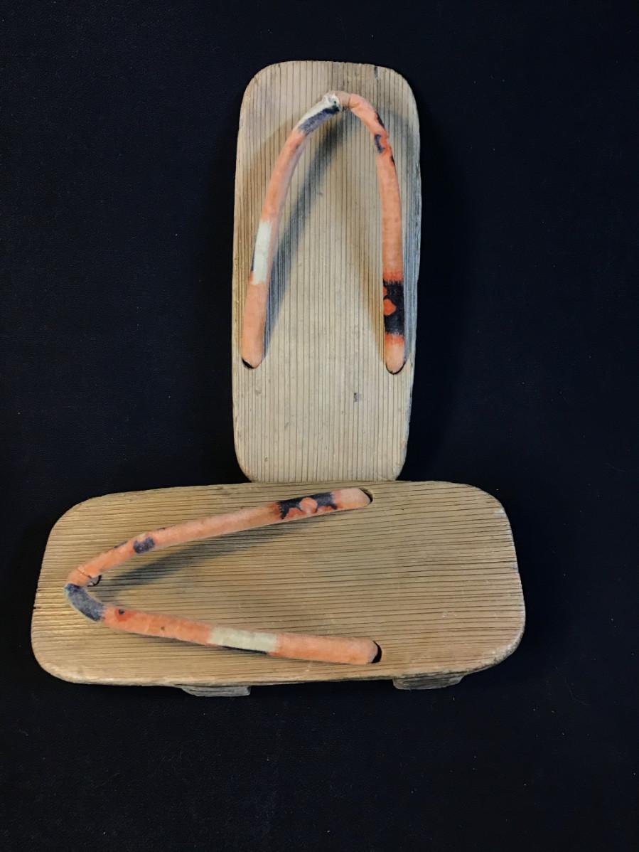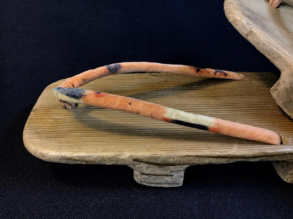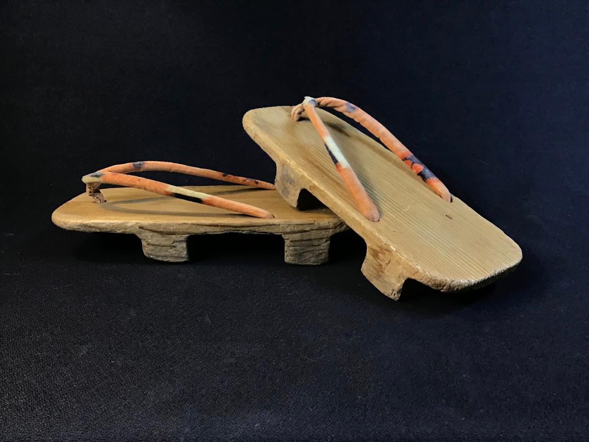 DESCRIPTION: This is a pair of vintage Japanese platform sandals, each shaped from a single block of wood, the tops of which have been drilled and fitted with cloth toe holds. This pair exhibits moderate wear.