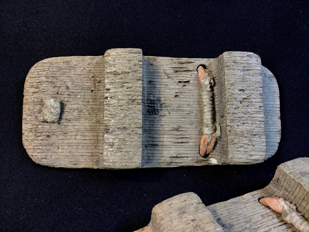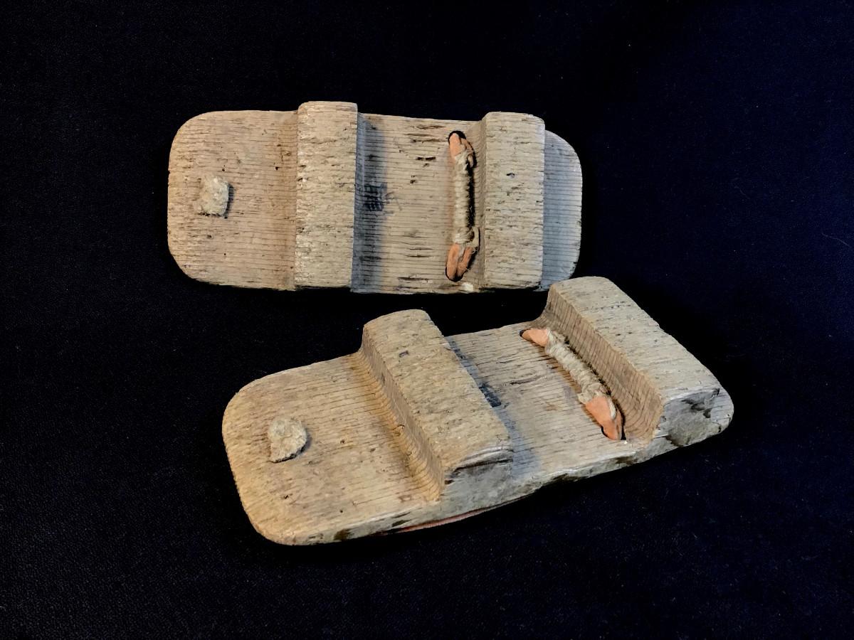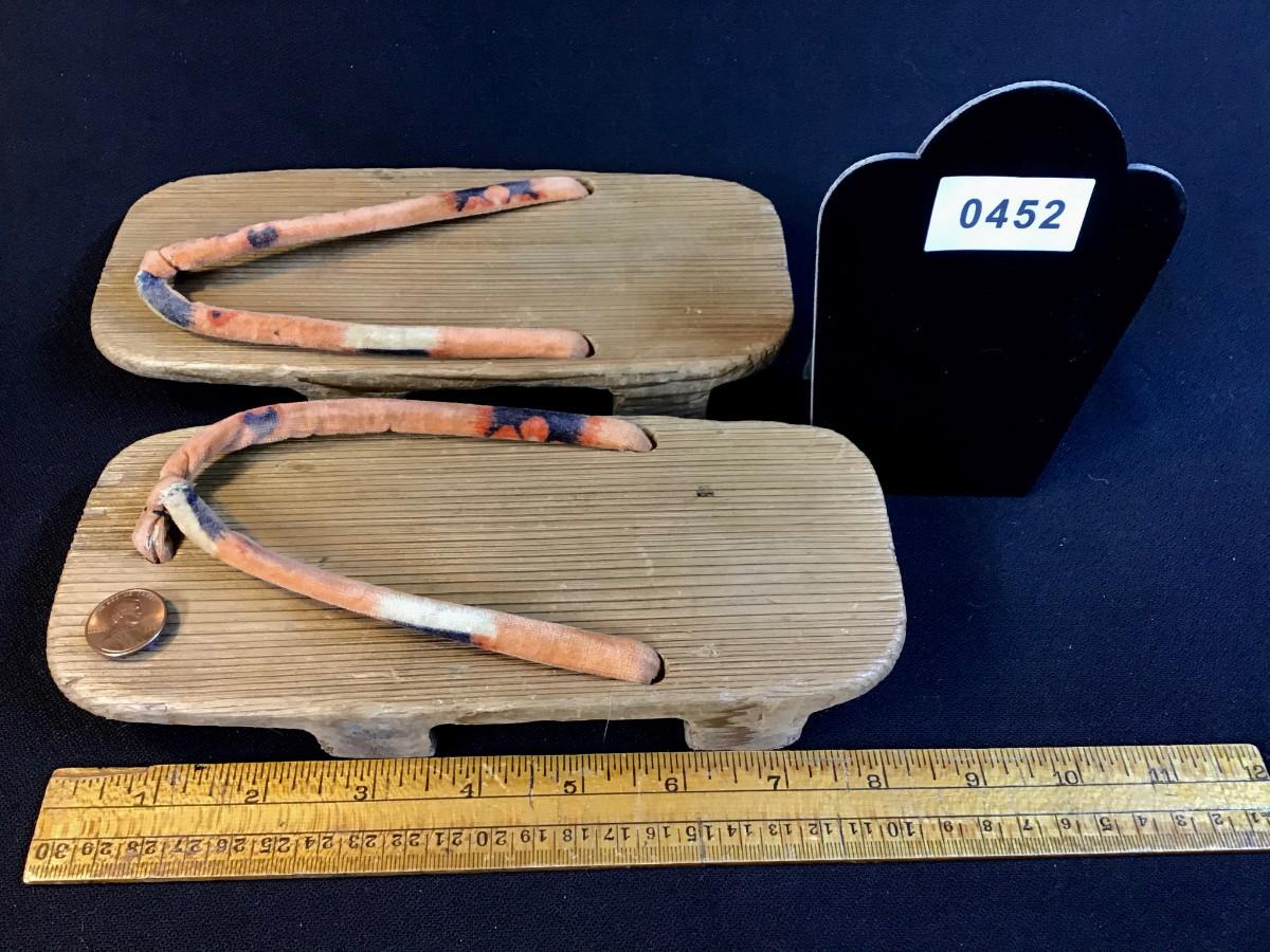 DESCRIPTION: This is a pair of vintage Japanese platform sandals, each shaped from a single block of wood, the tops of which have been drilled and fitted with cloth toe holds. This pair exhibits moderate wear.