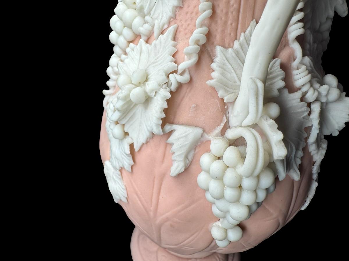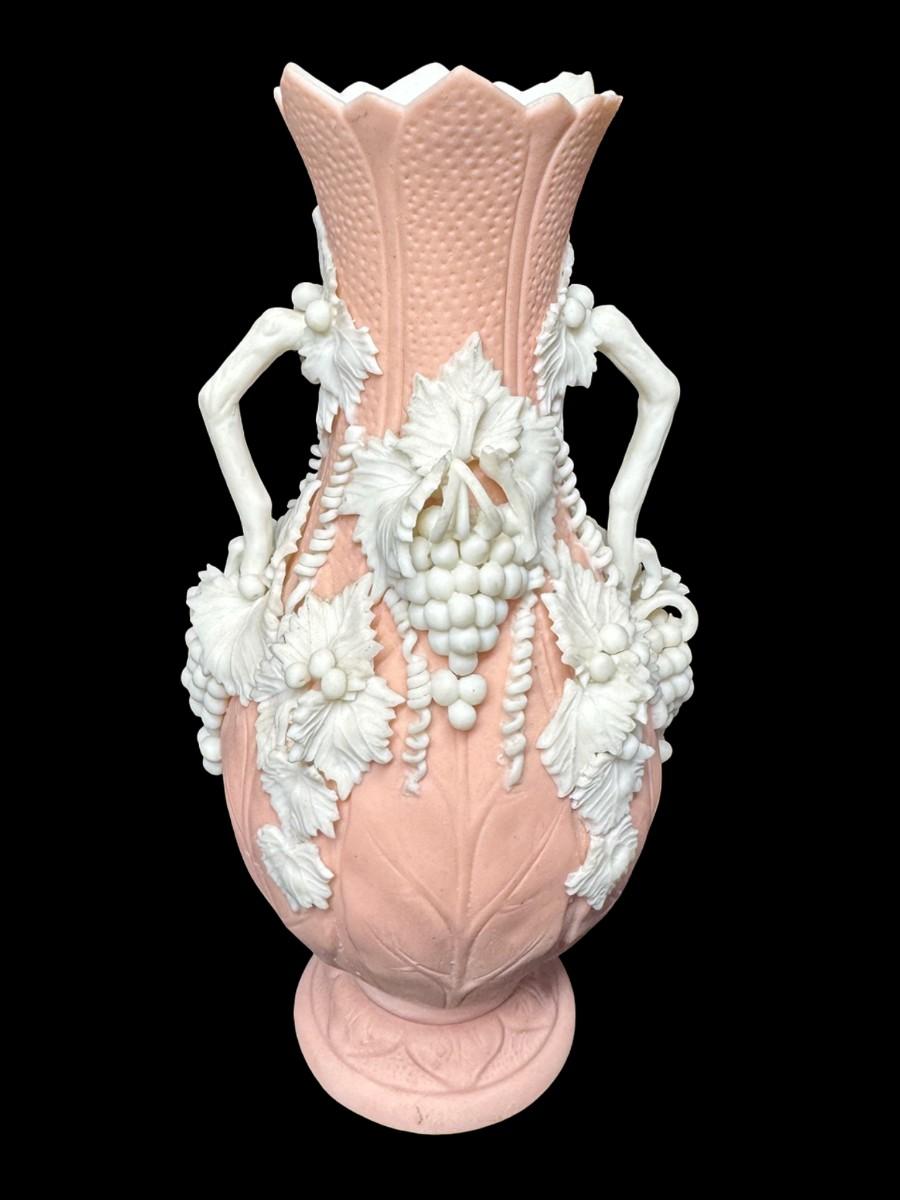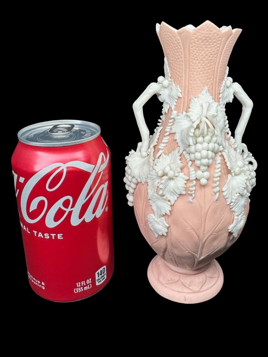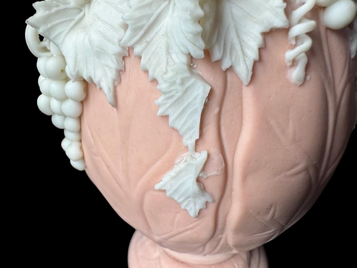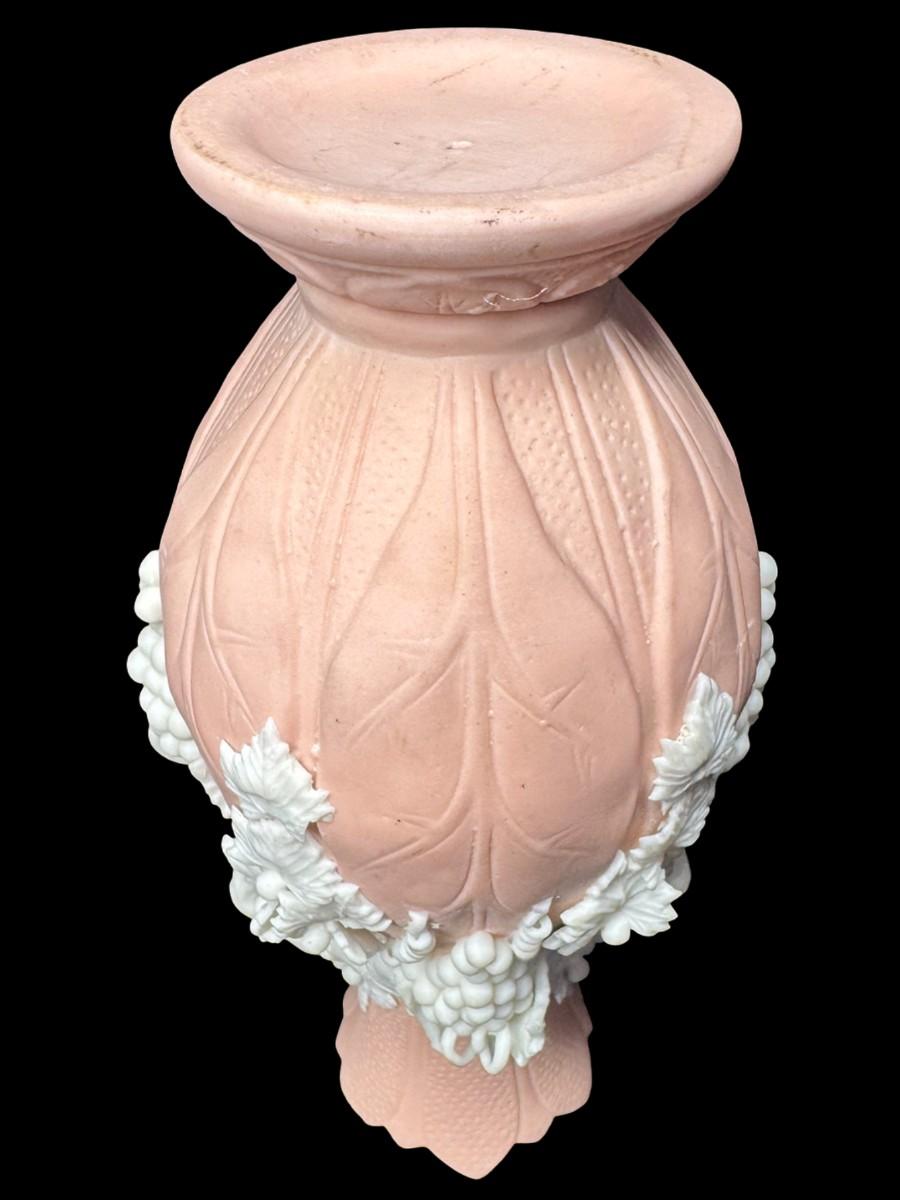 Jasperware is a fine, unglazed stoneware known for its matte finish and high relief white accents. This piece is possibly Victorian, made by Bennington. There is one small chip on the crown, and some leaves are broken. Measurement: 7.5”H x 3.5”W. [BK]