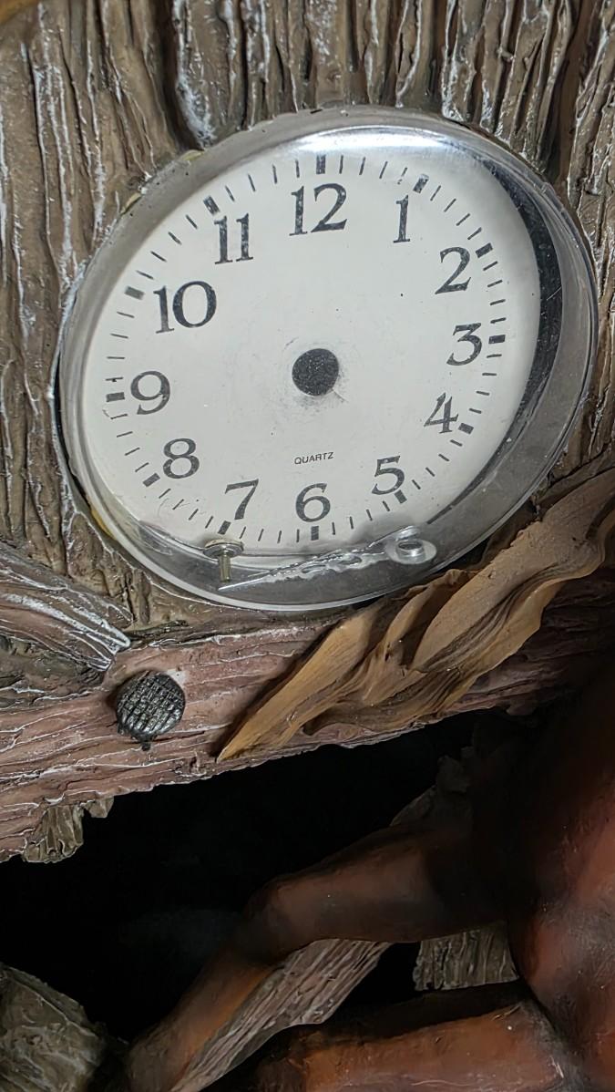 Crafted in textured resin and mounted on a rich wooden base, this mid-to-late 20th century design blends natural tones of chestnut brown, sand, and moss with a lifelike attention to muscle and detail. The embedded quartz clock, framed by faux wood and accented with soft metallic trim, still ticks with vintage charm — though its hands require a simple repair to return it fully to working glory.
