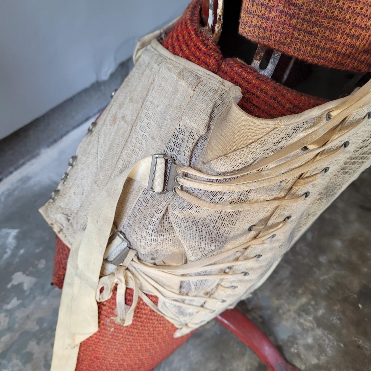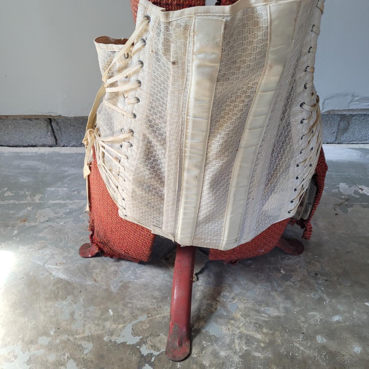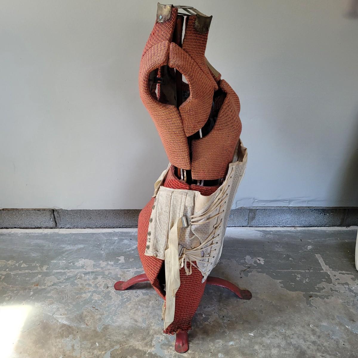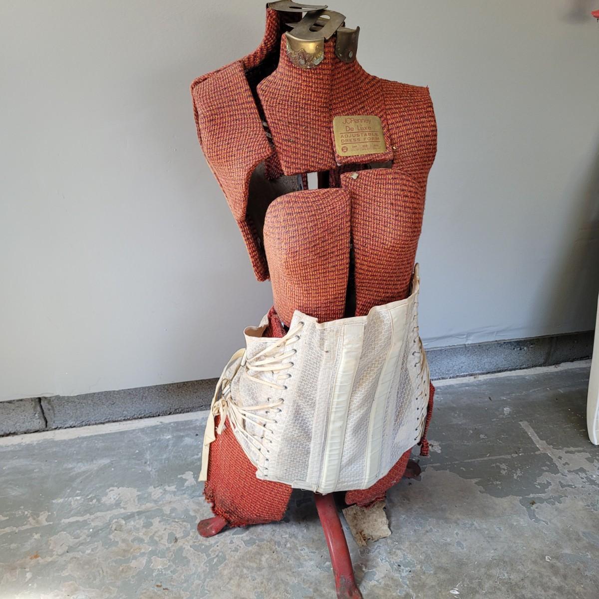 This lot includes one JC Penny brand dress form and corset. The form is made from metal, wood, and fabric. It is adjustable but may not function as it once did. The form stands on a metal rack and measures 20" x 20" x 36"H. The label reads JC Penny De Luxe Adjustable Dress Form size Jr. with measurements. The corset is white and has some wear and tear. It appears as if this piece was used as a decoration. Shipping available. Shipping can be costly. We suggest contacting our preferred local shipping provider, Postage Express, with dimensions and getting an estimate before bidding: (828) 255-9250 or email shipping@postageexpressnc.com