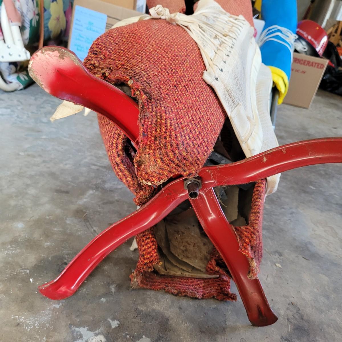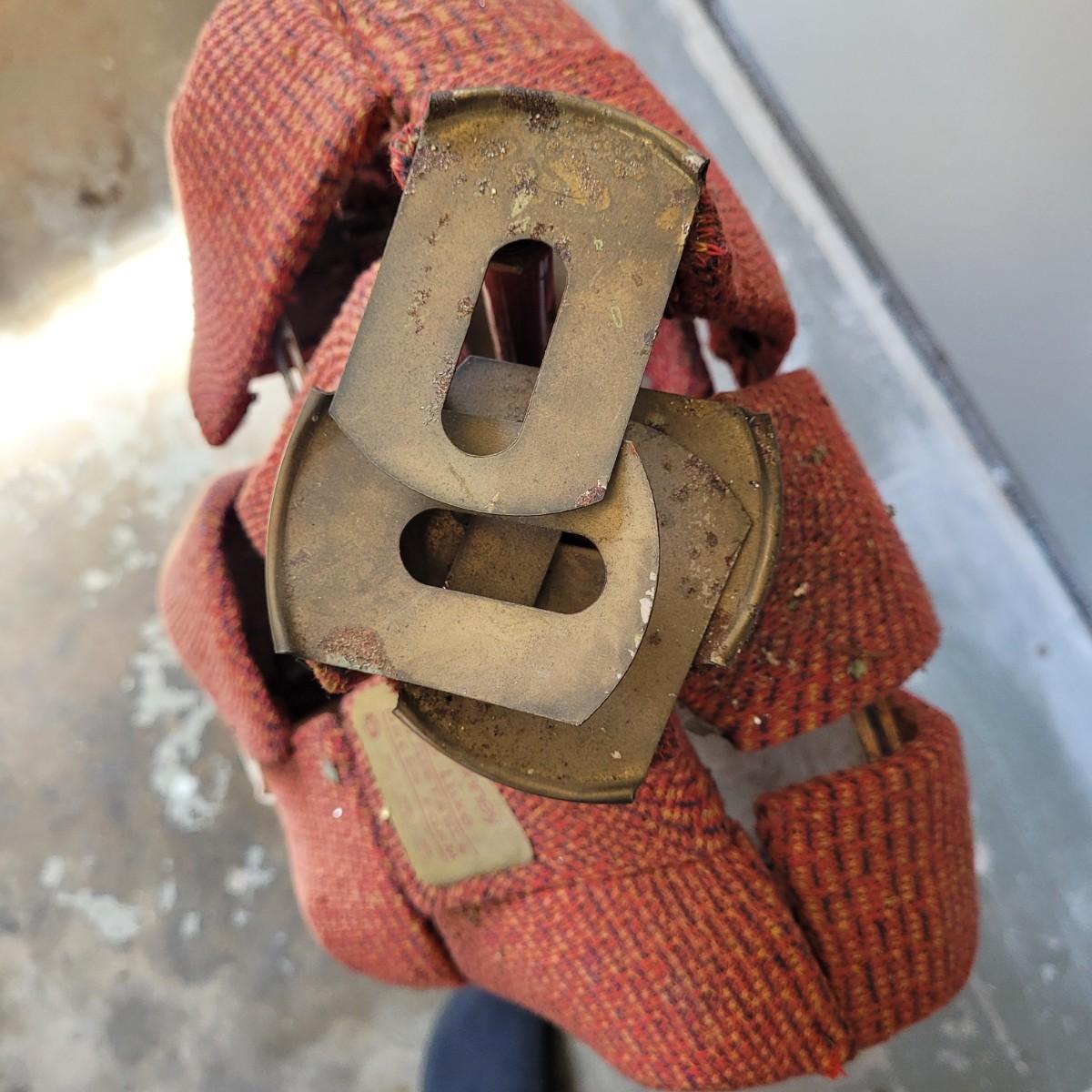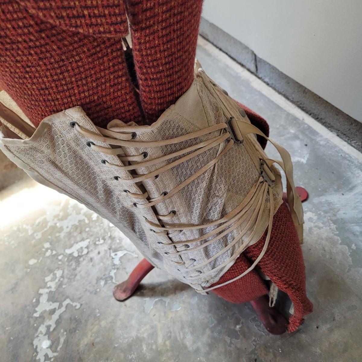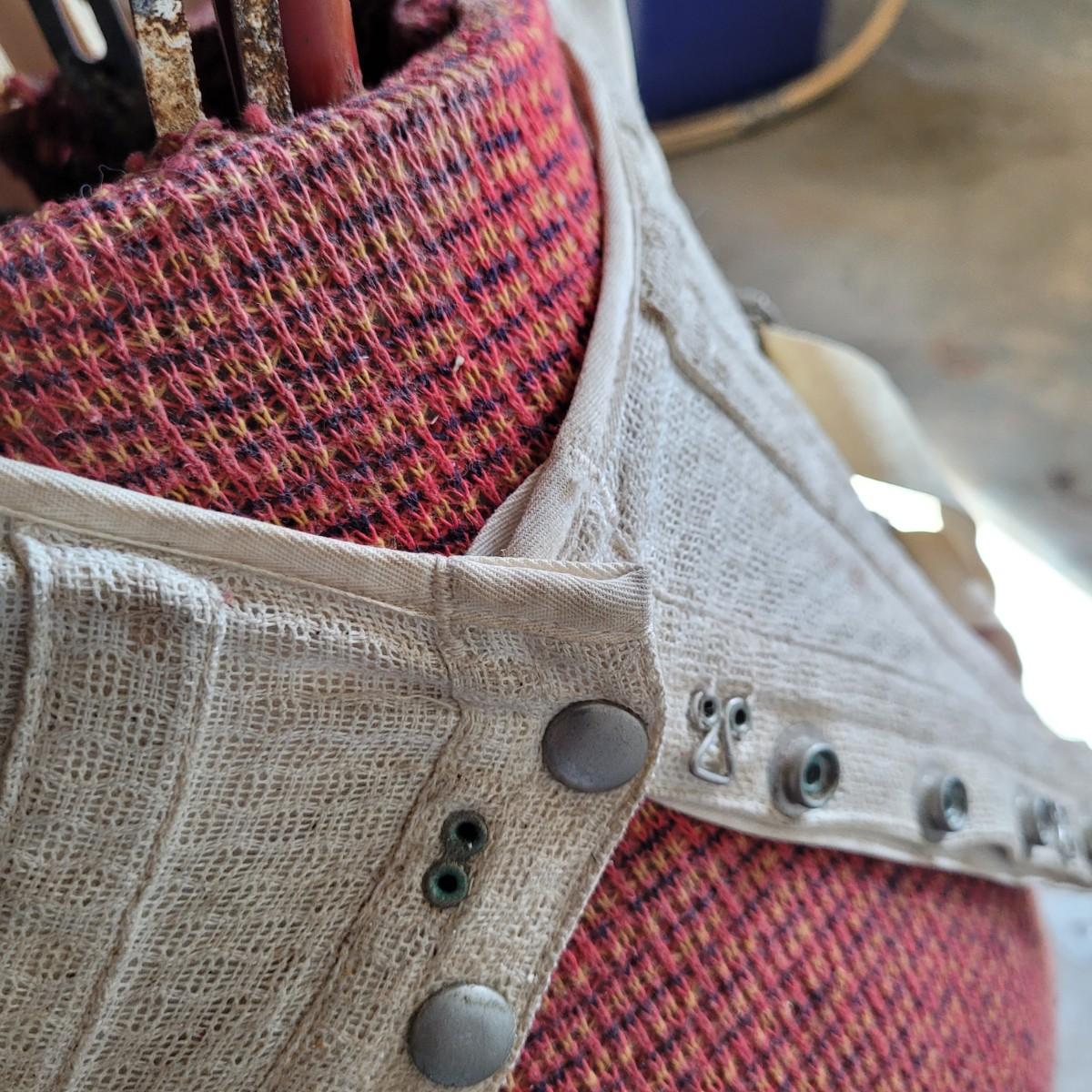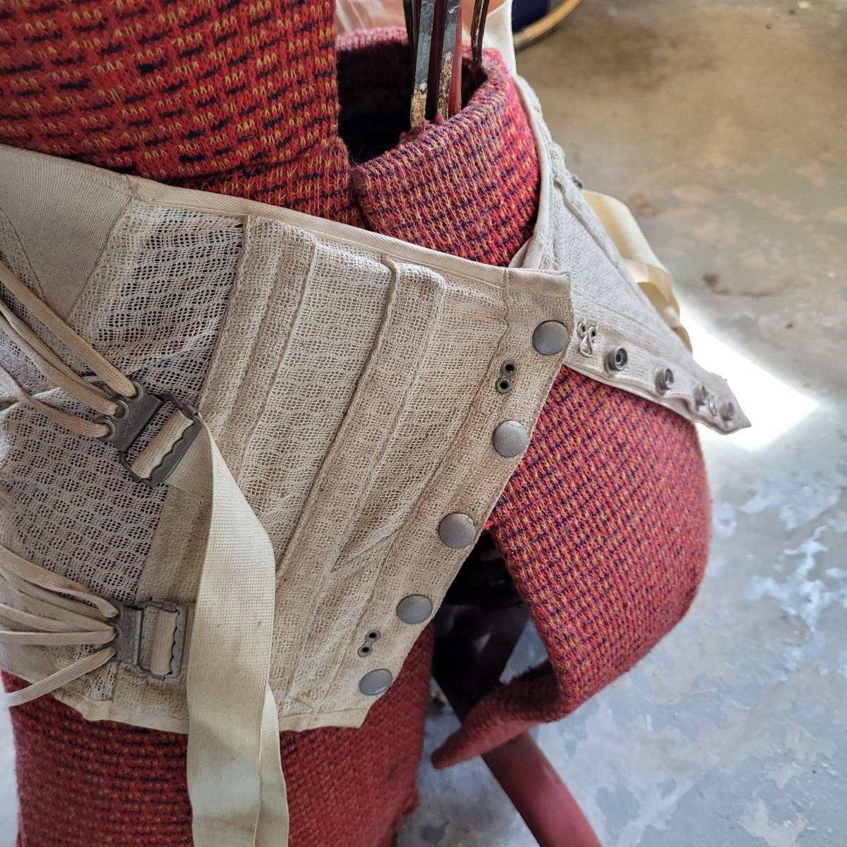 This lot includes one JC Penny brand dress form and corset. The form is made from metal, wood, and fabric. It is adjustable but may not function as it once did. The form stands on a metal rack and measures 20" x 20" x 36"H. The label reads JC Penny De Luxe Adjustable Dress Form size Jr. with measurements. The corset is white and has some wear and tear. It appears as if this piece was used as a decoration. Shipping available. Shipping can be costly. We suggest contacting our preferred local shipping provider, Postage Express, with dimensions and getting an estimate before bidding: (828) 255-9250 or email shipping@postageexpressnc.com