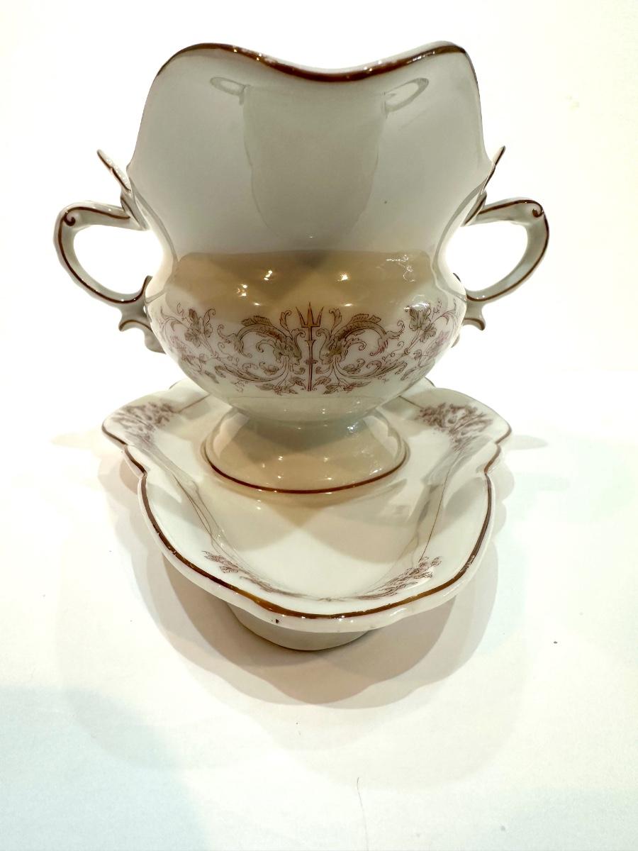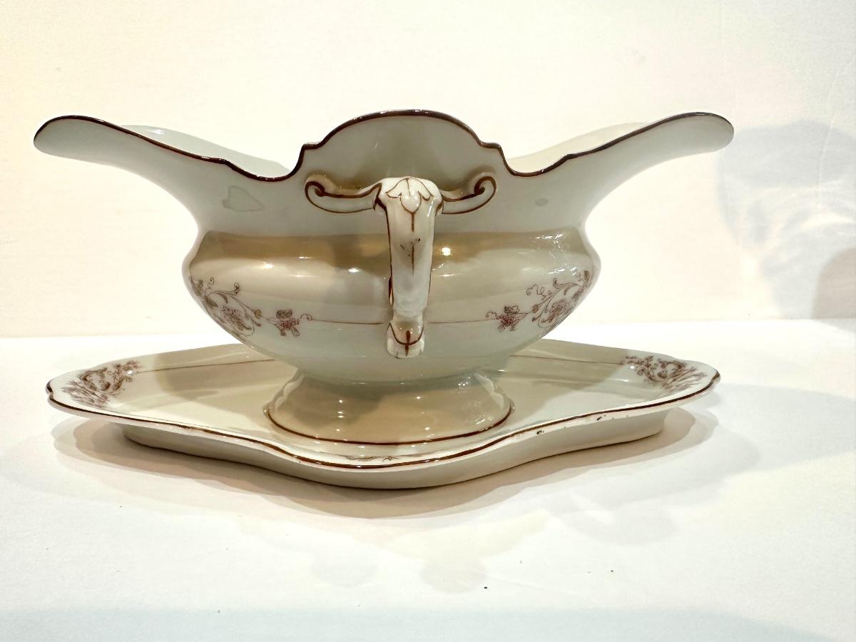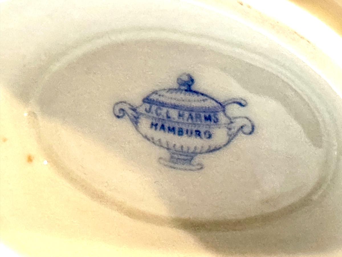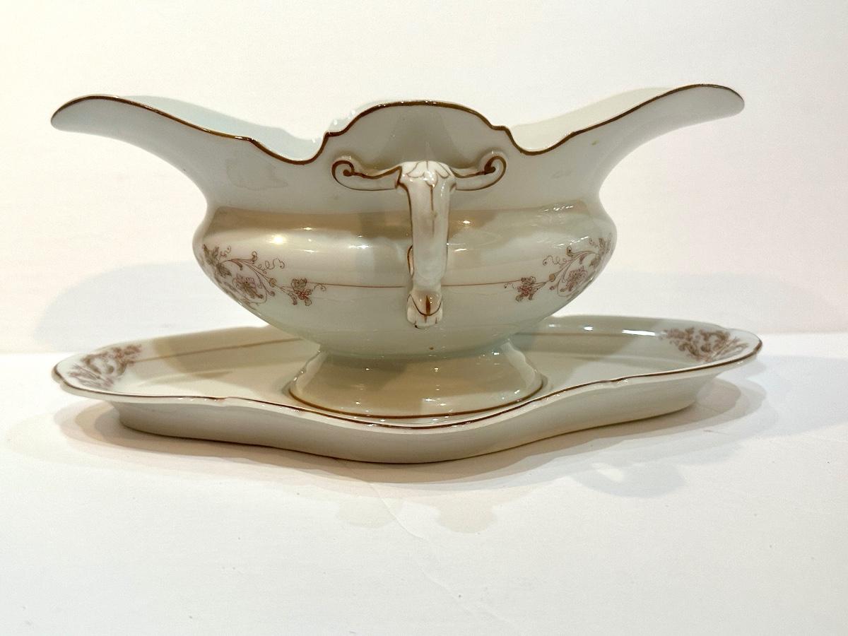 Delicately beautiful porcelain gravy boat with attached tray from Hamburg Germany.