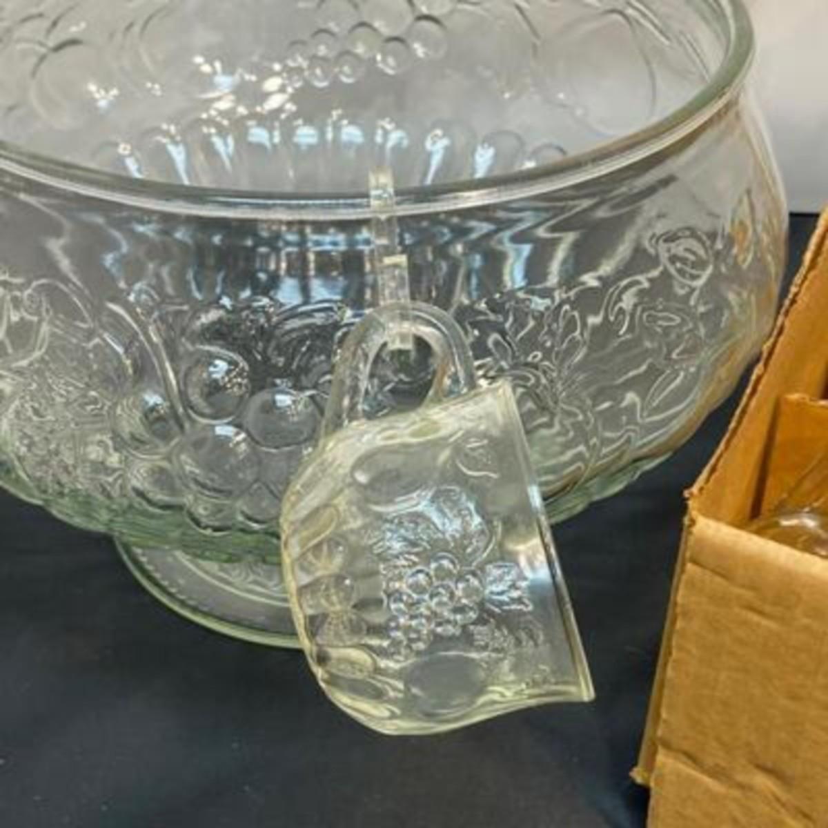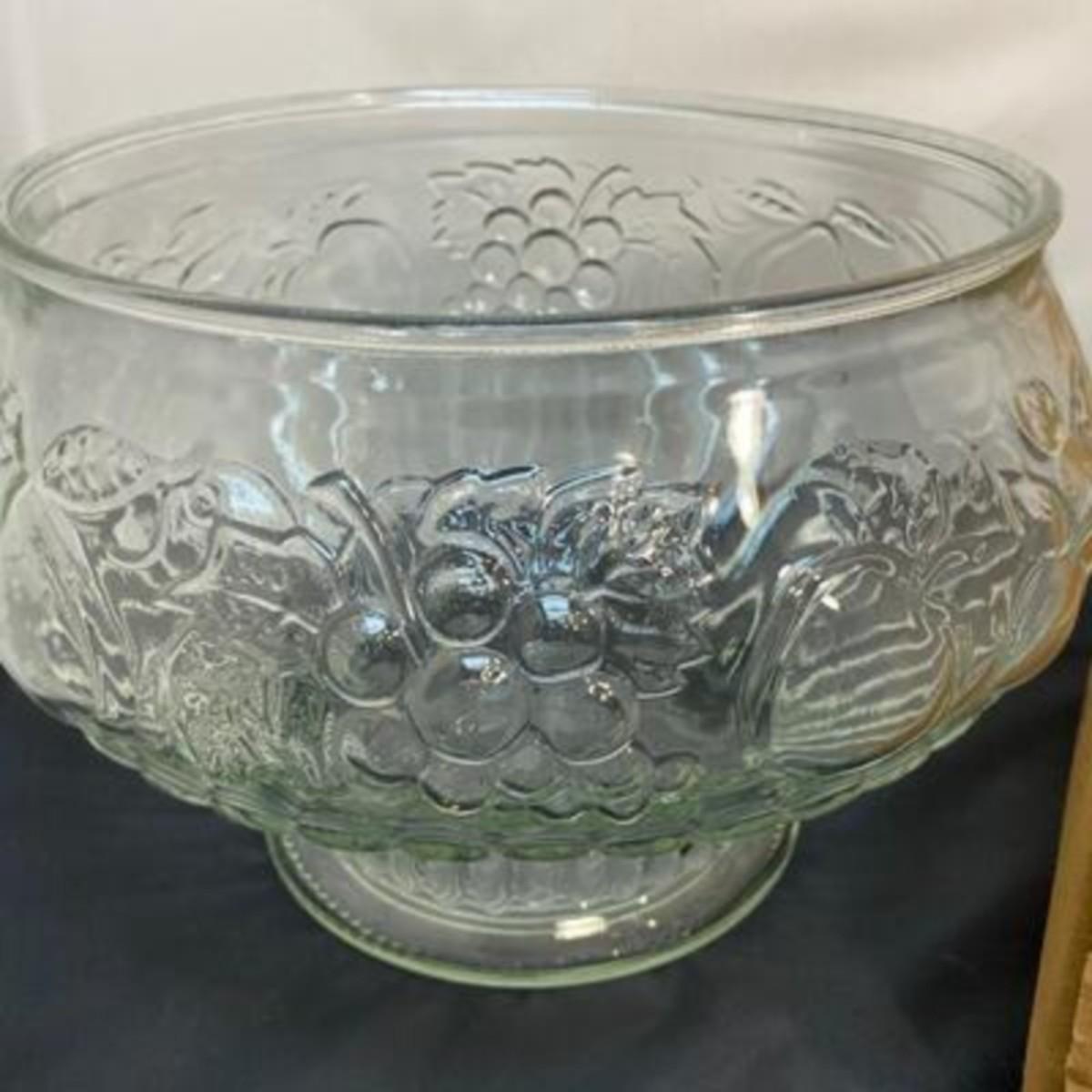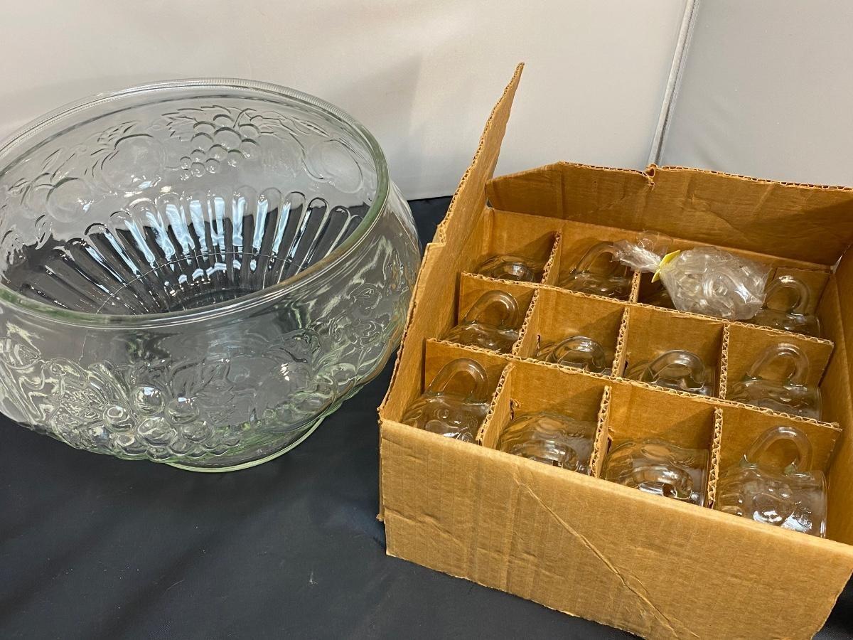 Vintage Jeanette Glass punch bowl with cups. Comes in original box. 16 cups included. No ladle and only a handful of cup hooks. Embossed fruit pattern on glass.
