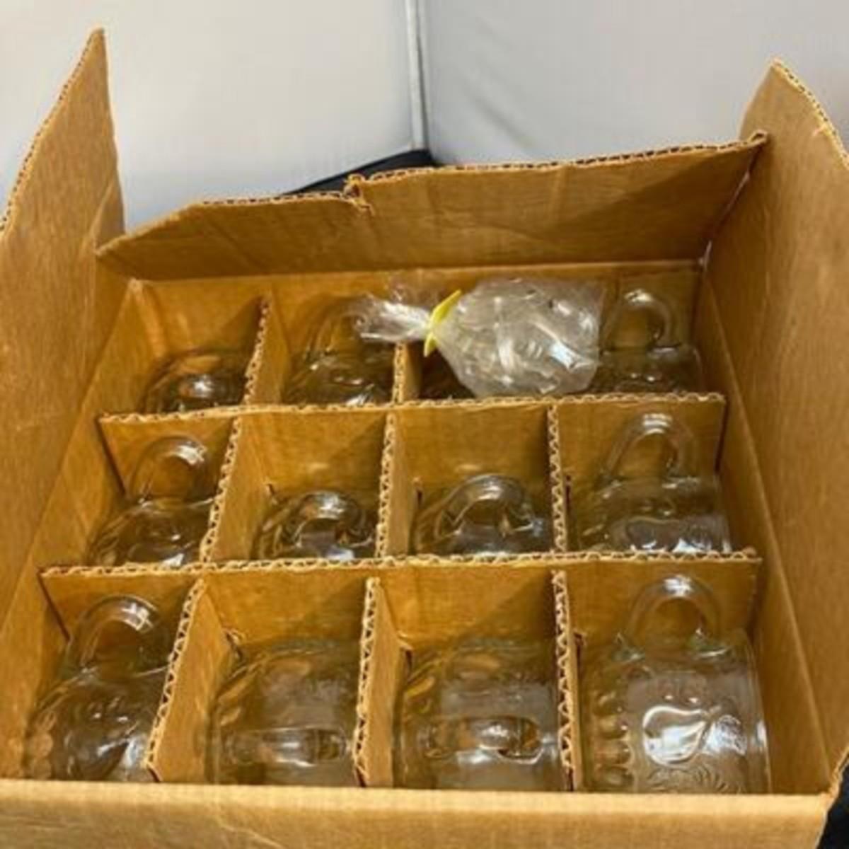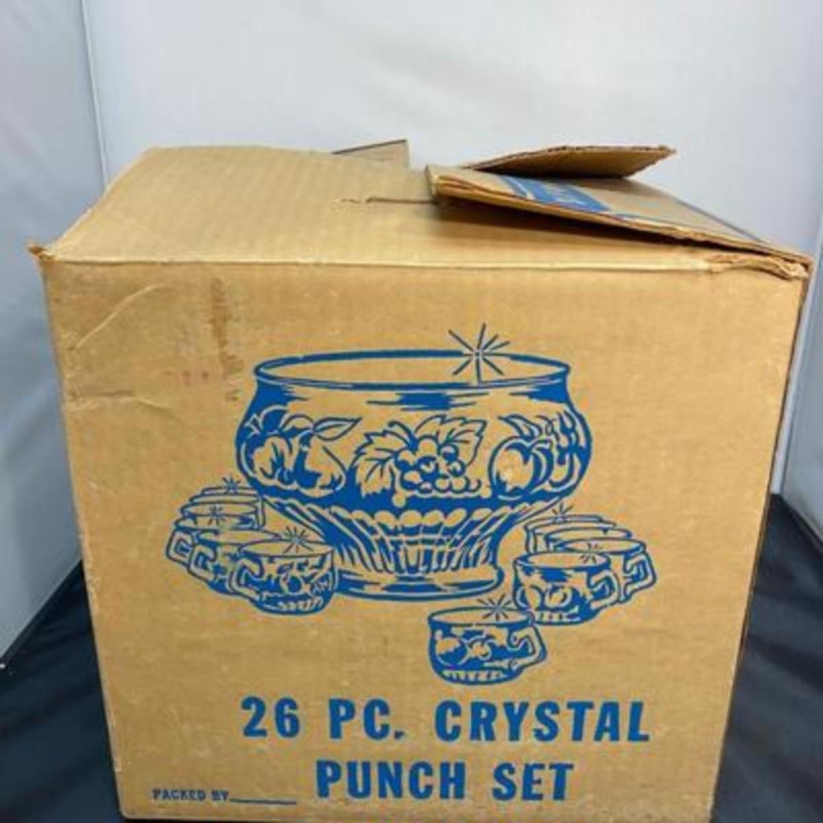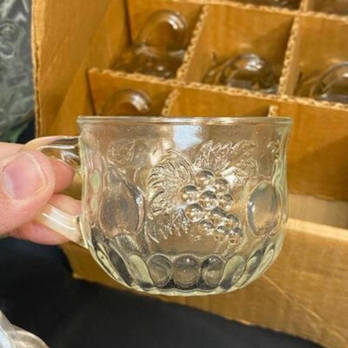 Vintage Jeanette Glass punch bowl with cups. Comes in original box. 16 cups included. No ladle and only a handful of cup hooks. Embossed fruit pattern on glass.