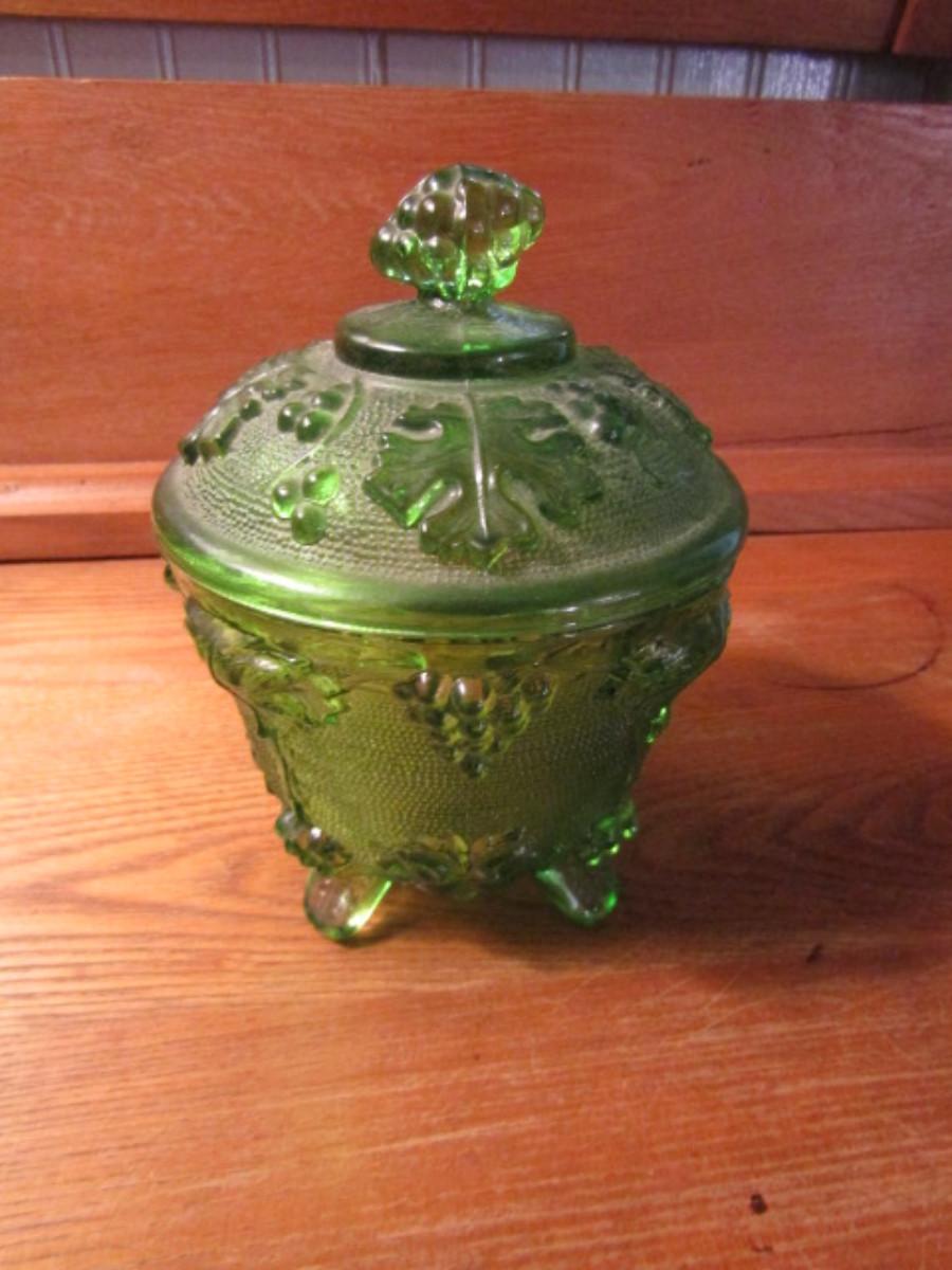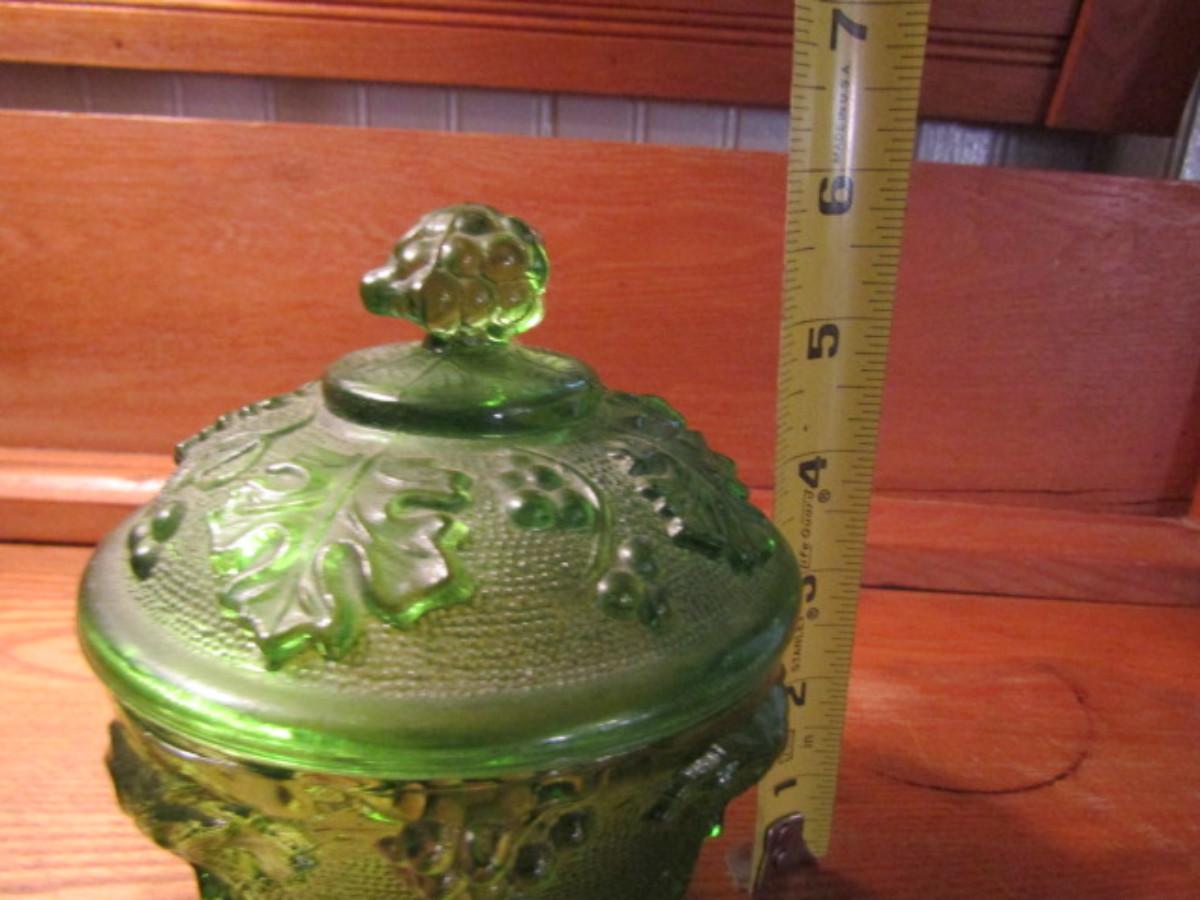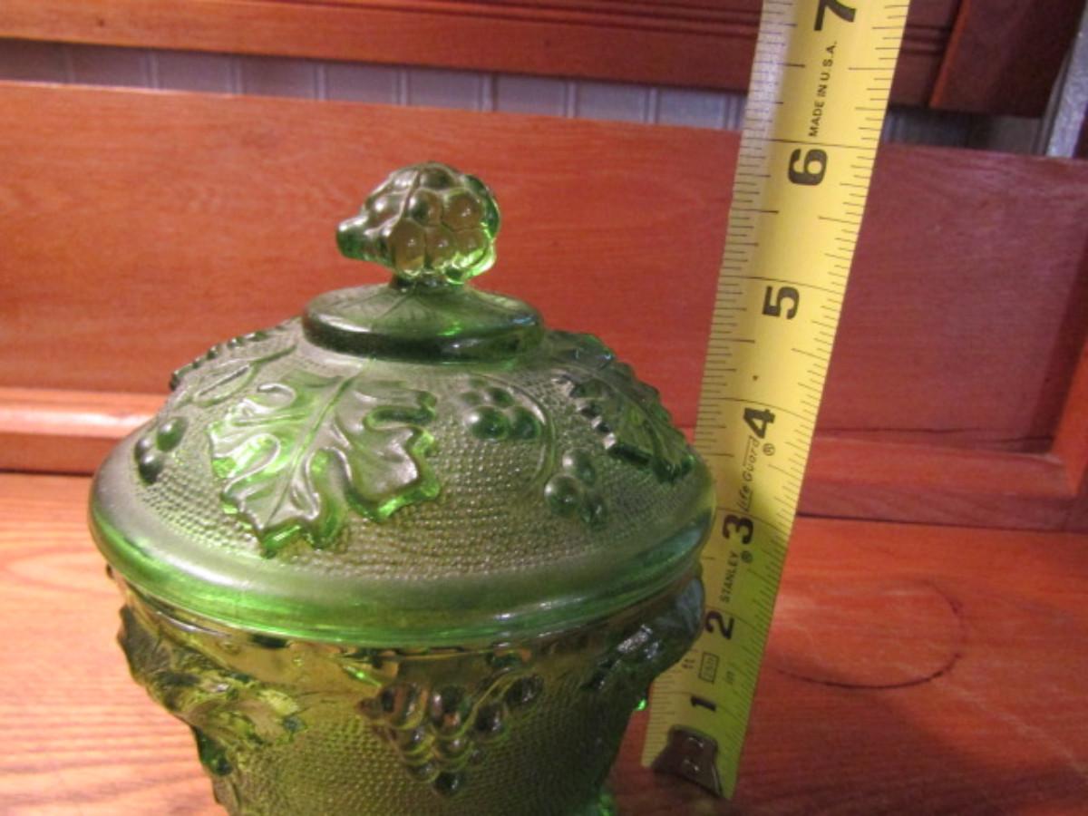 Vintage Jeanette Green Four Footed Grape Leaf Glass Candy Dish With Lid