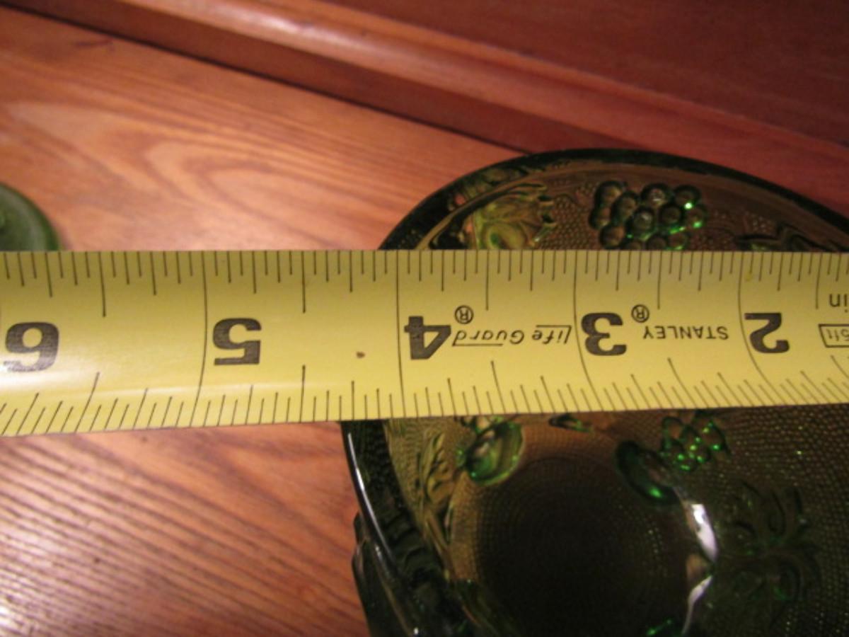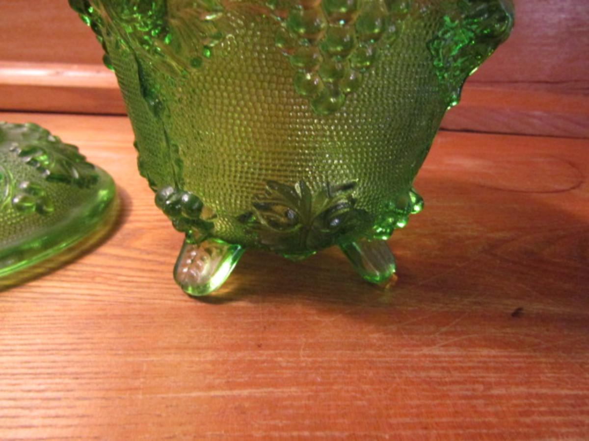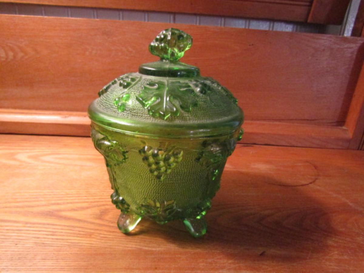Vintage Jeanette Green Four Footed Grape Leaf Glass Candy Dish With Lid