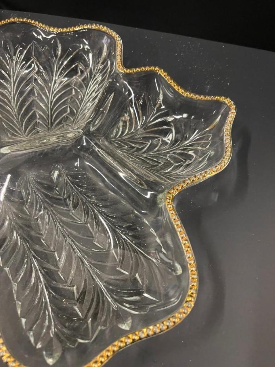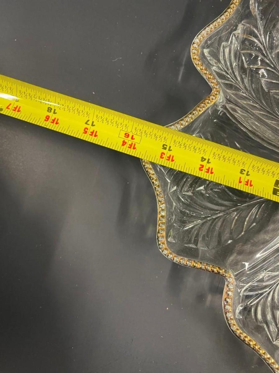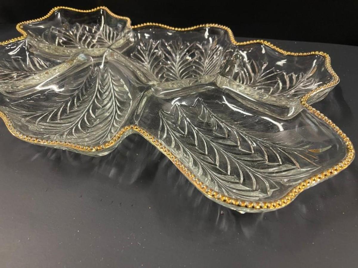Vintage Jeannette Glass Feathered Leaf Shaped Platter. Some wear to the beaded gold rim.