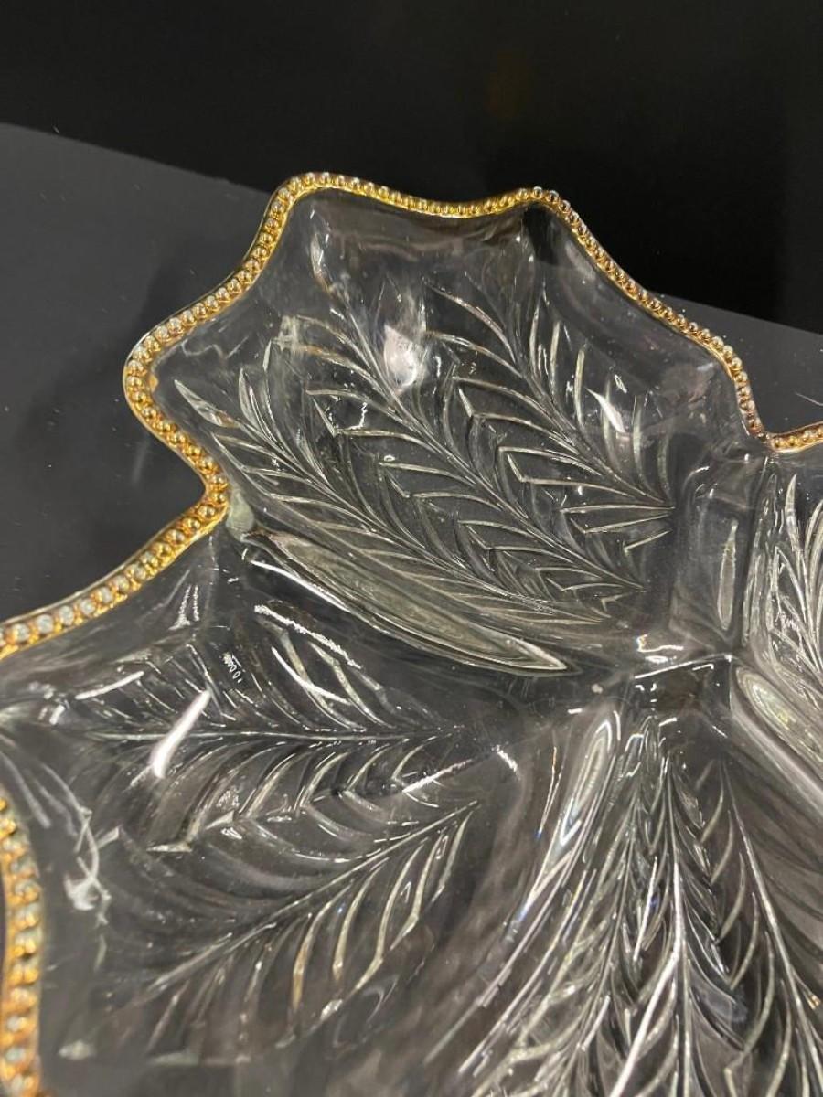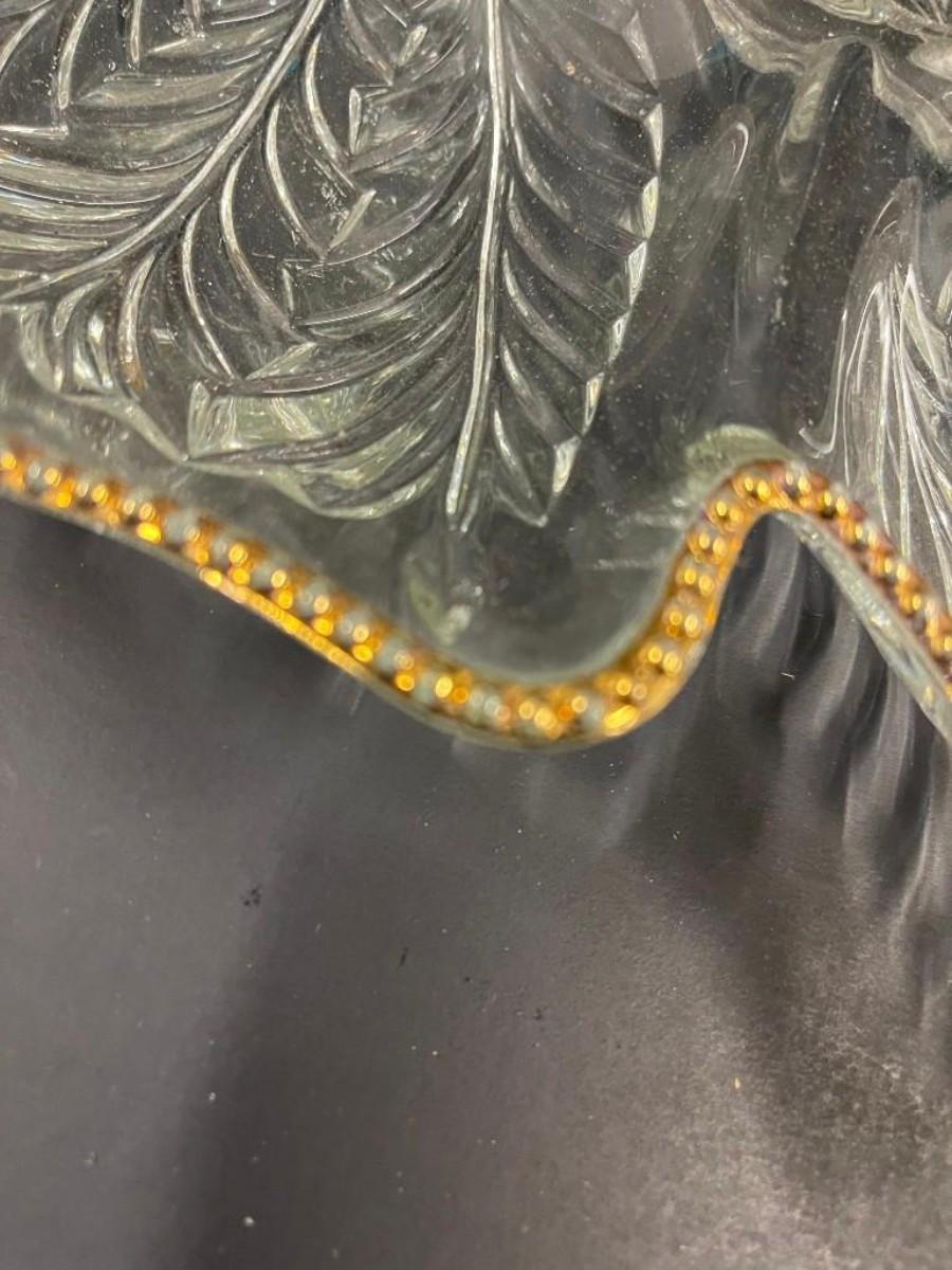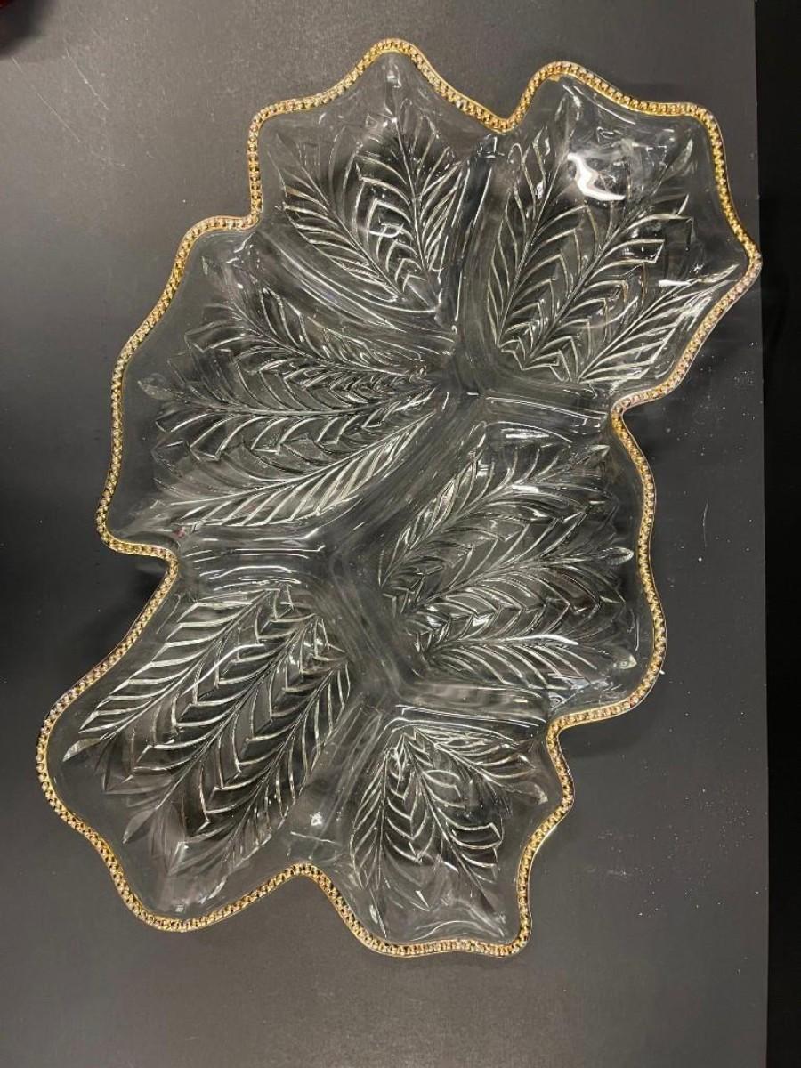 Vintage Jeannette Glass Feathered Leaf Shaped Platter. Some wear to the beaded gold rim.