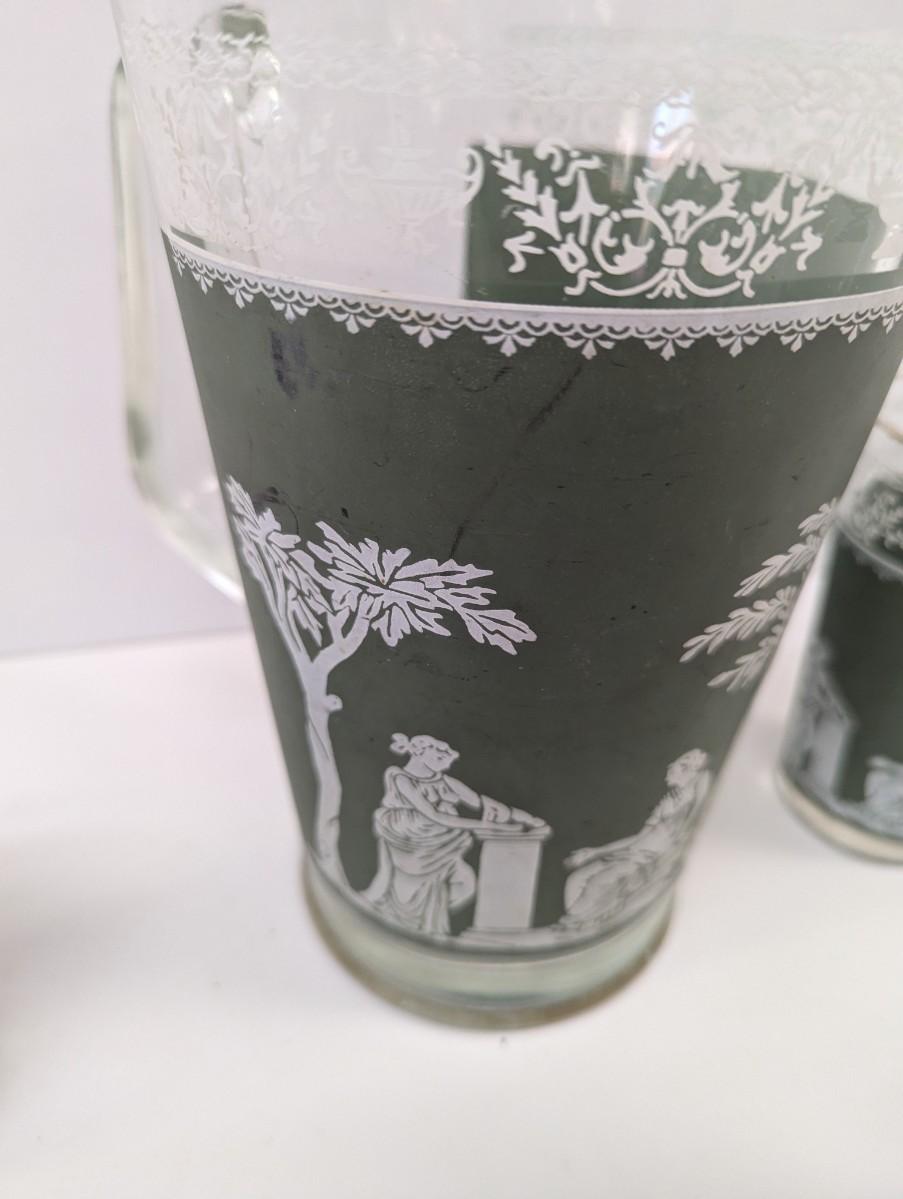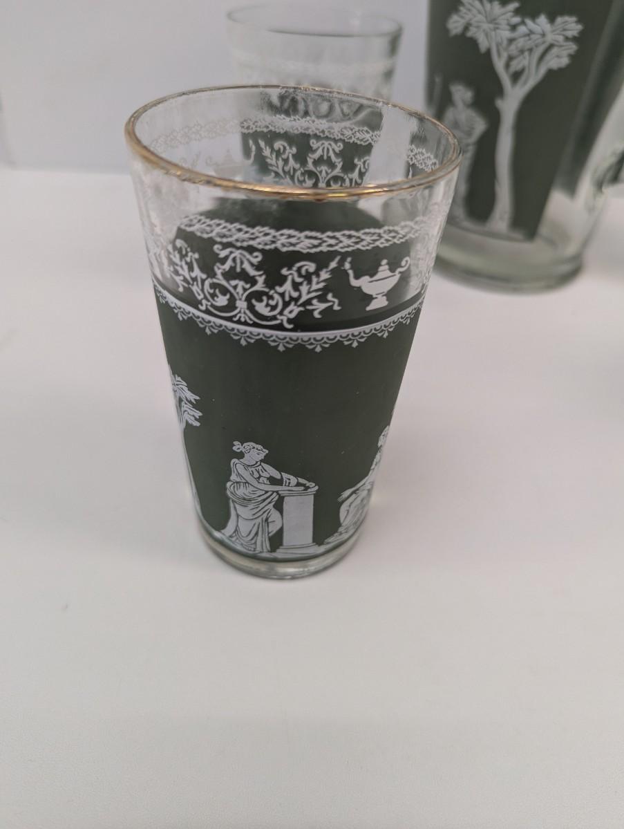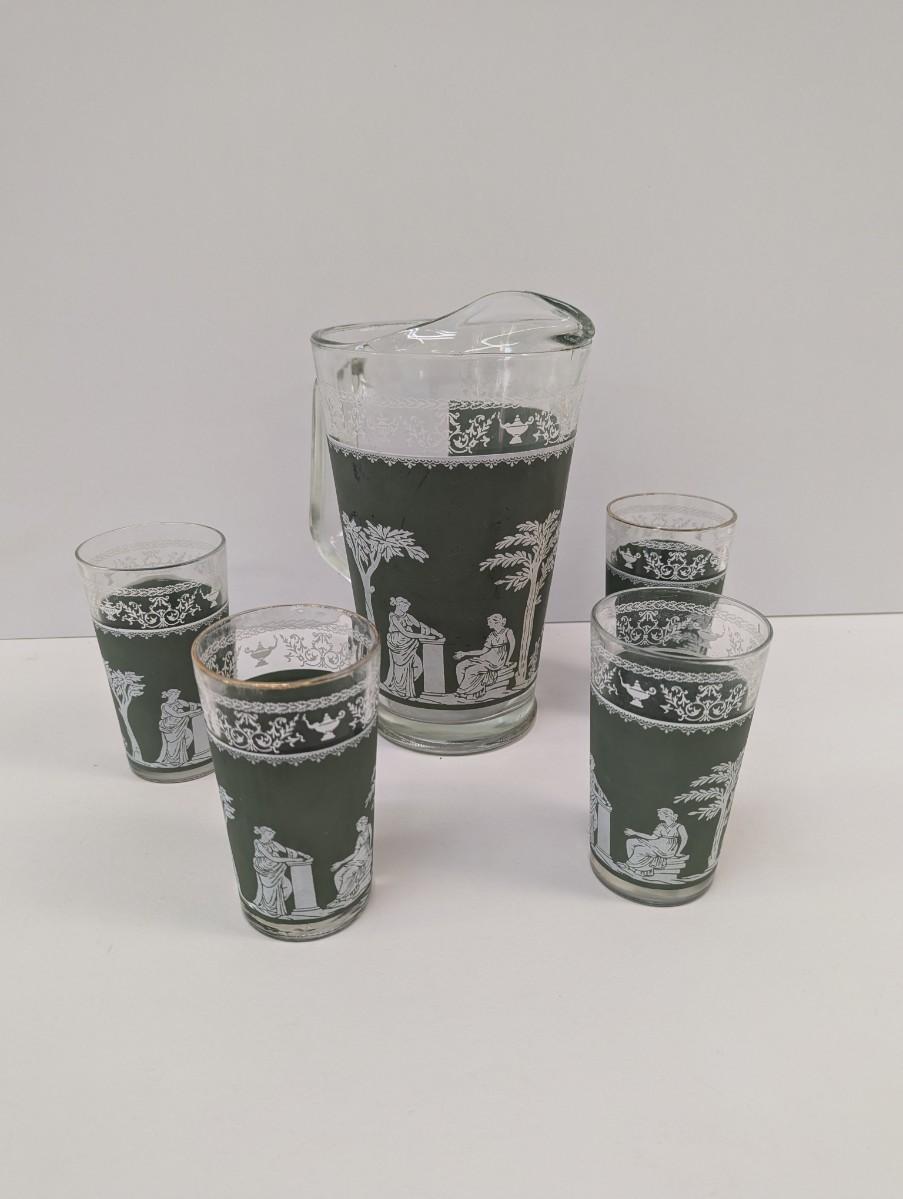 Vintage Jeannette Helenic Green Classic Wedgwood Pitcher & Juice Glasses