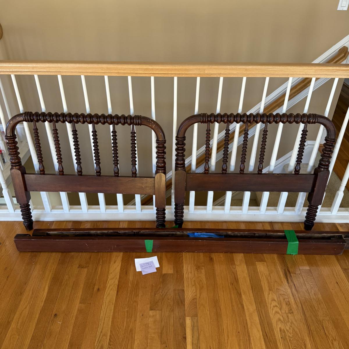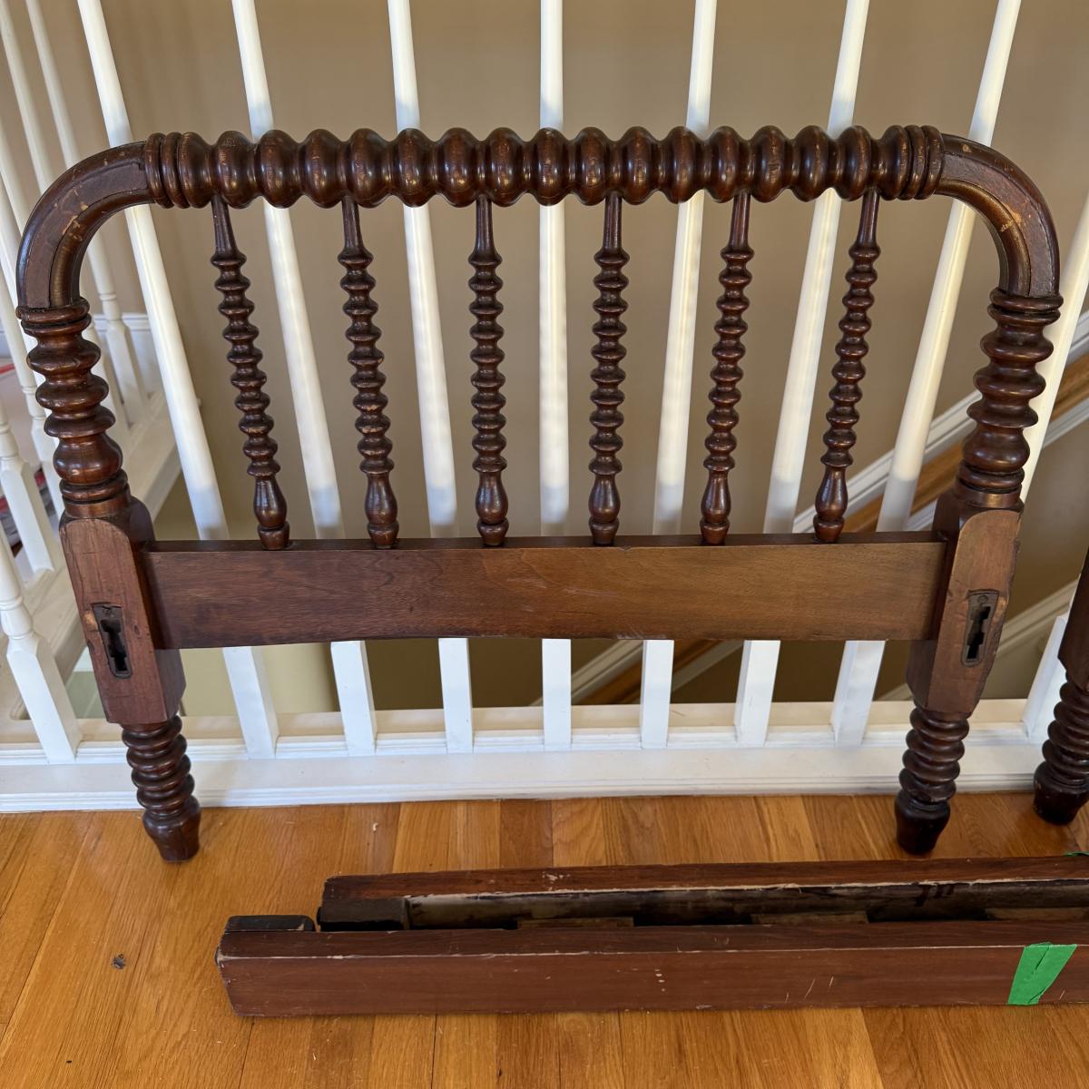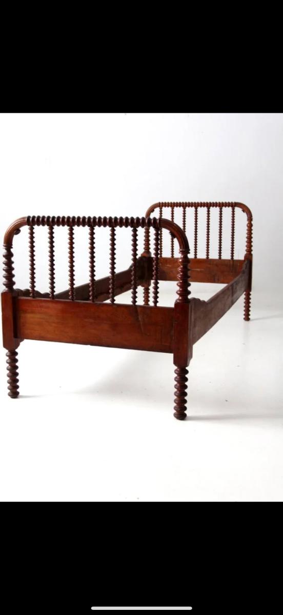 This lot contains a vintage Jenny Lind spool toddler bed. This precious bed features a dark wooden stain and spindles at the head and foot board. Unfortunately, one of the spindles is broken on one of the boards and therefore are some scuffs on the edges. The sizes slide into the head and foot board but this item does not come with the bed slats. Note, this item is already broken down the picture resembles what it would possibly look like when assembled.