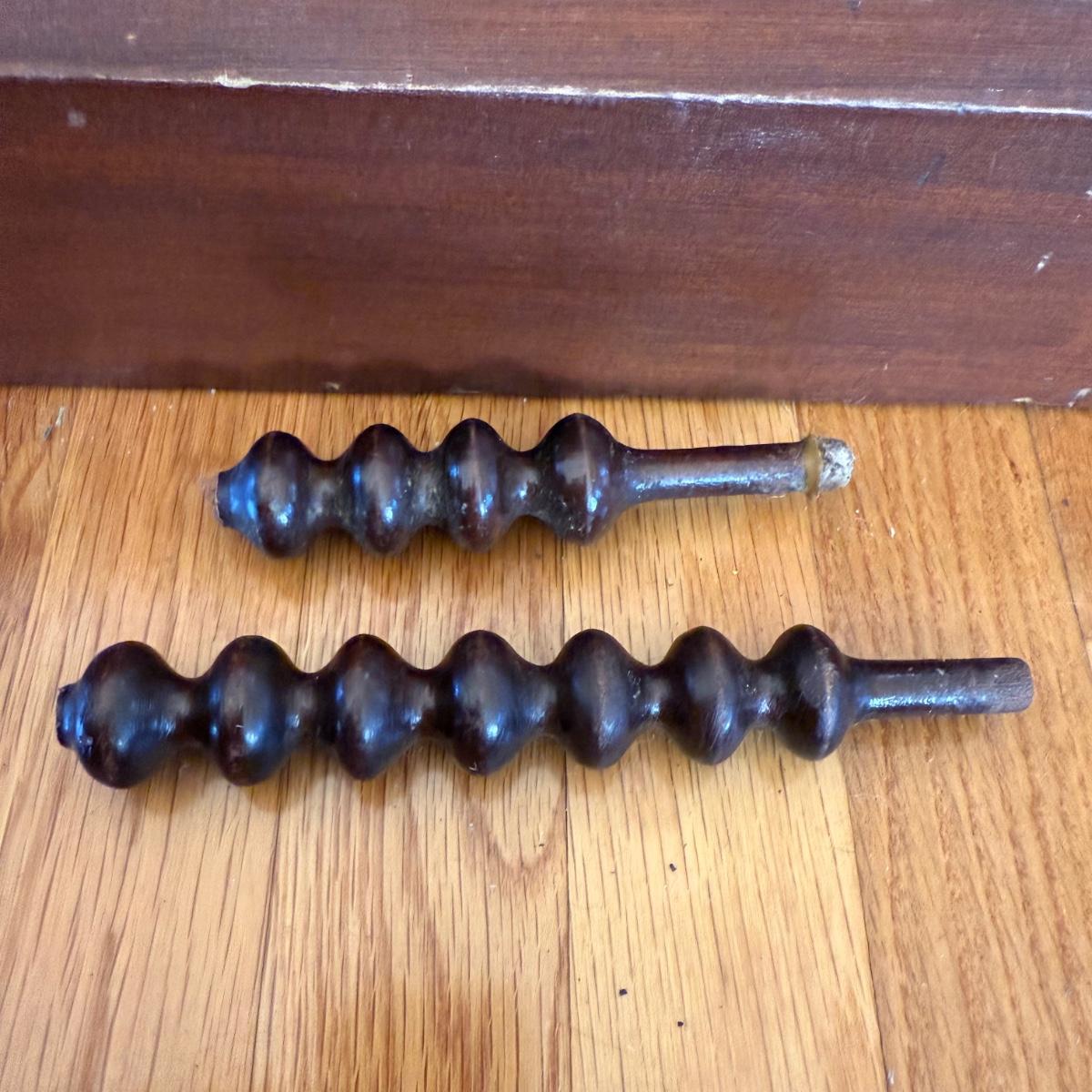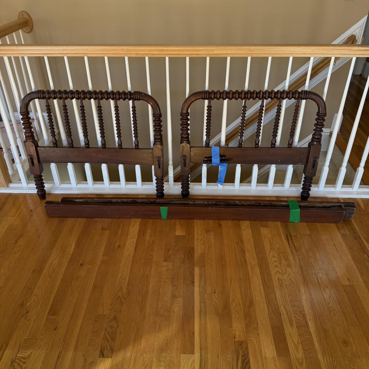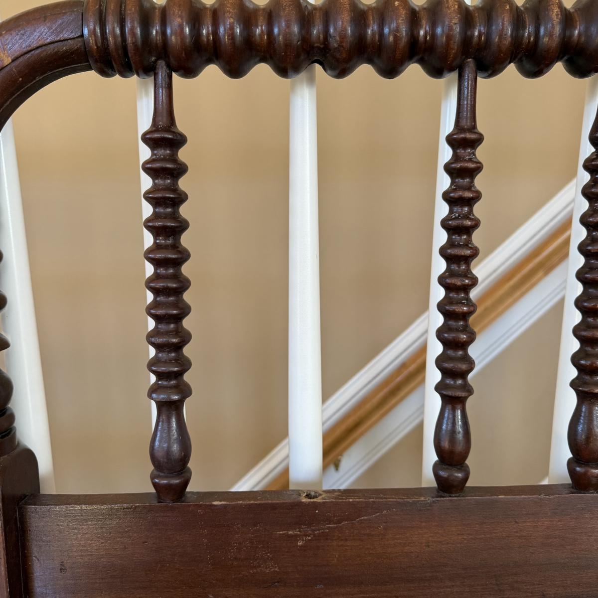 This lot contains a vintage Jenny Lind spool toddler bed. This precious bed features a dark wooden stain and spindles at the head and foot board. Unfortunately, one of the spindles is broken on one of the boards and therefore are some scuffs on the edges. The sizes slide into the head and foot board but this item does not come with the bed slats. Note, this item is already broken down the picture resembles what it would possibly look like when assembled.
