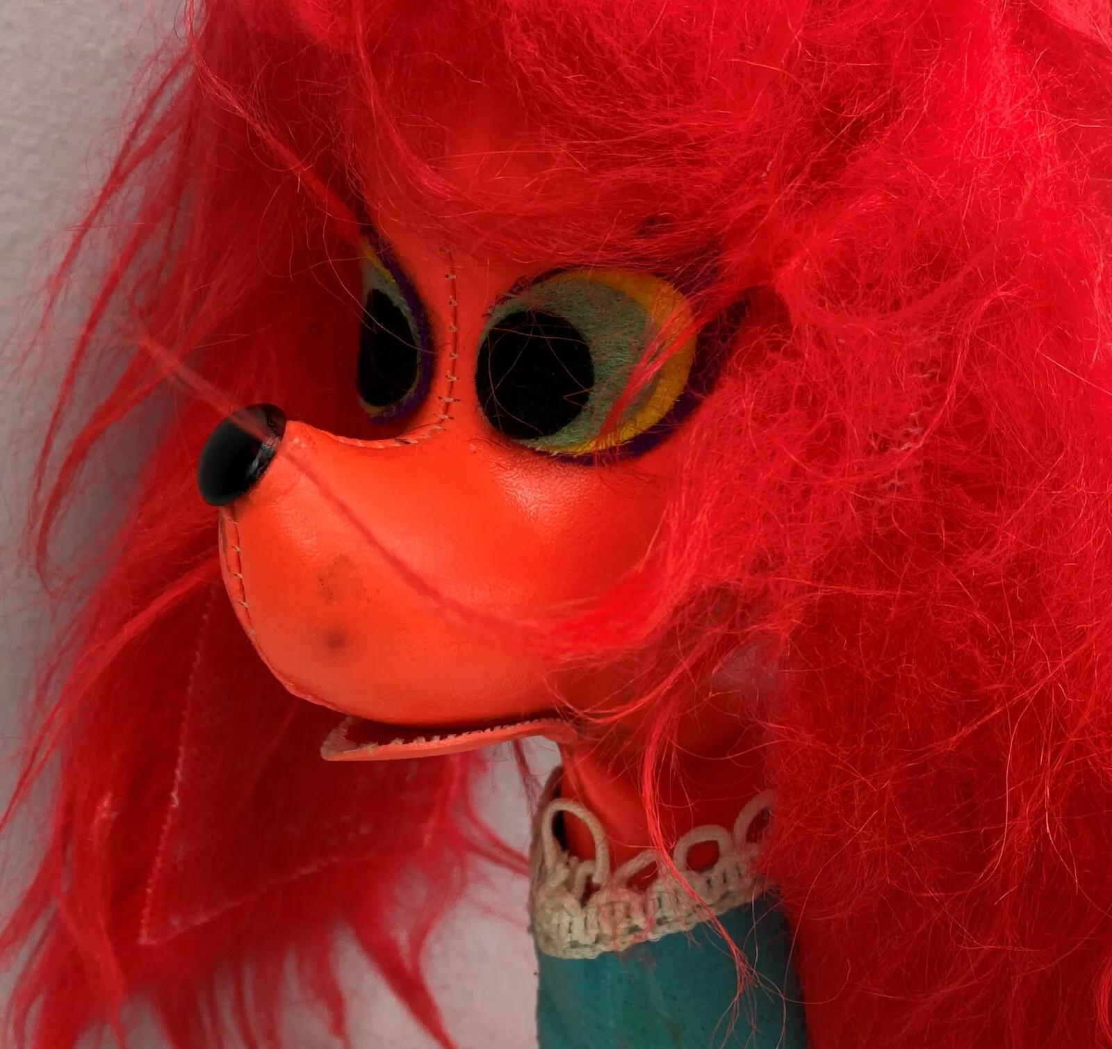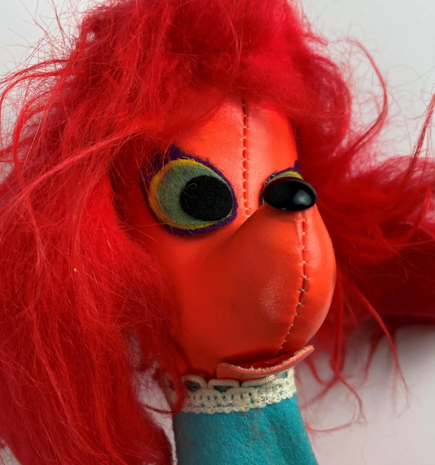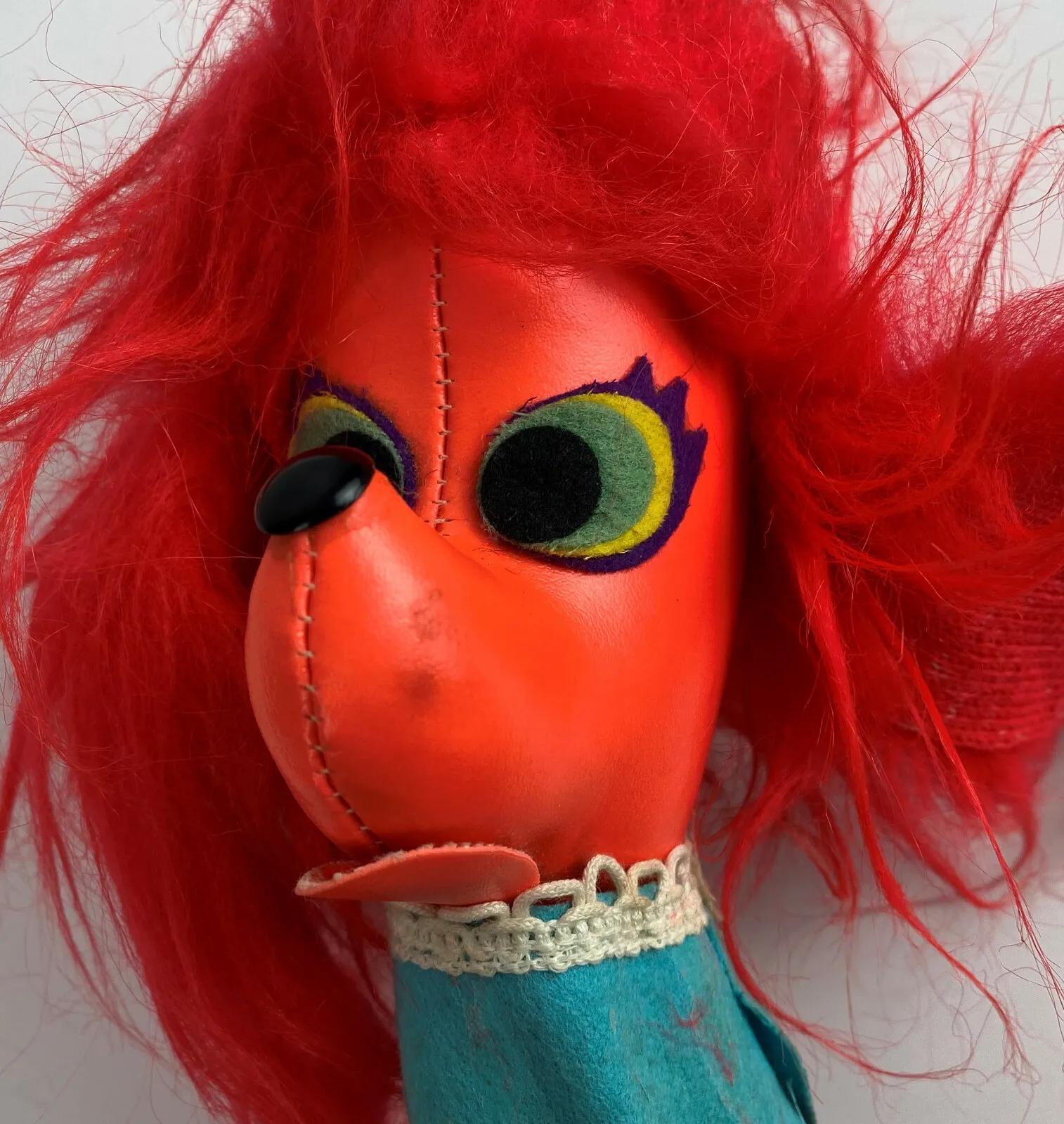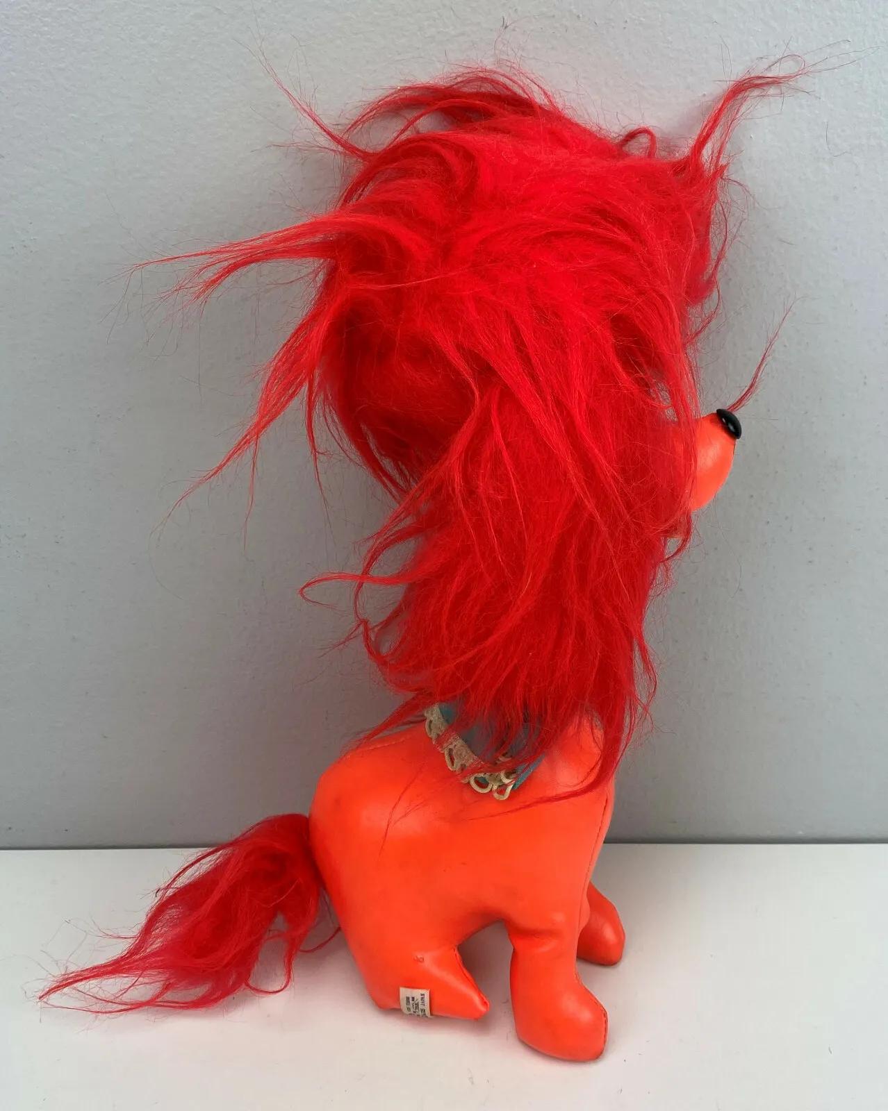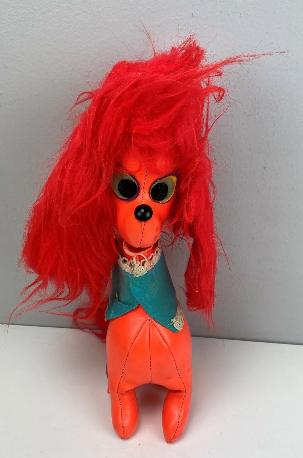 Here is a vintage plush 11-inch tall stuffed pleather JESTIA dog from T.K.R. in Japan...No. 725...Matted hair...slight soiling with age and use.