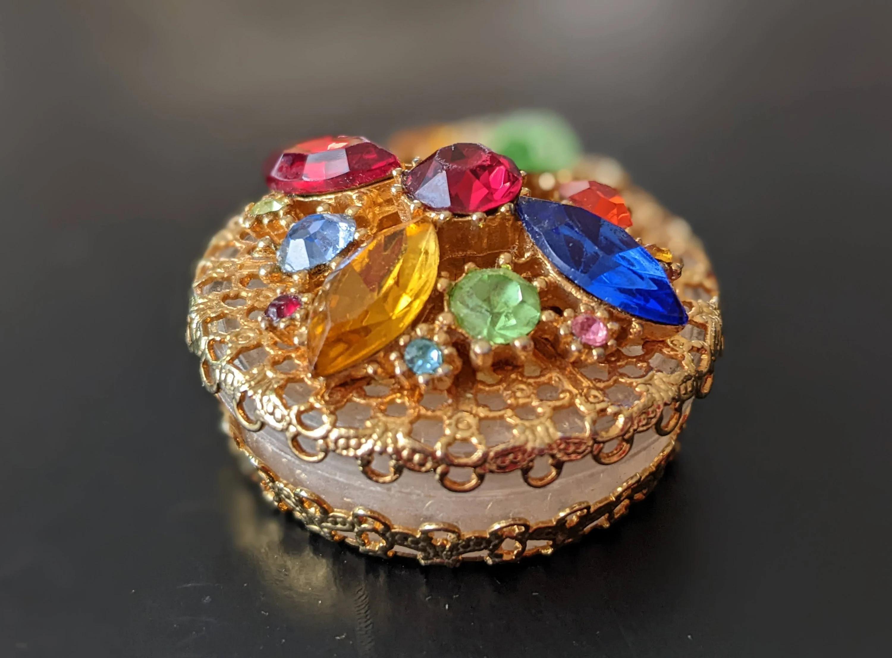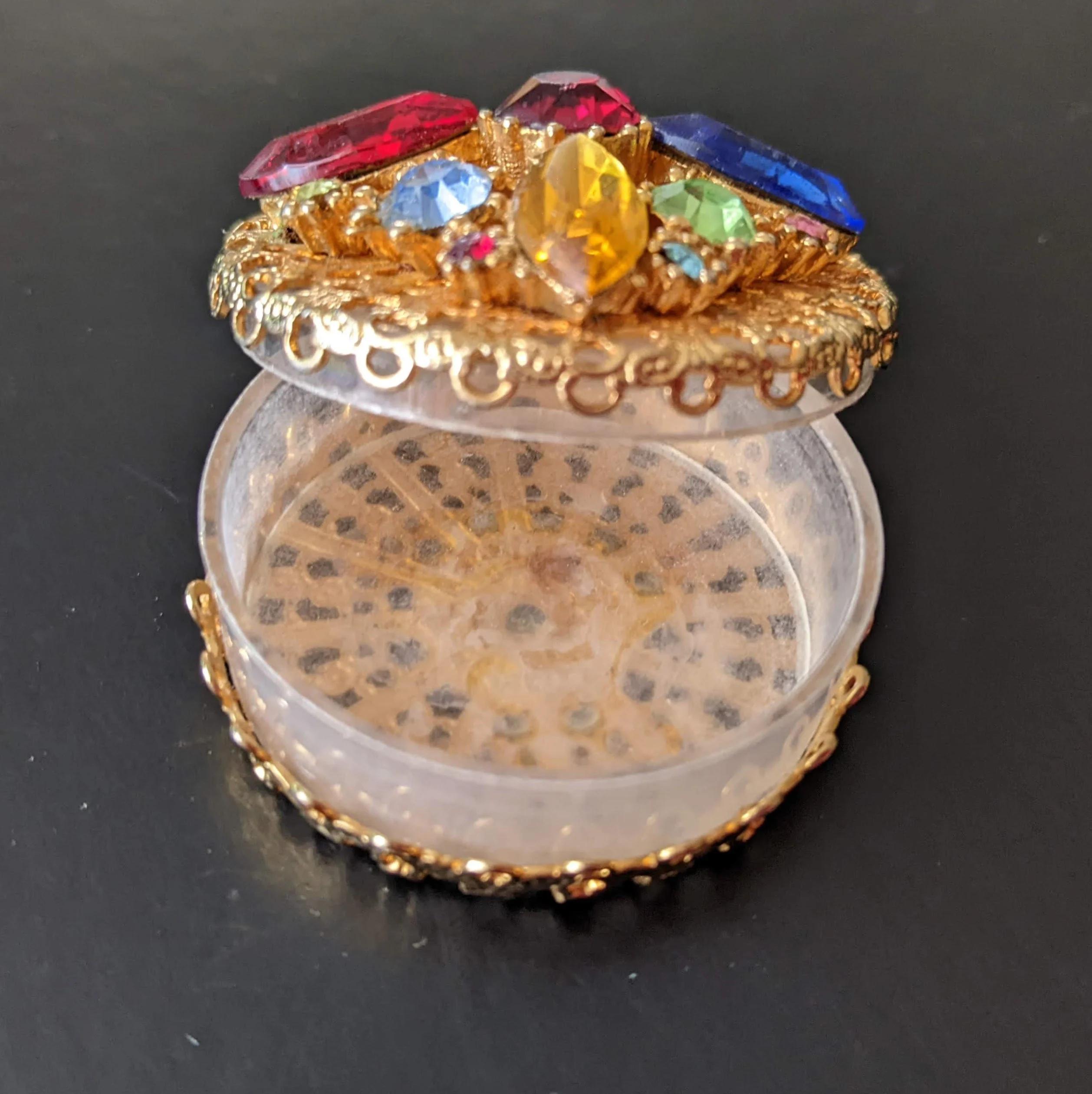 Vintage jewel topped pill box that can be used as a trinket or jewelry box. It would be lovely as a bedside holder for earrings or rings.