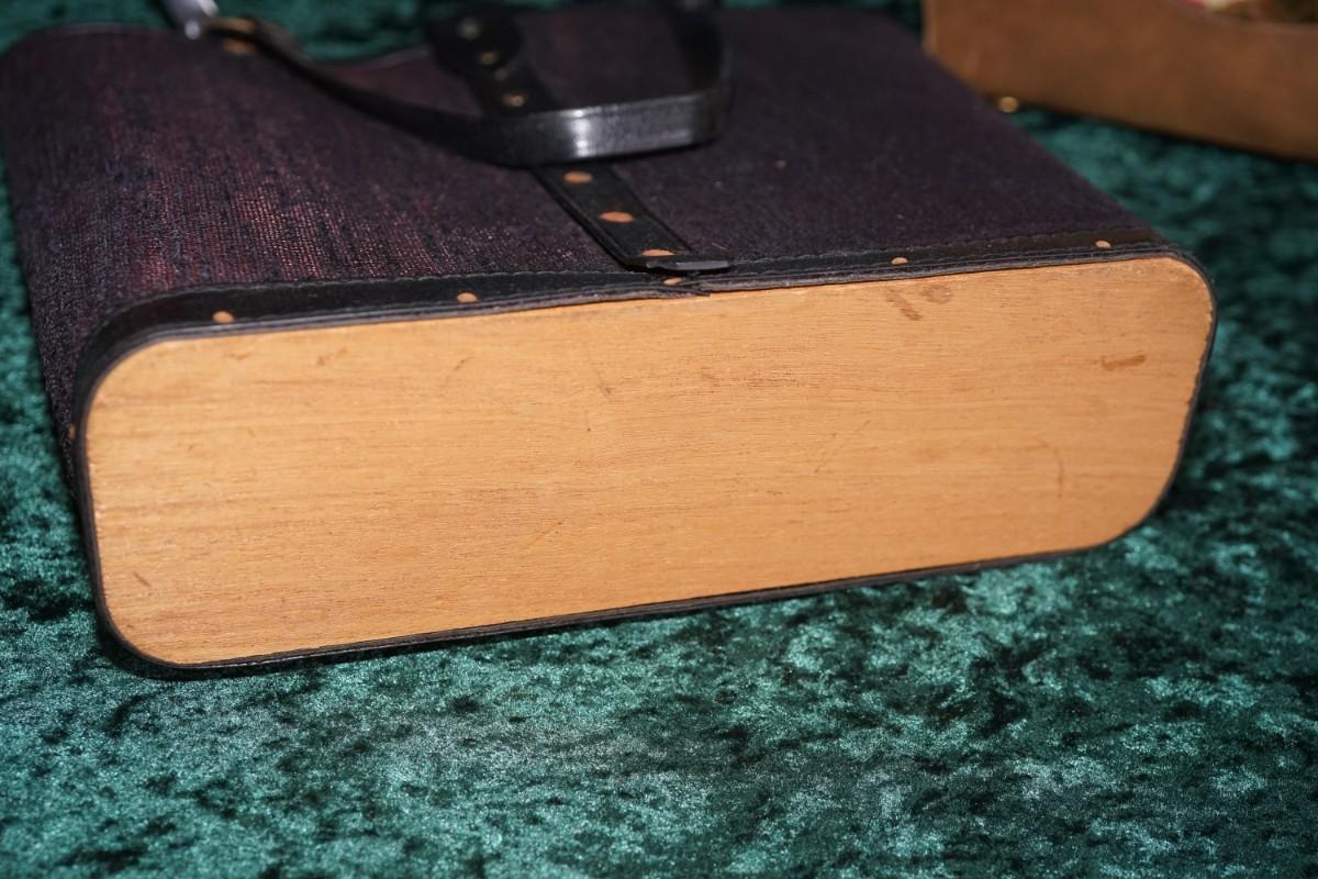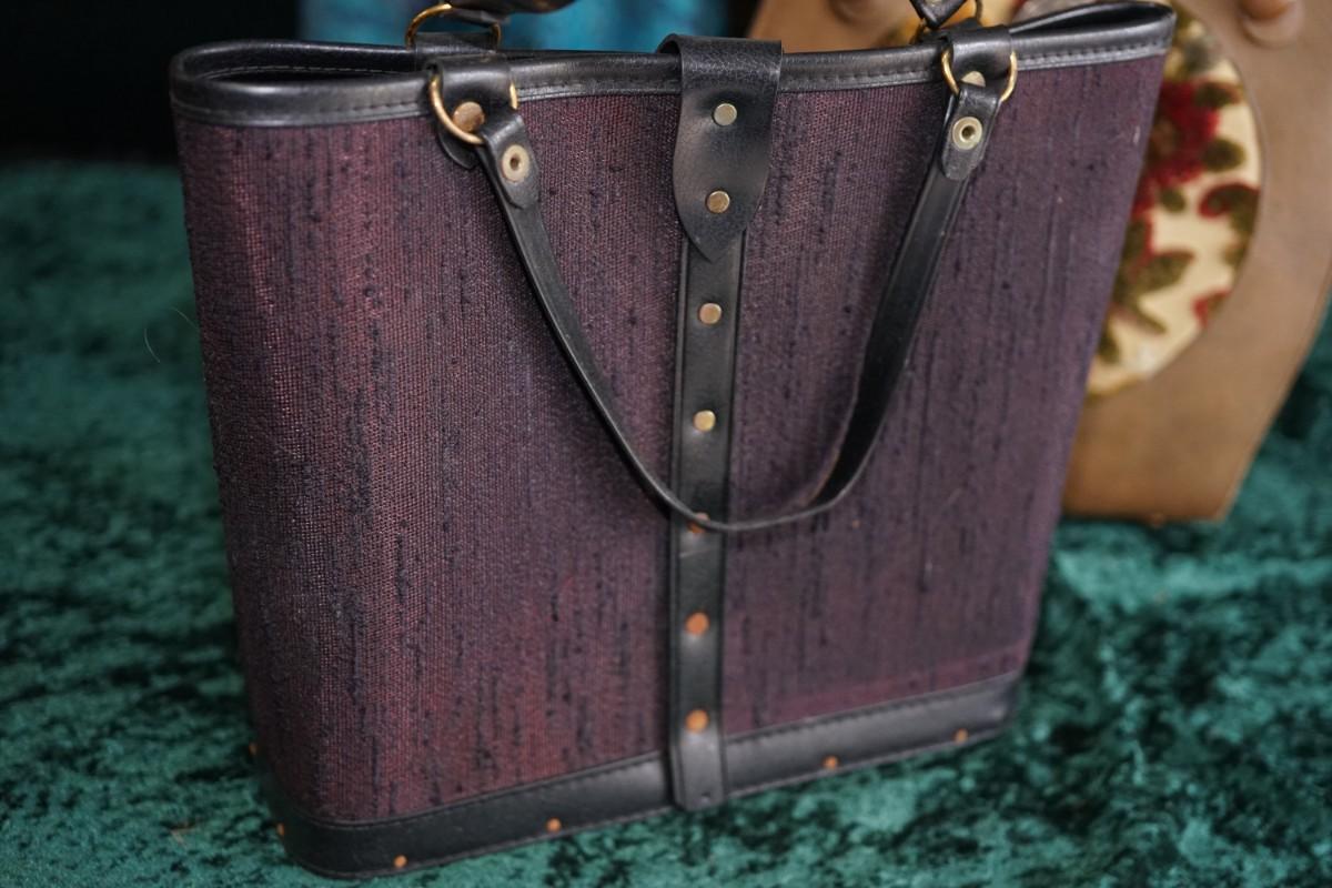 The vinyl handbag with the carpet style applied center frieze, is slightly dry but not bad.