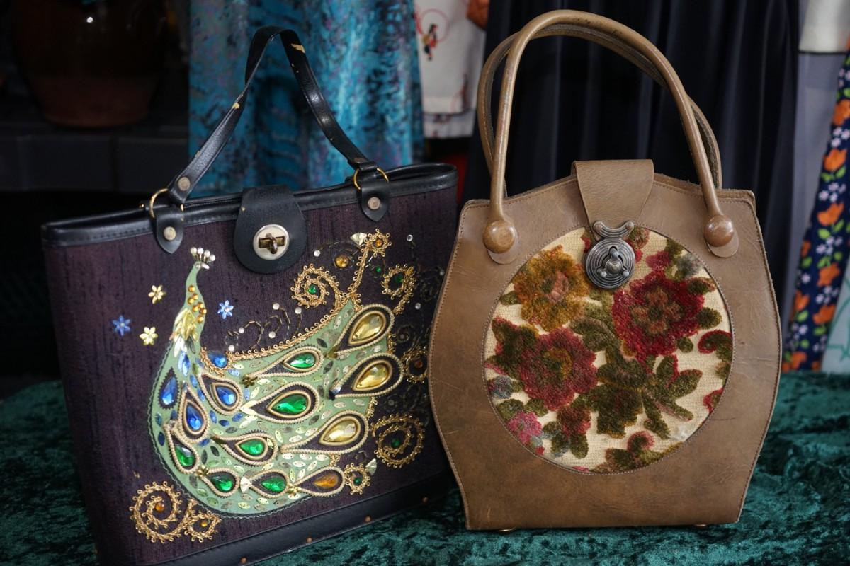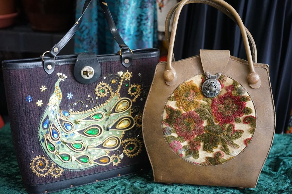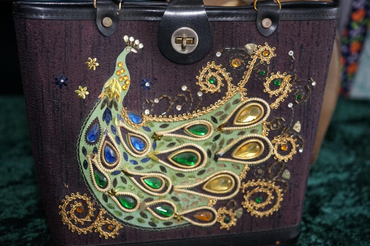 VINTAGE JEWELED & PEACOCK OVER TOTE BAG /VINYL HAND BACK W/FRIEZE STYLE FLOWER
