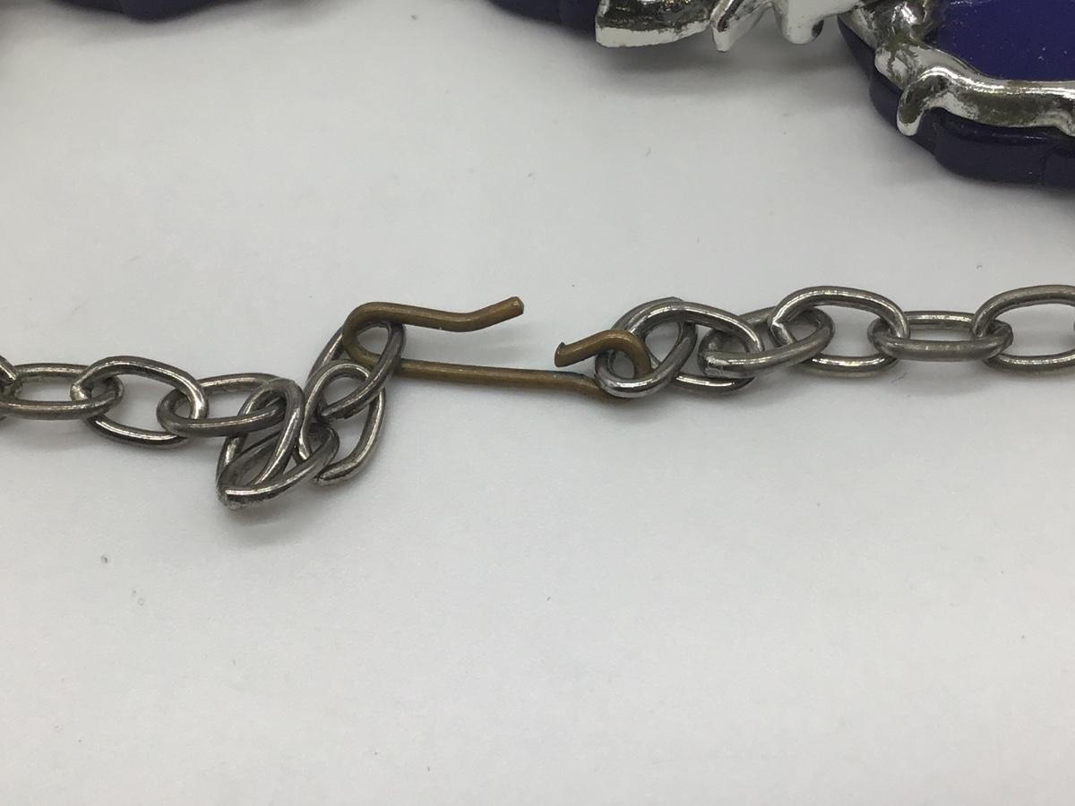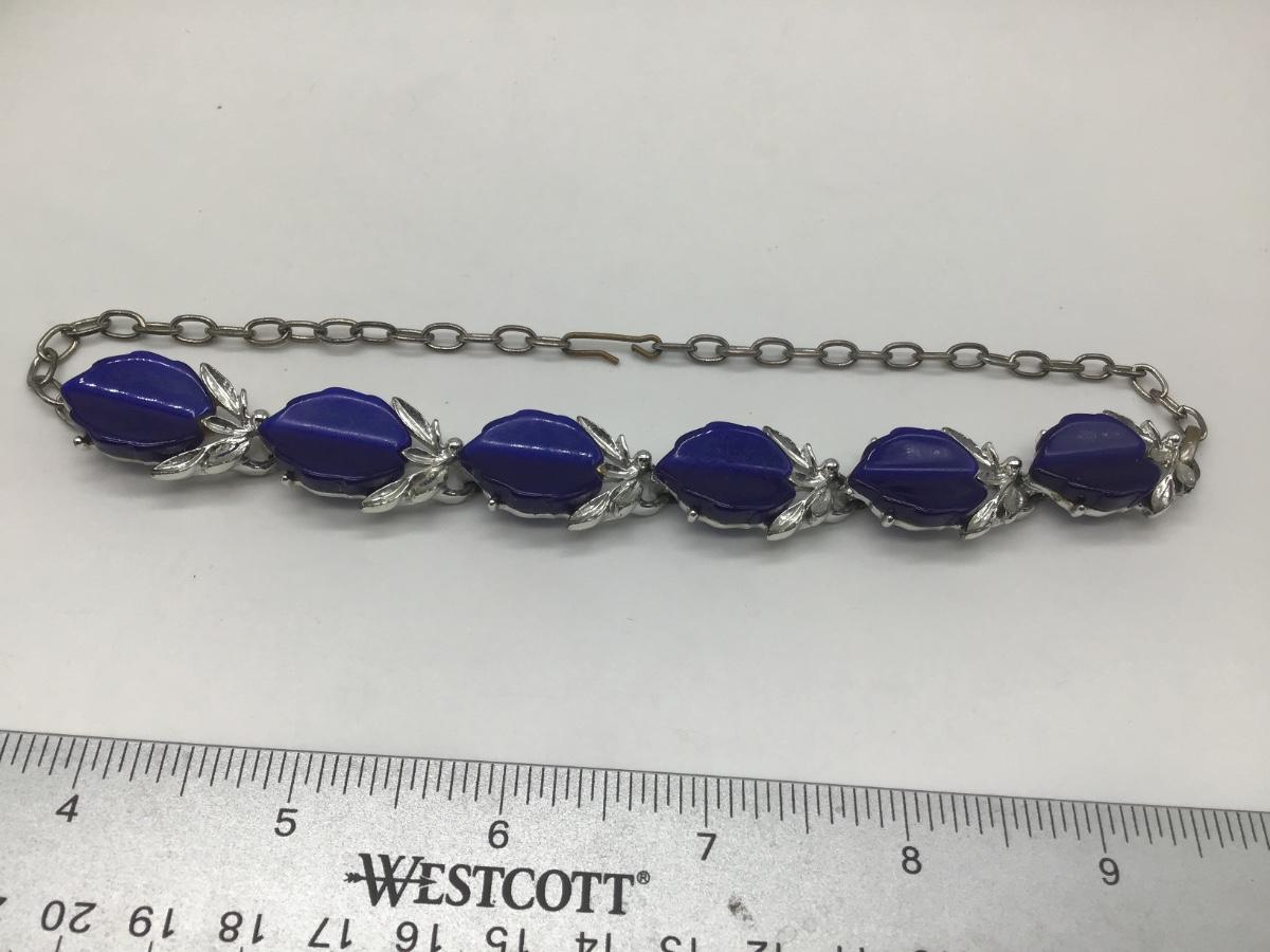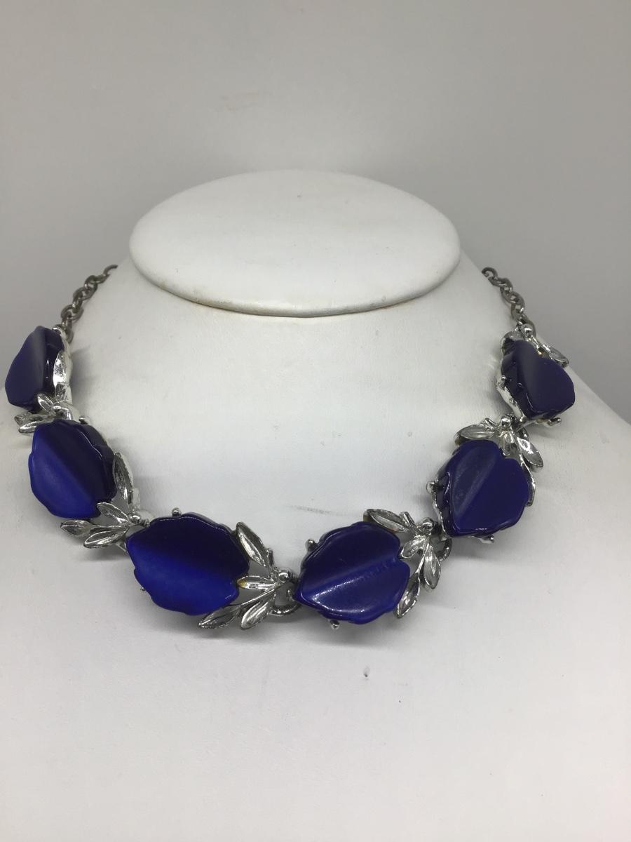 ...Vintage Silver Tone,Blue Lucite Leaf Panels Necklace...