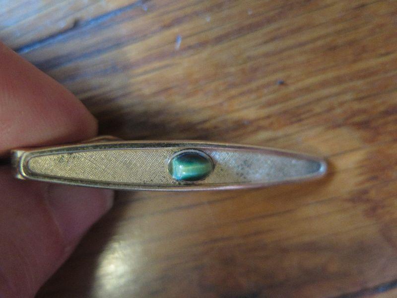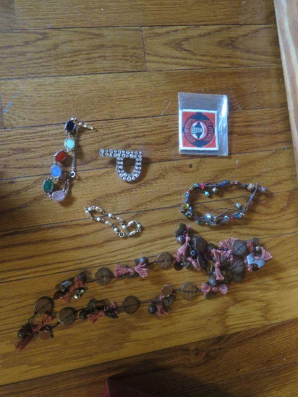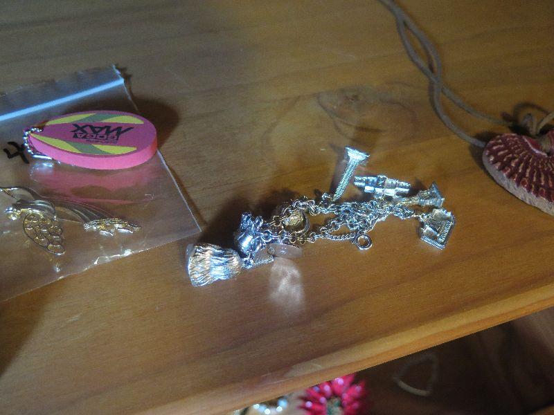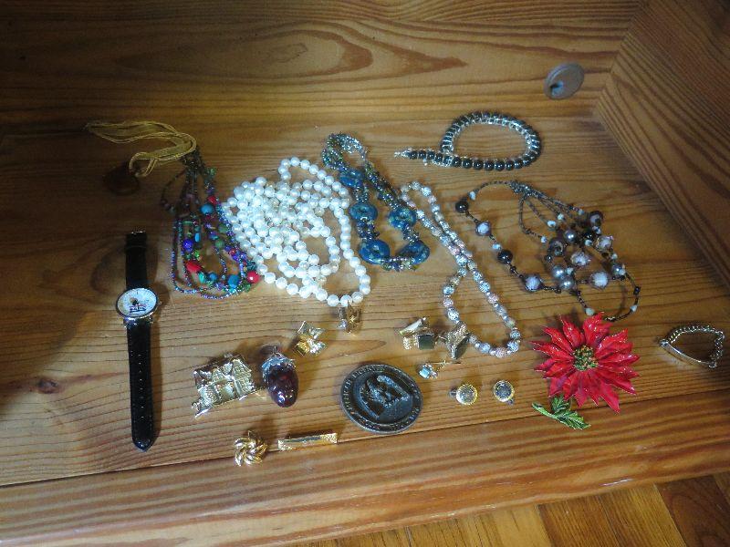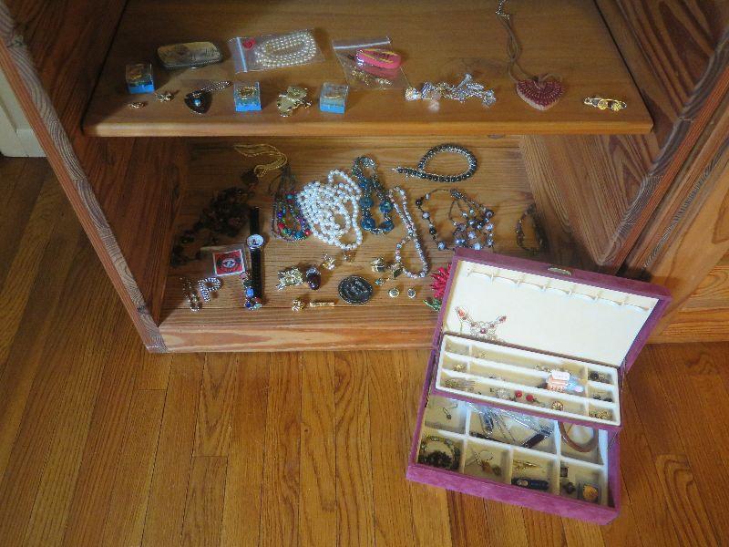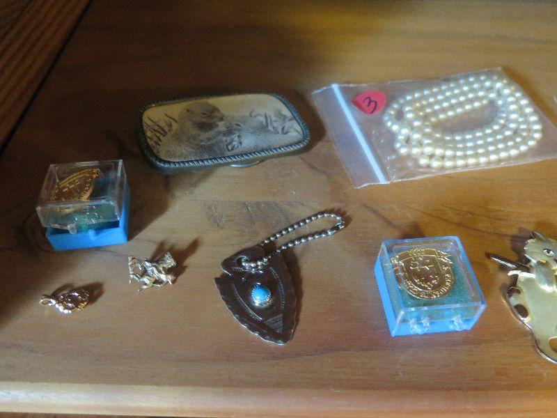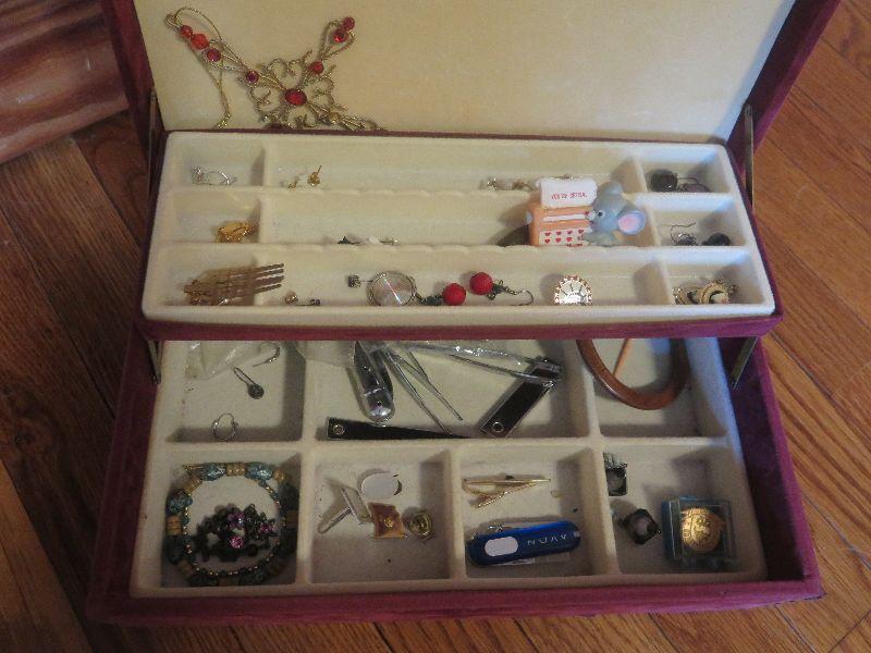 Jewelry box and fashion jewelry. Pearls, belt buckle, charm bracelet, beaded necklaces, tie pins, including tie clasp by Swank, and more.