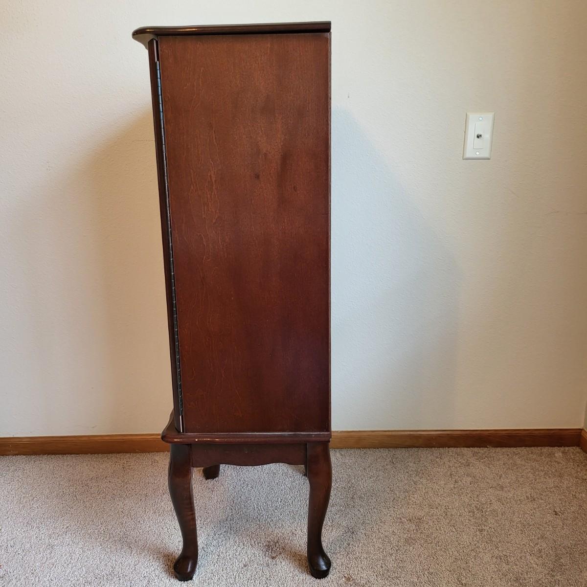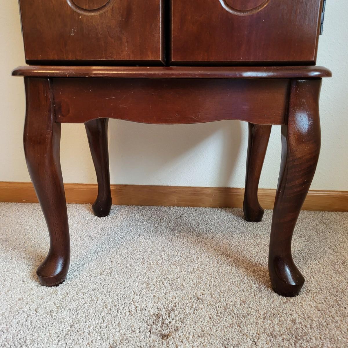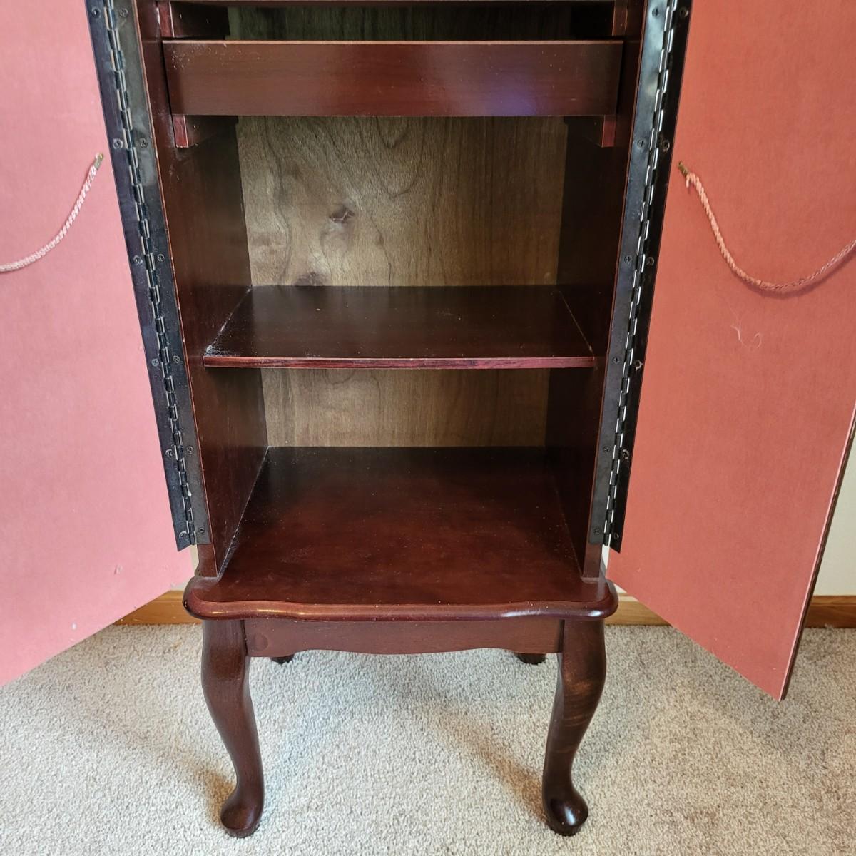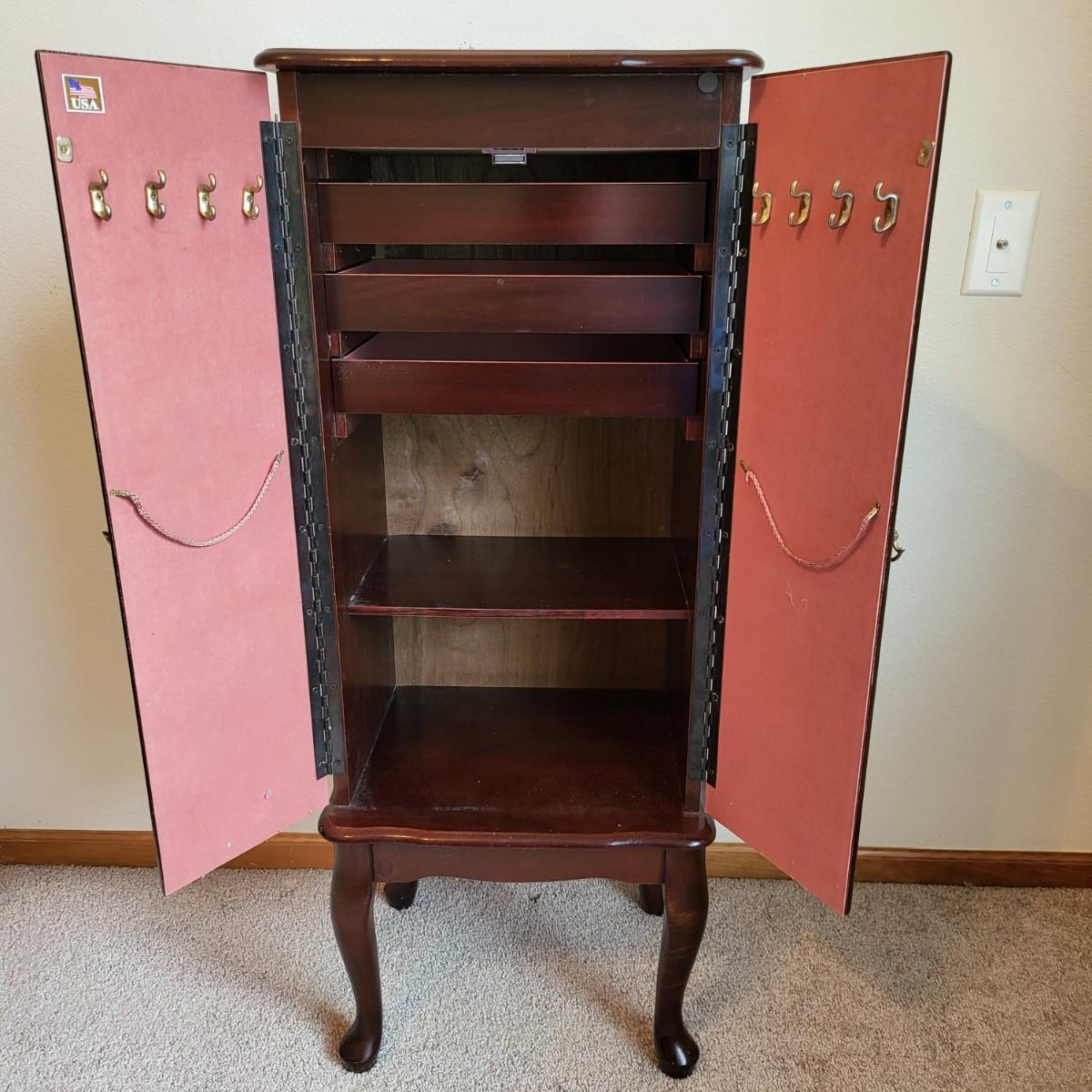 Nice vintage, cherry finish, wood jewelry armoire/cabinet. Two long hinged front doors. Queen Anne Style legs. 40" tall x 16" wide x 13" deep. Made in Taiwan.