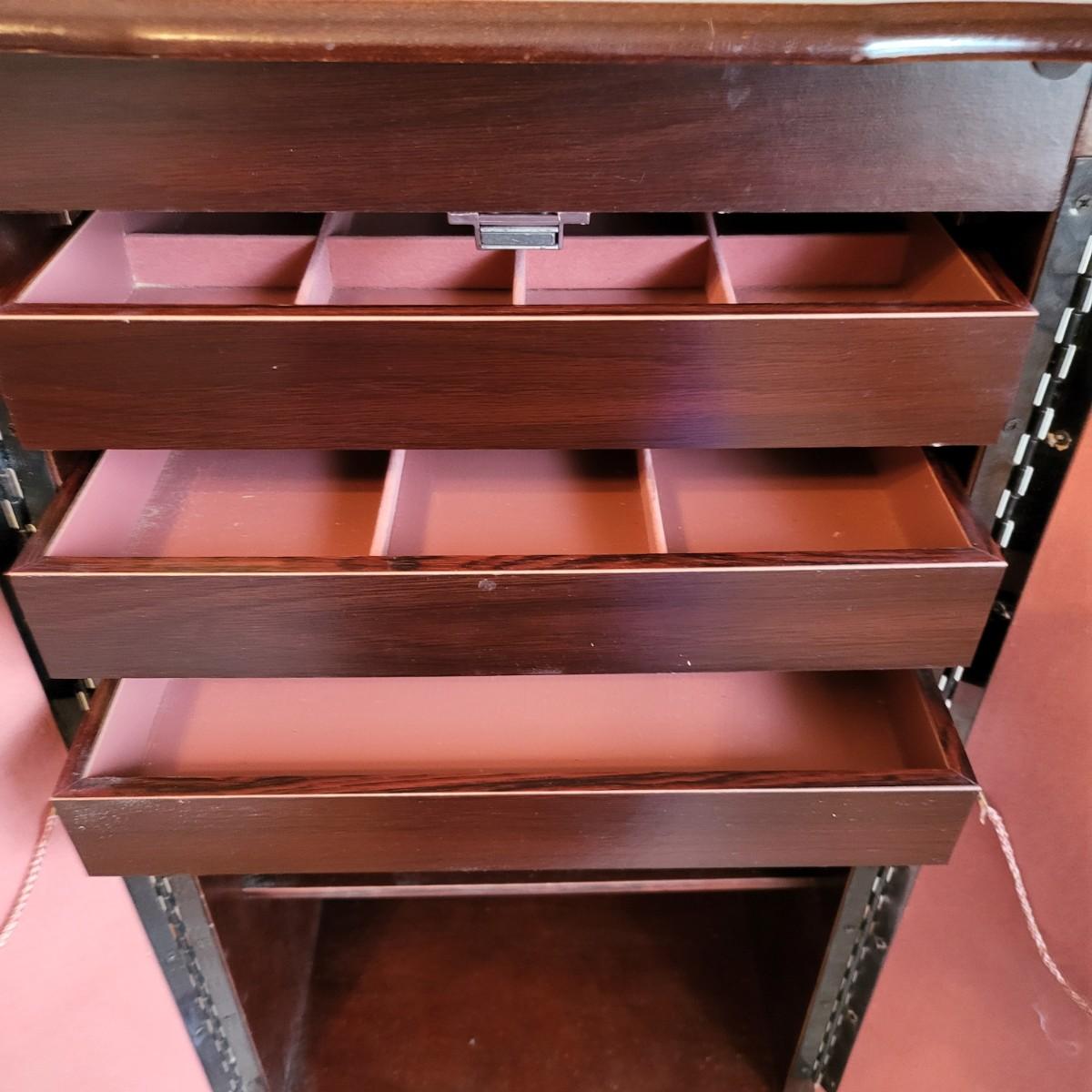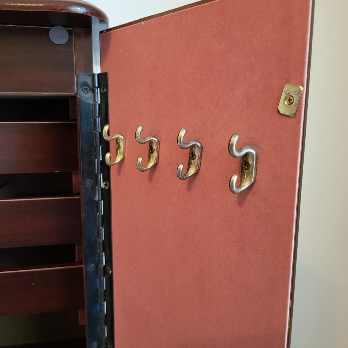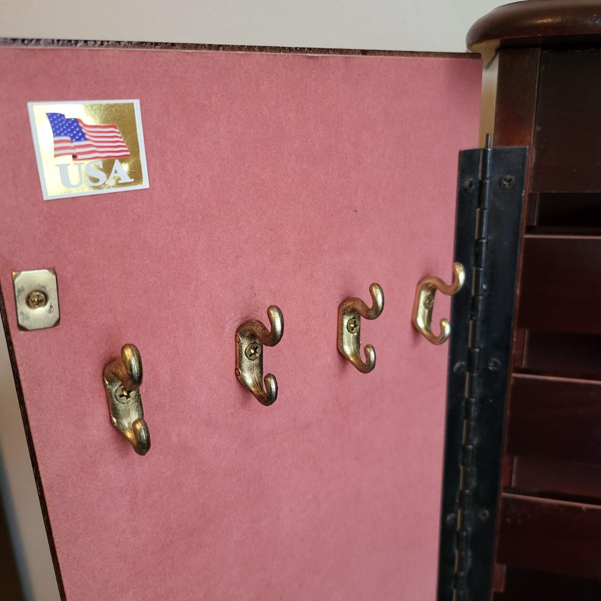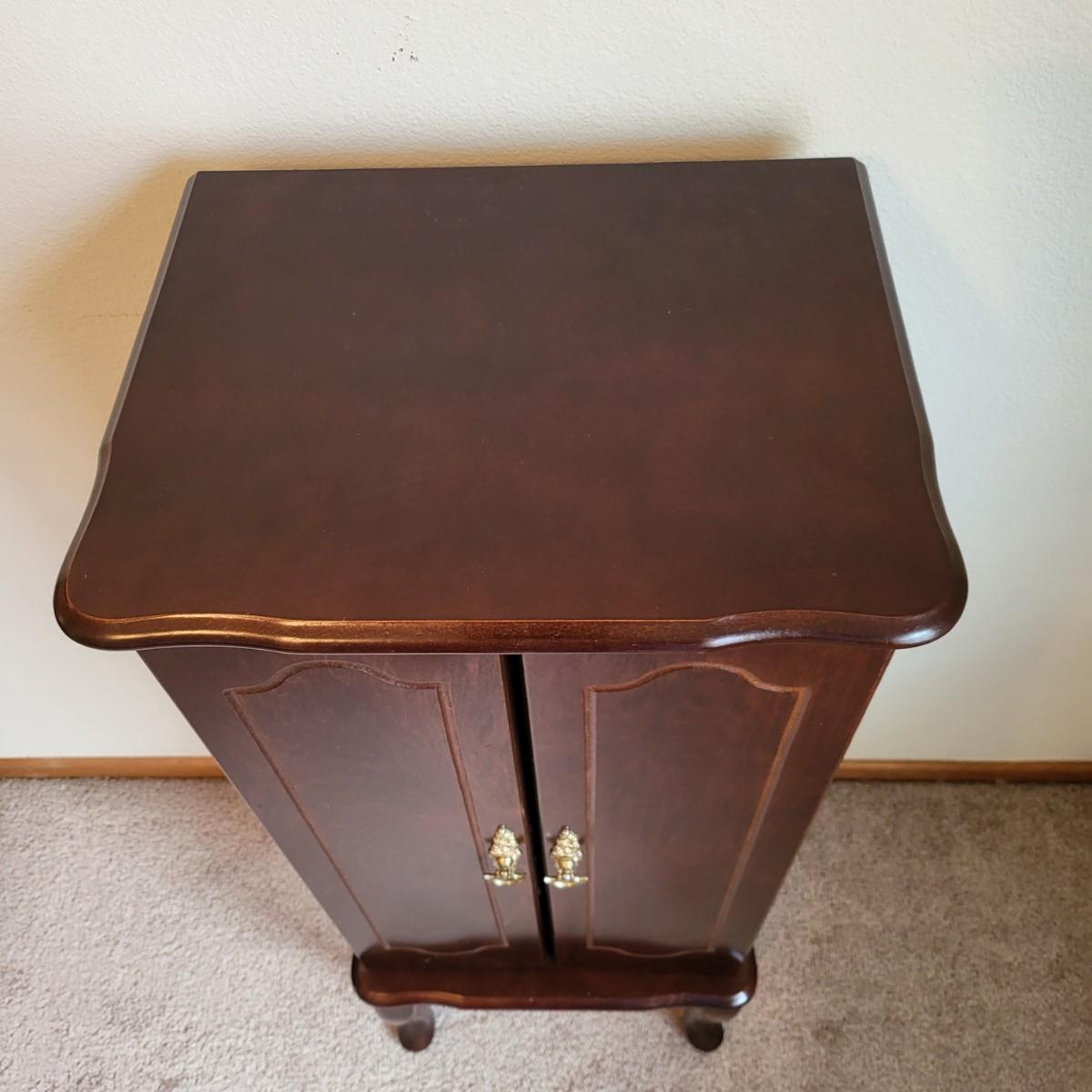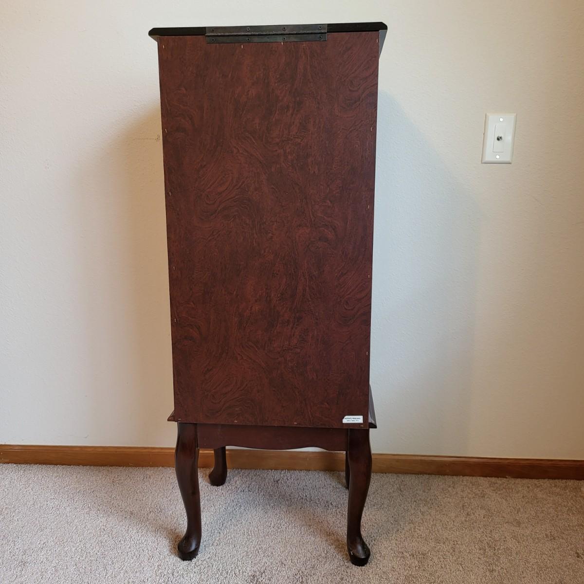 Nice vintage, cherry finish, wood jewelry armoire/cabinet. Two long hinged front doors. Queen Anne Style legs. 40" tall x 16" wide x 13" deep. Made in Taiwan.
