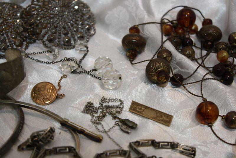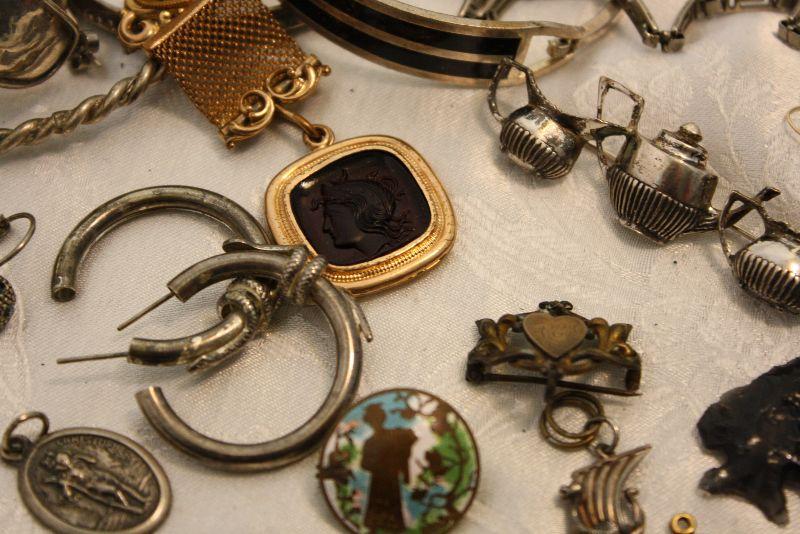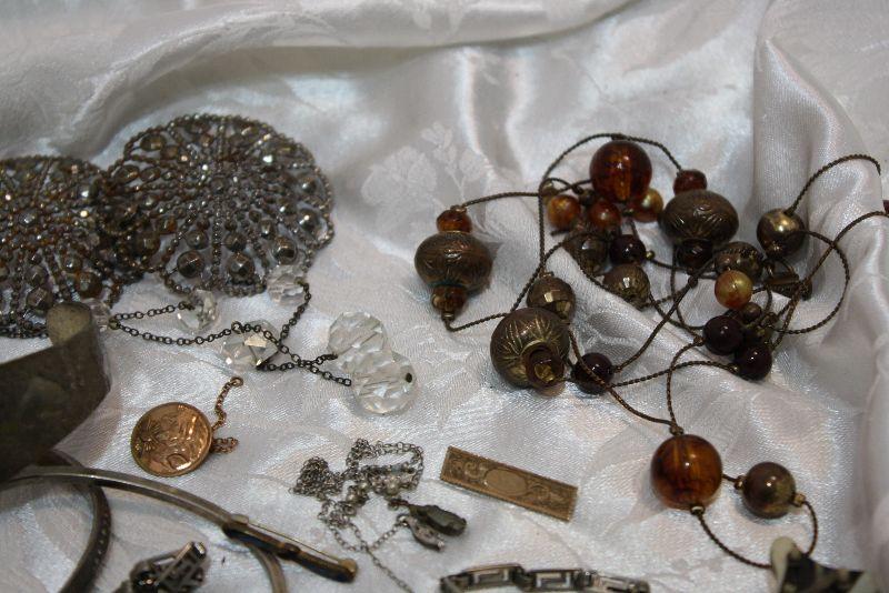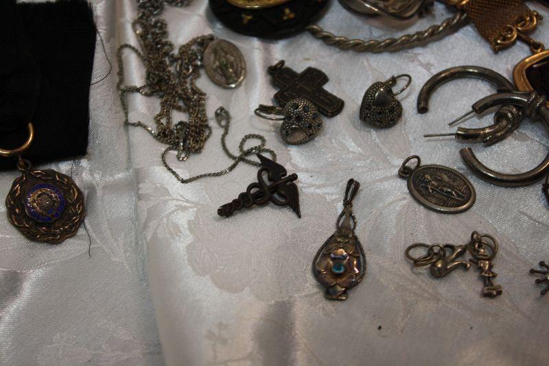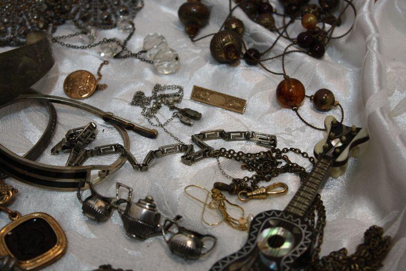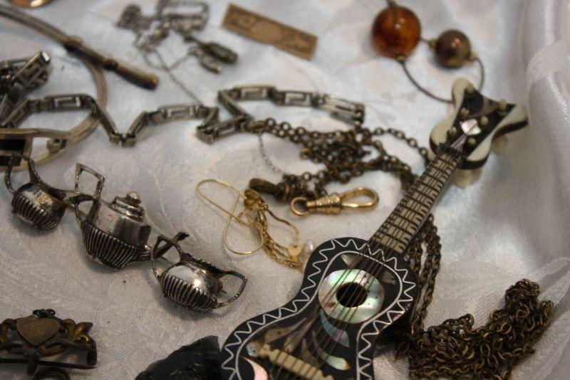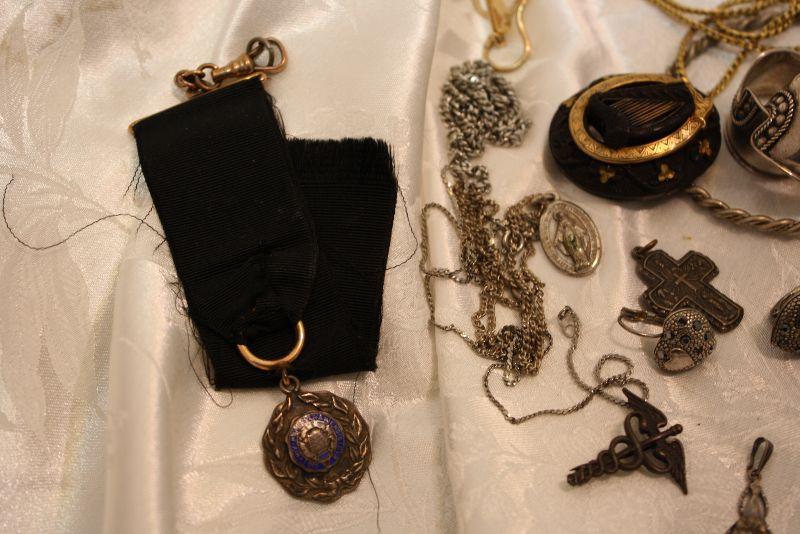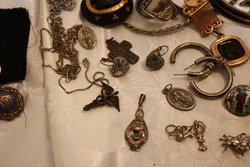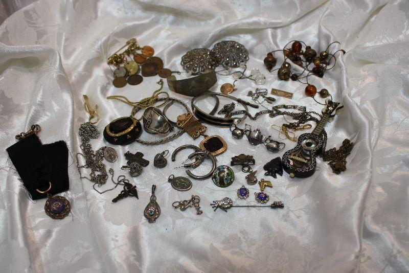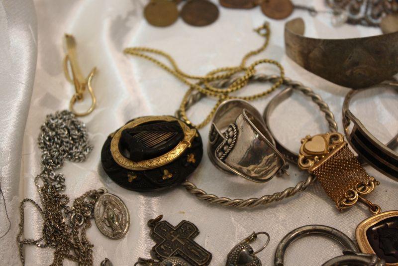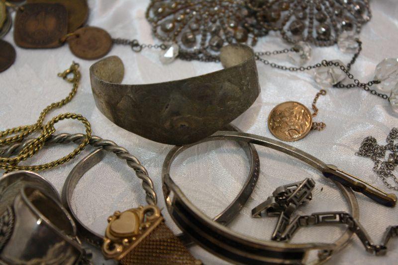 Mixed treasures, possibly some silver, brooches, bracelets.