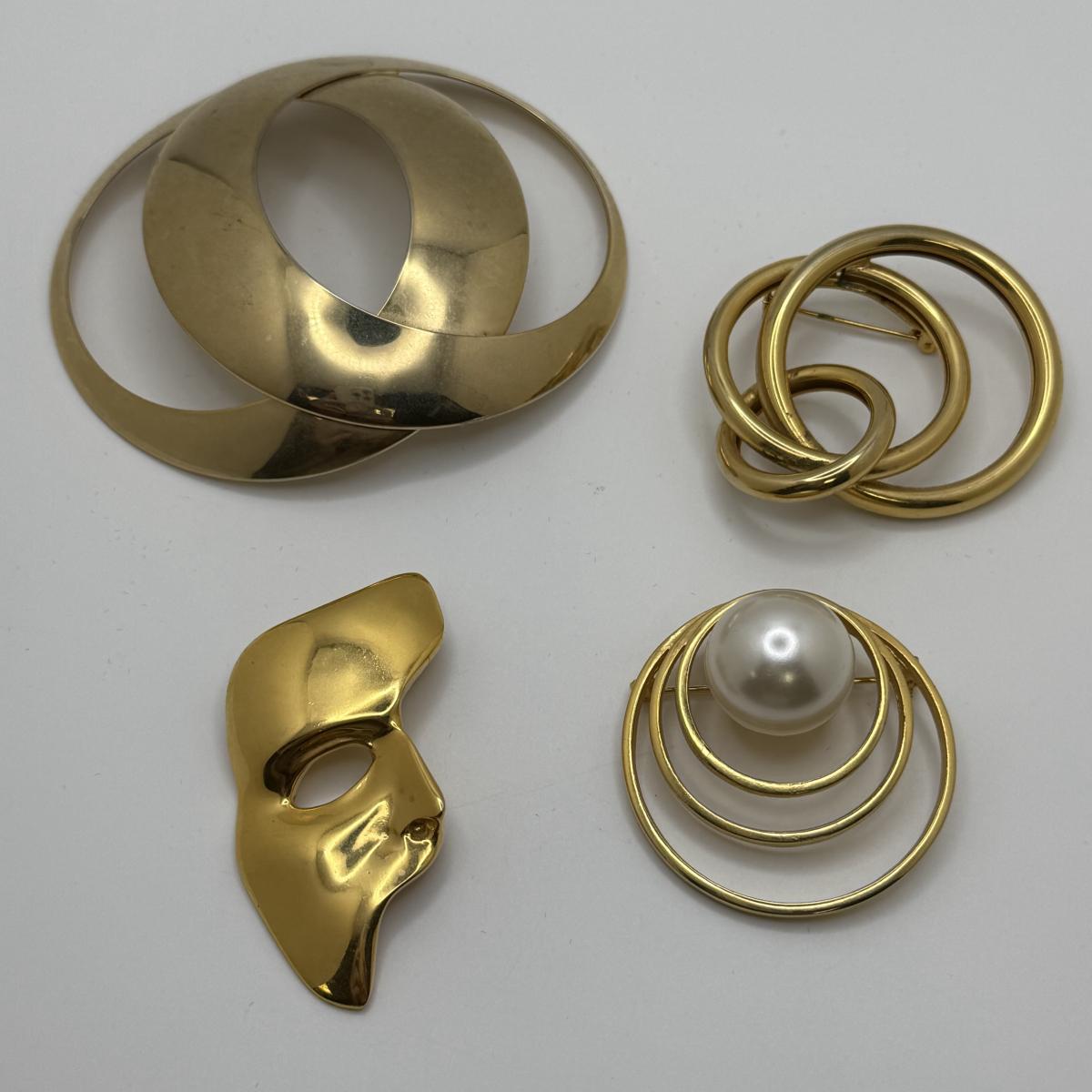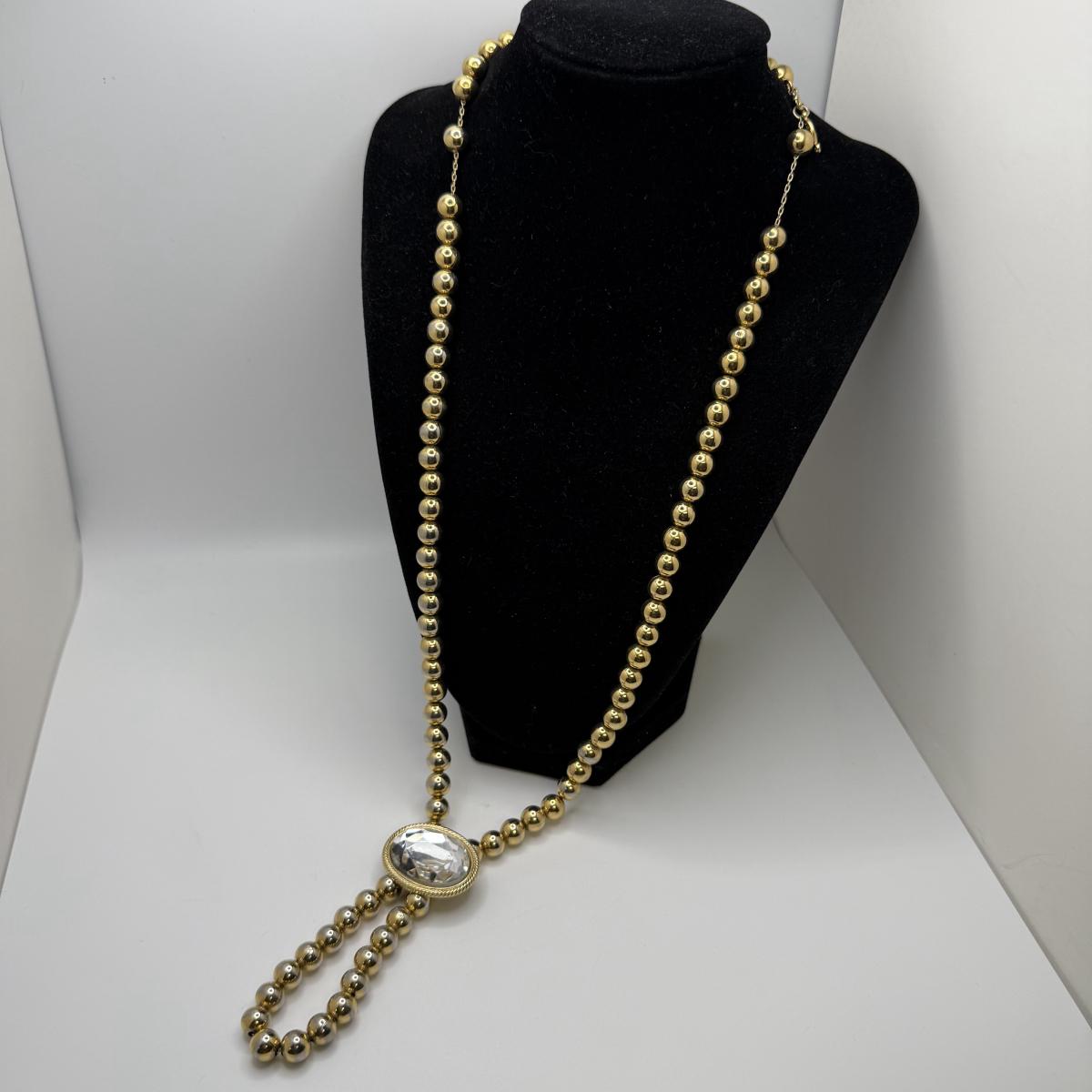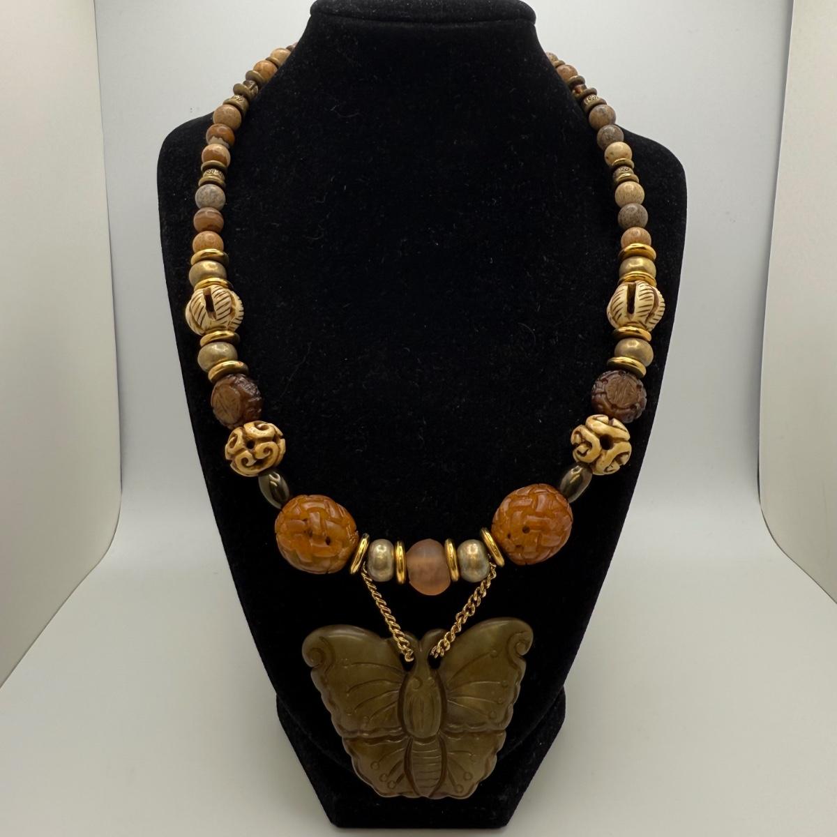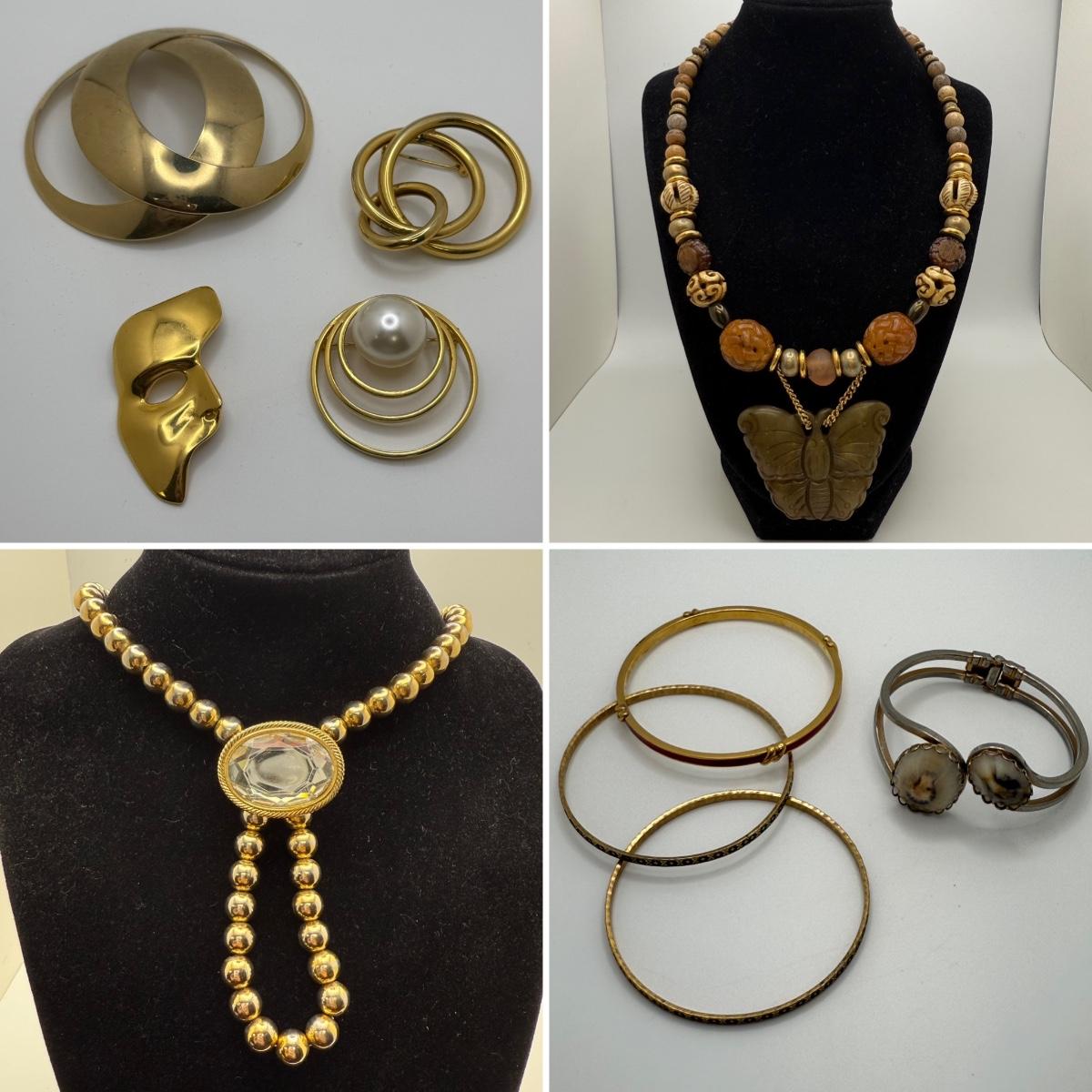 16 necklaces, one beaded bracelet, four bangle/cuff bracelets, 11 pins/brooches, one pair of Anne Klein post earrings, and five loose pendant comprise this lot of vintage and beaded jewelry. In the necklaces you’ll find metal, wood, shells, some carved stone, and more. The longest necklace is the Monet double layer gold chain with four gold beads and is approximately 40”. Please see photos for details and jewelry markings.