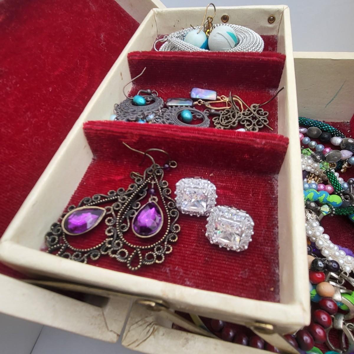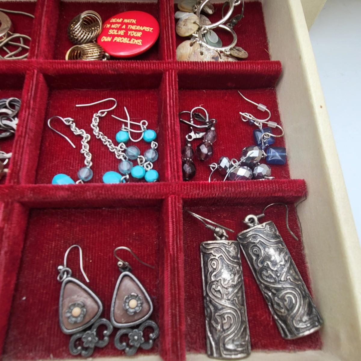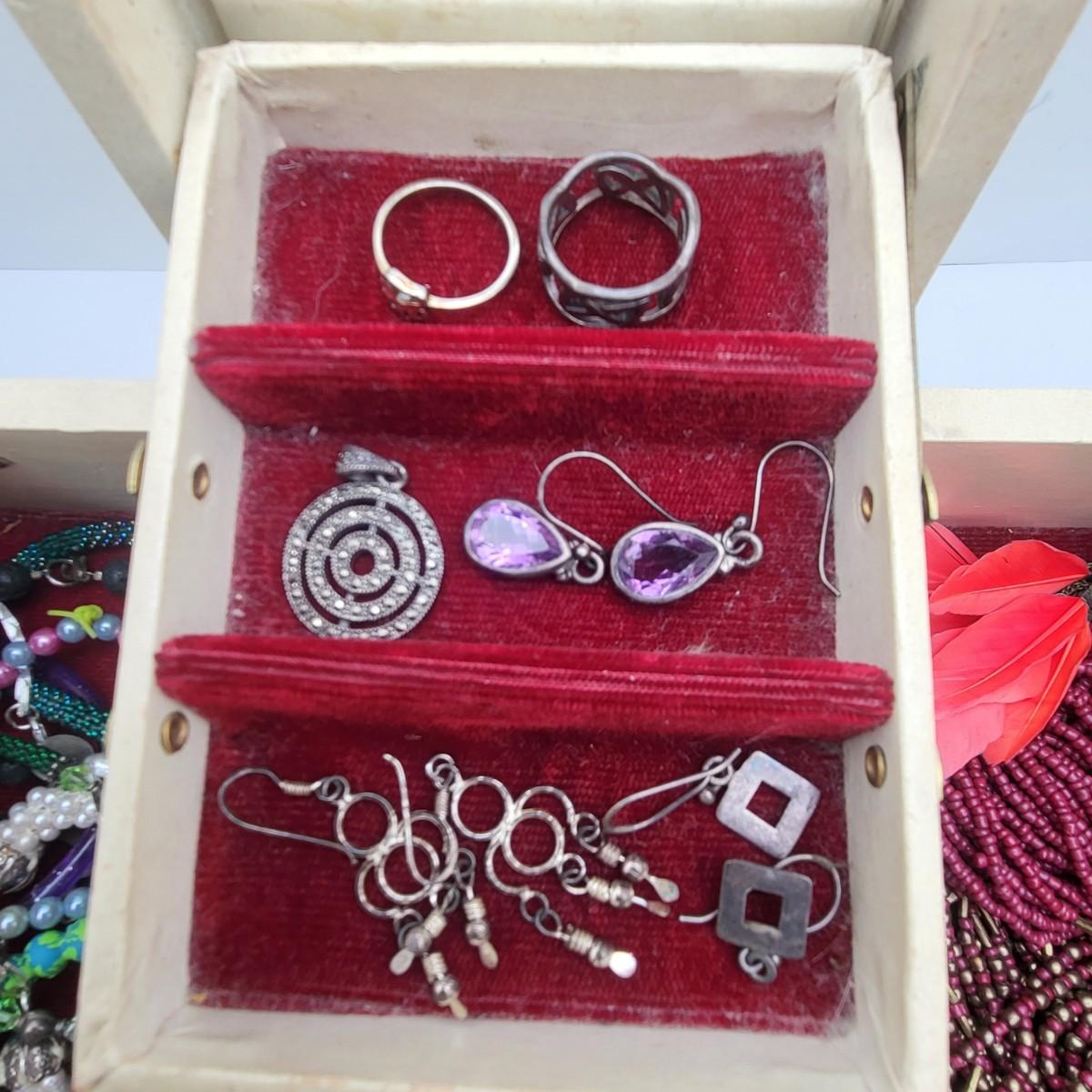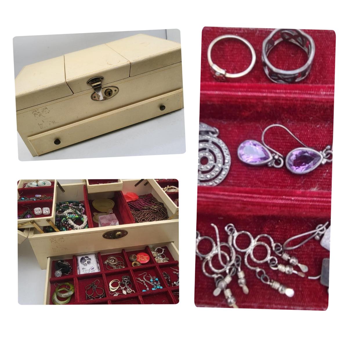 There are several pieces stamped 925, the rest is fashion/costume jewelry. Vintage jewelry box is 13" x 8" x 5".