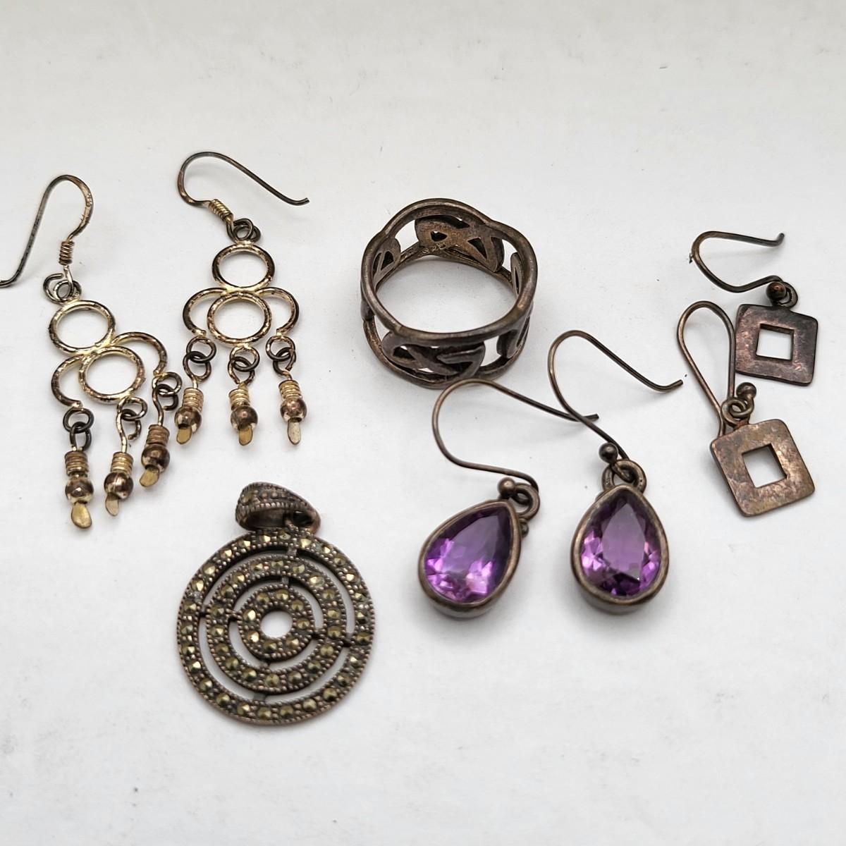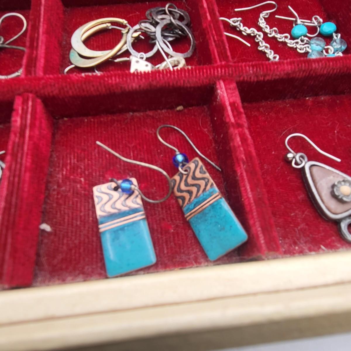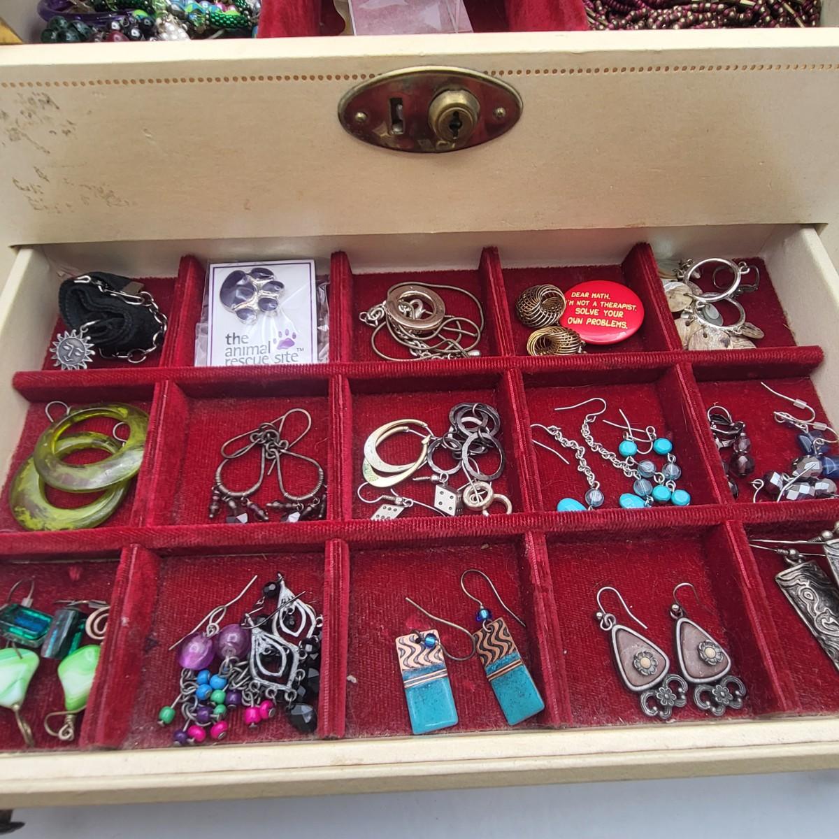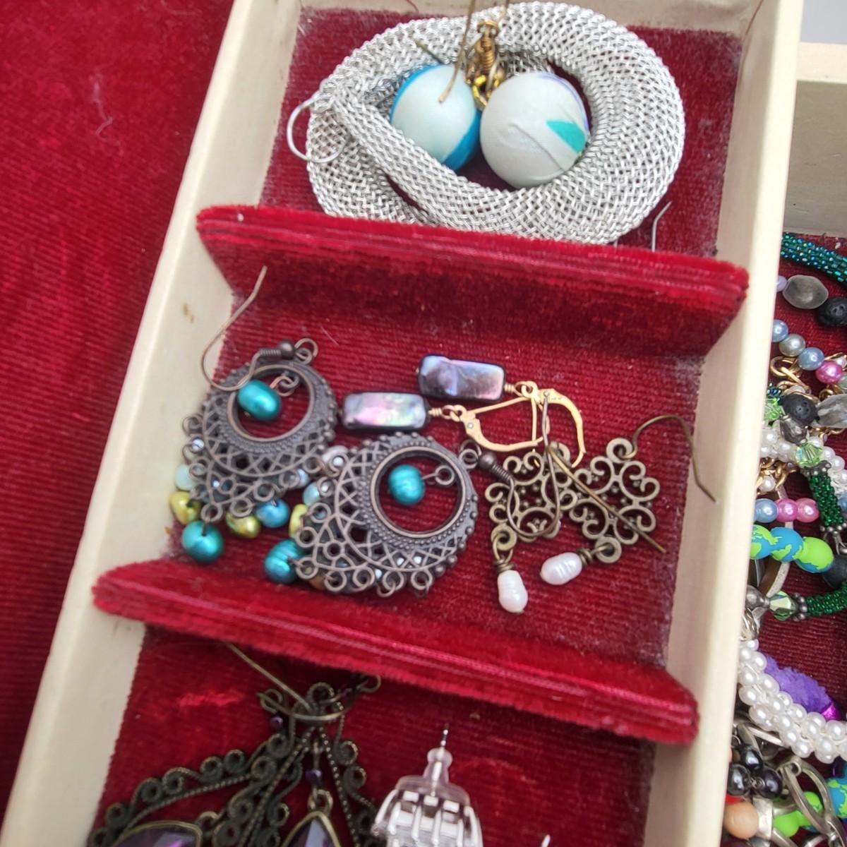 There are several pieces stamped 925, the rest is fashion/costume jewelry. Vintage jewelry box is 13" x 8" x 5".