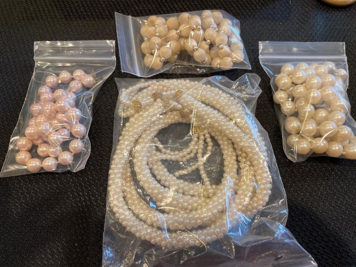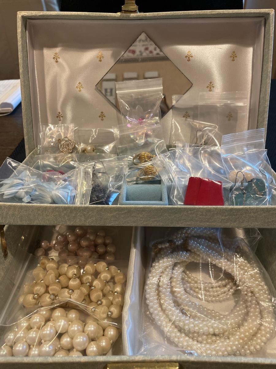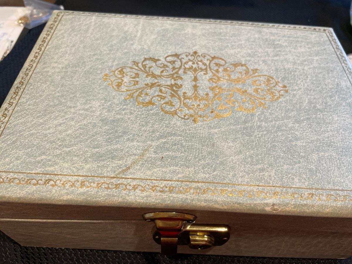 Vintage jewelry box with post earrings and faux pearl necklaces