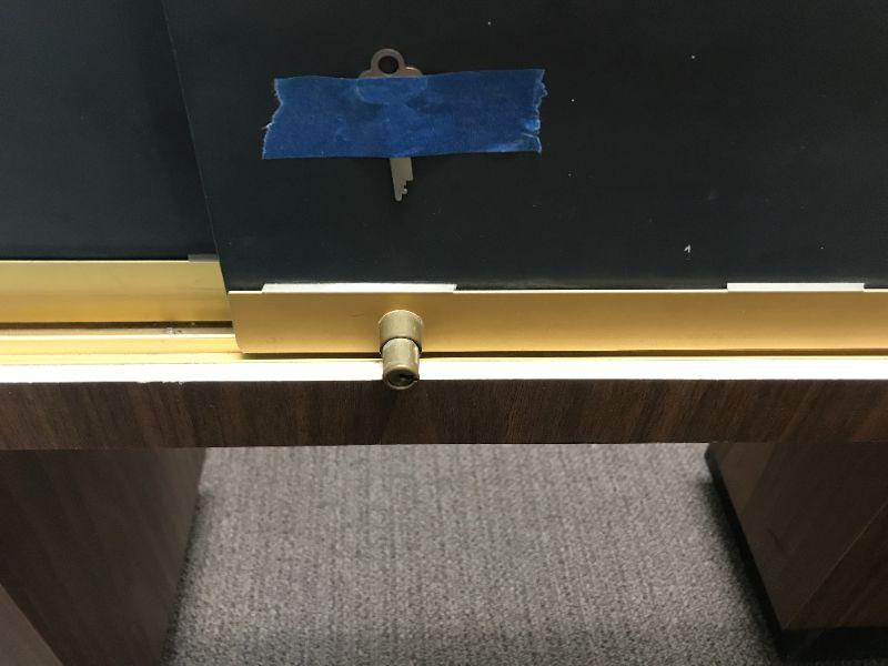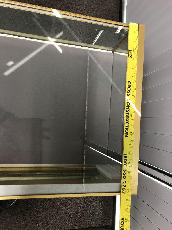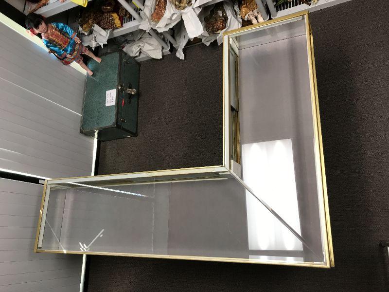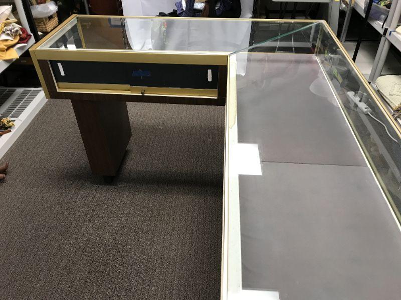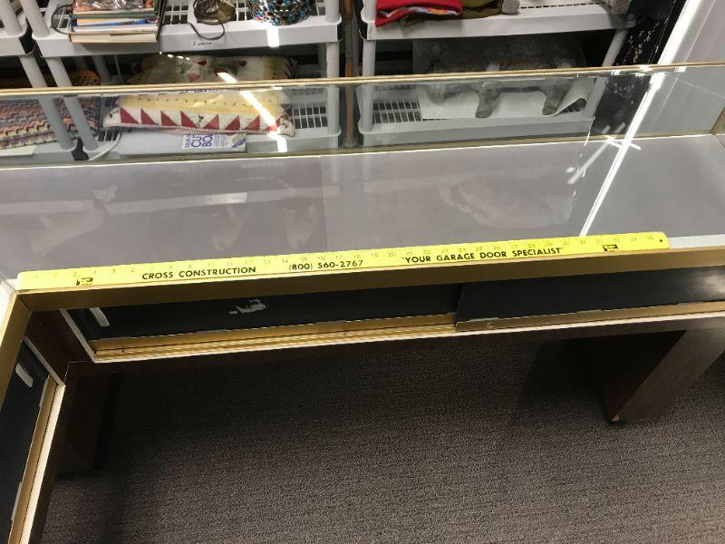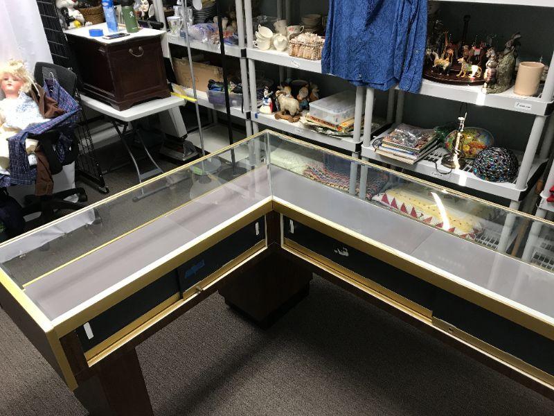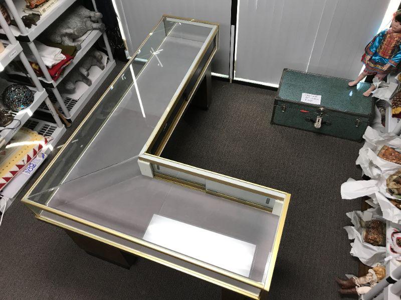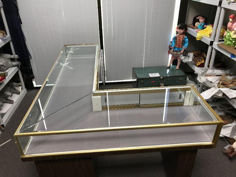 Vintage Jewelry, brass trim, low case, L shaped old school display with sliding/locking panels in back