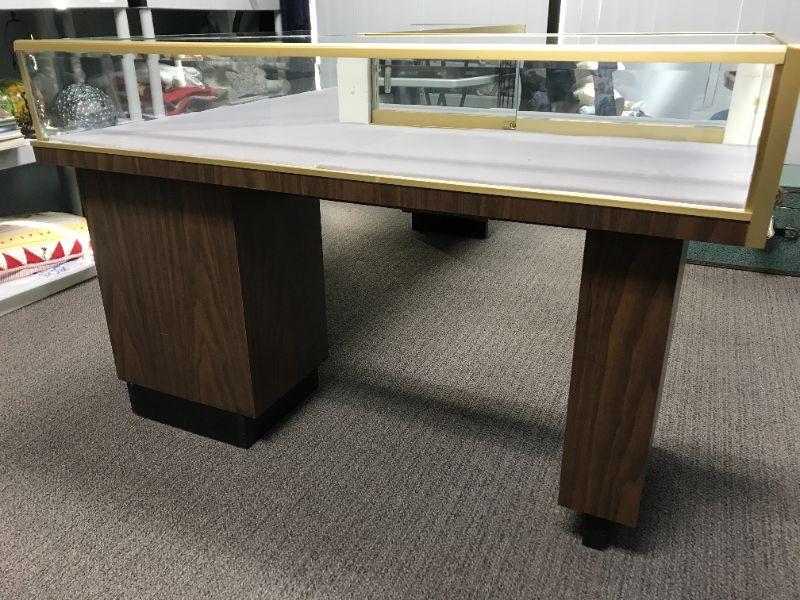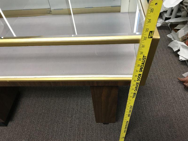 Very good condition. We've had it for about 5 years. We bought it from a jeweler who was retiring. We don't have a need for it anymore. 32”tall, short part is 50”, long part is 70” long. Interior felt is new and easy to replace.