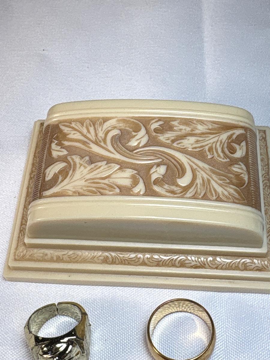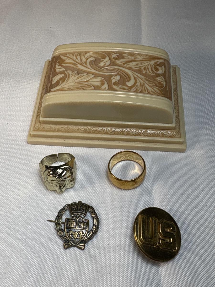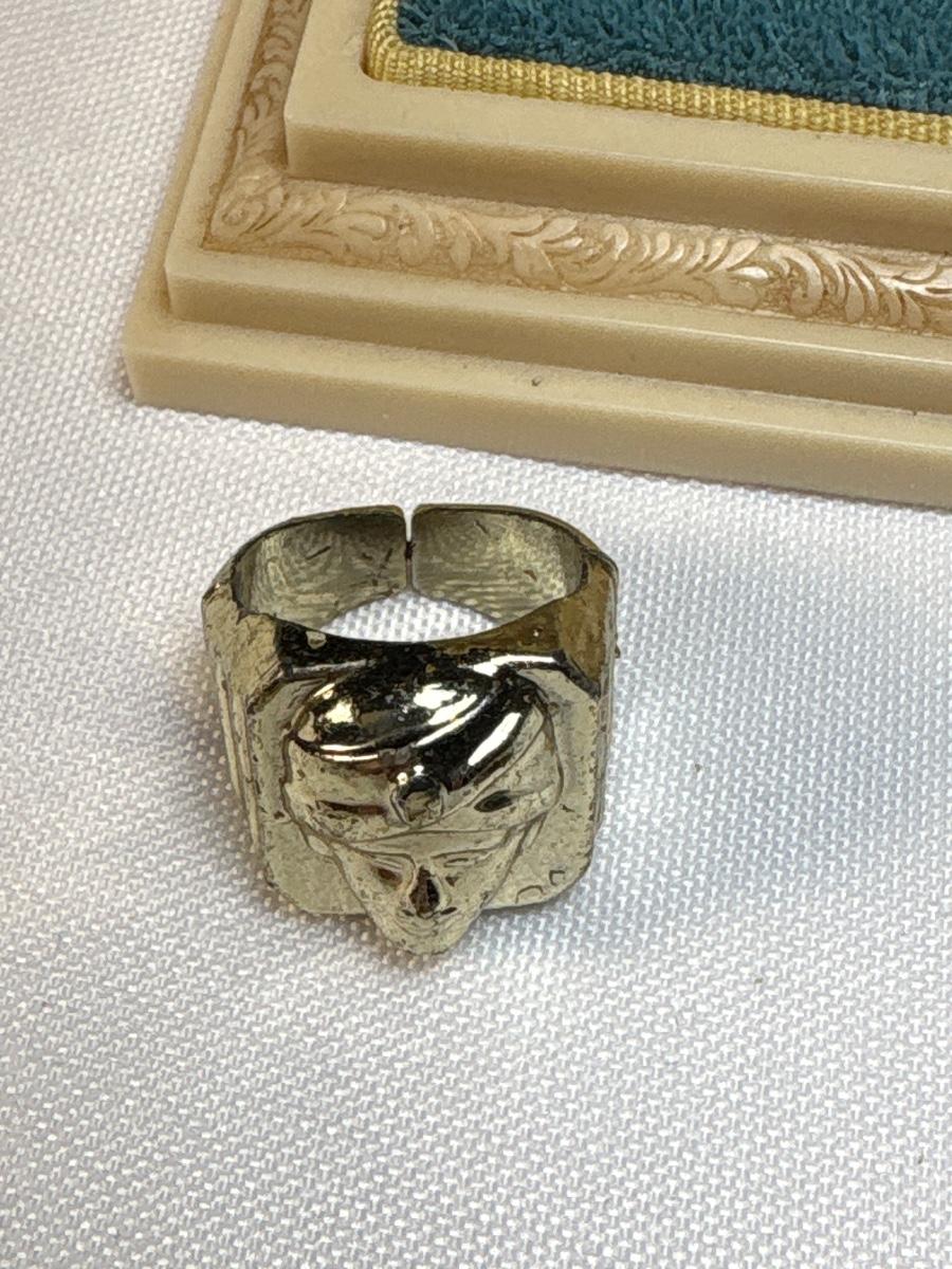 See pics. Gold ring with figure is plastic.
