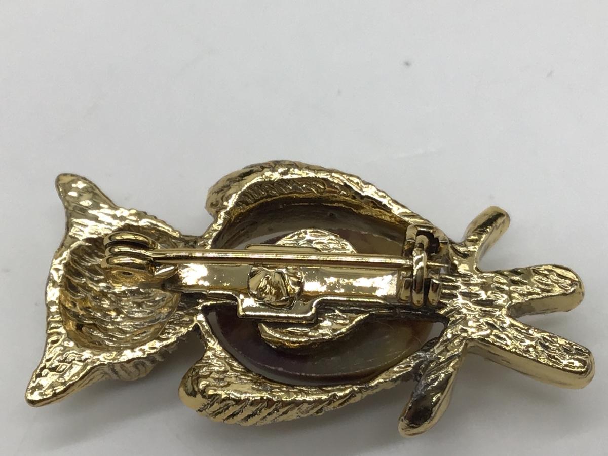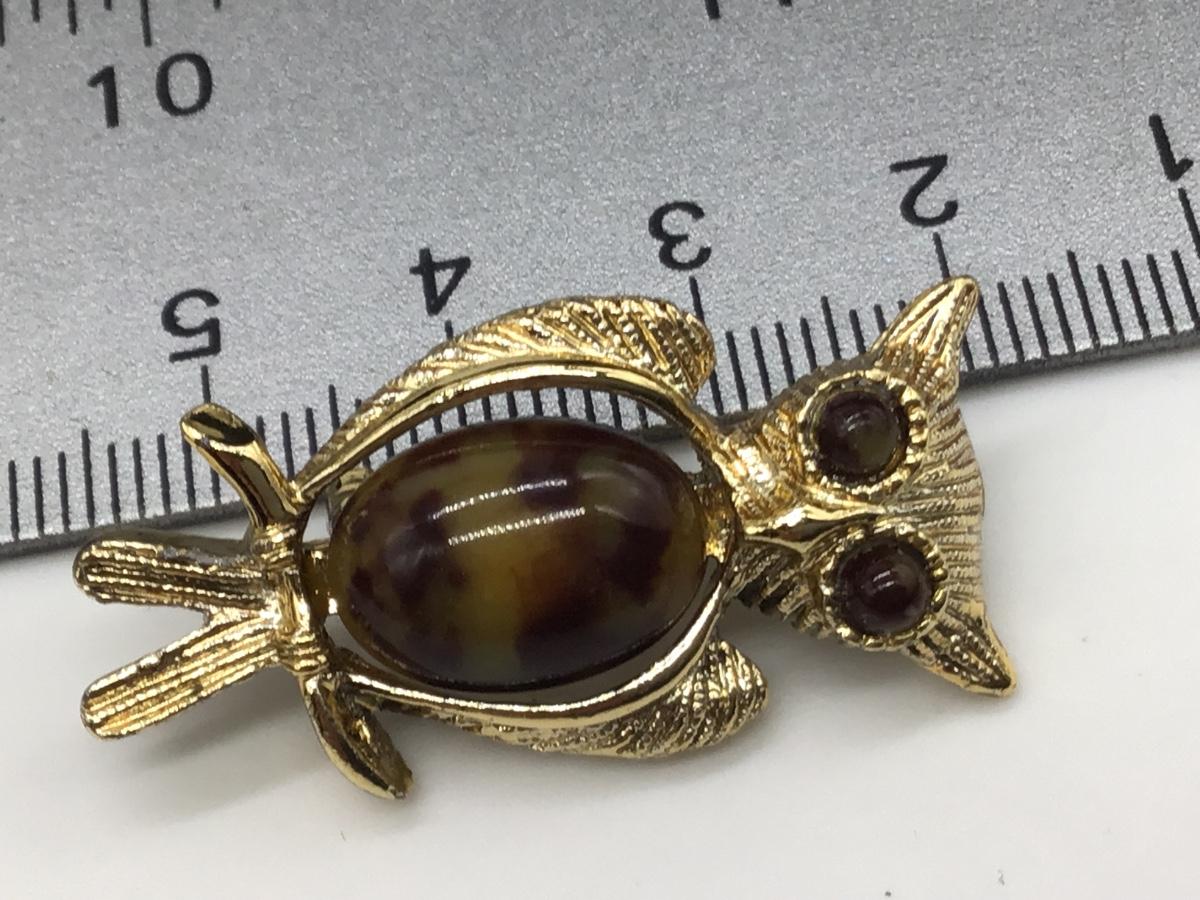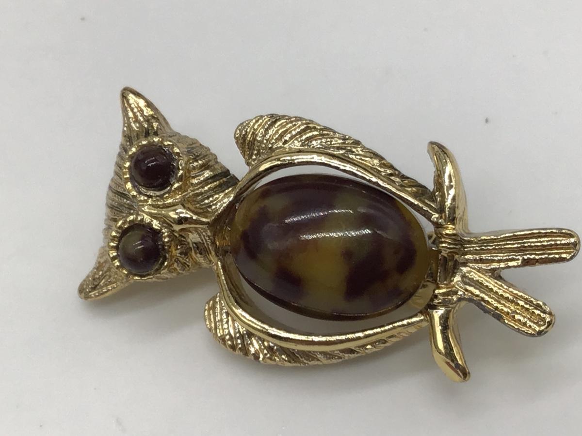 VINTAGE JEWELRY Gold Color Owl Brooch with Cabochon Two Tone Brown Stones