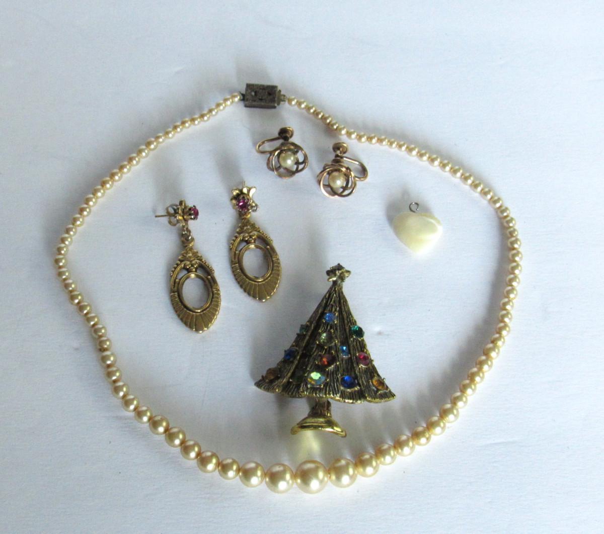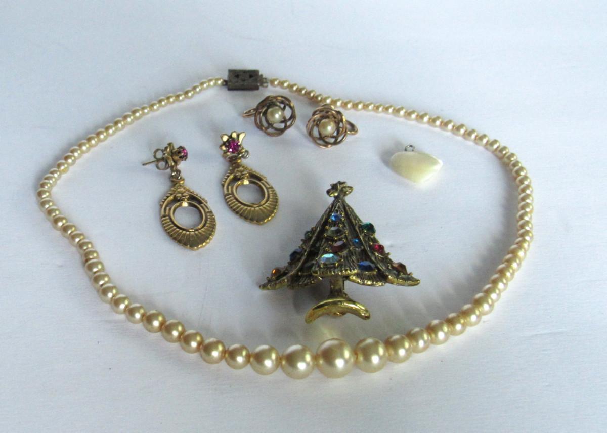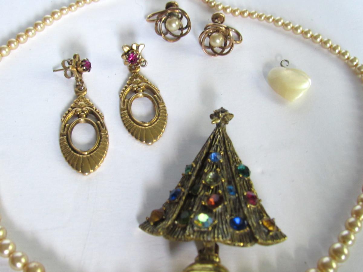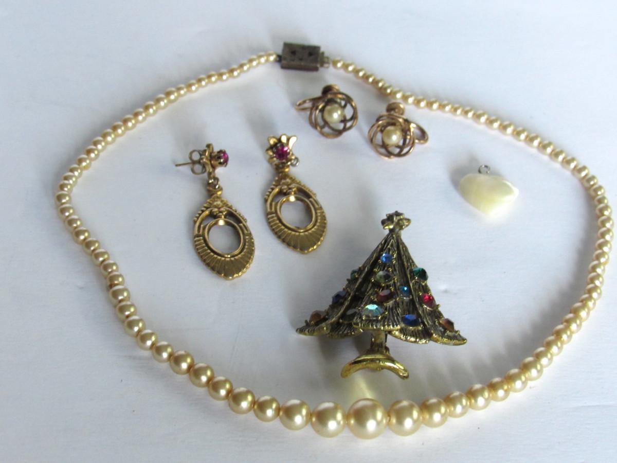 Vintage Jewelry, Hollycraft Tree Pin, GF Earrings, Faux Pearls, More