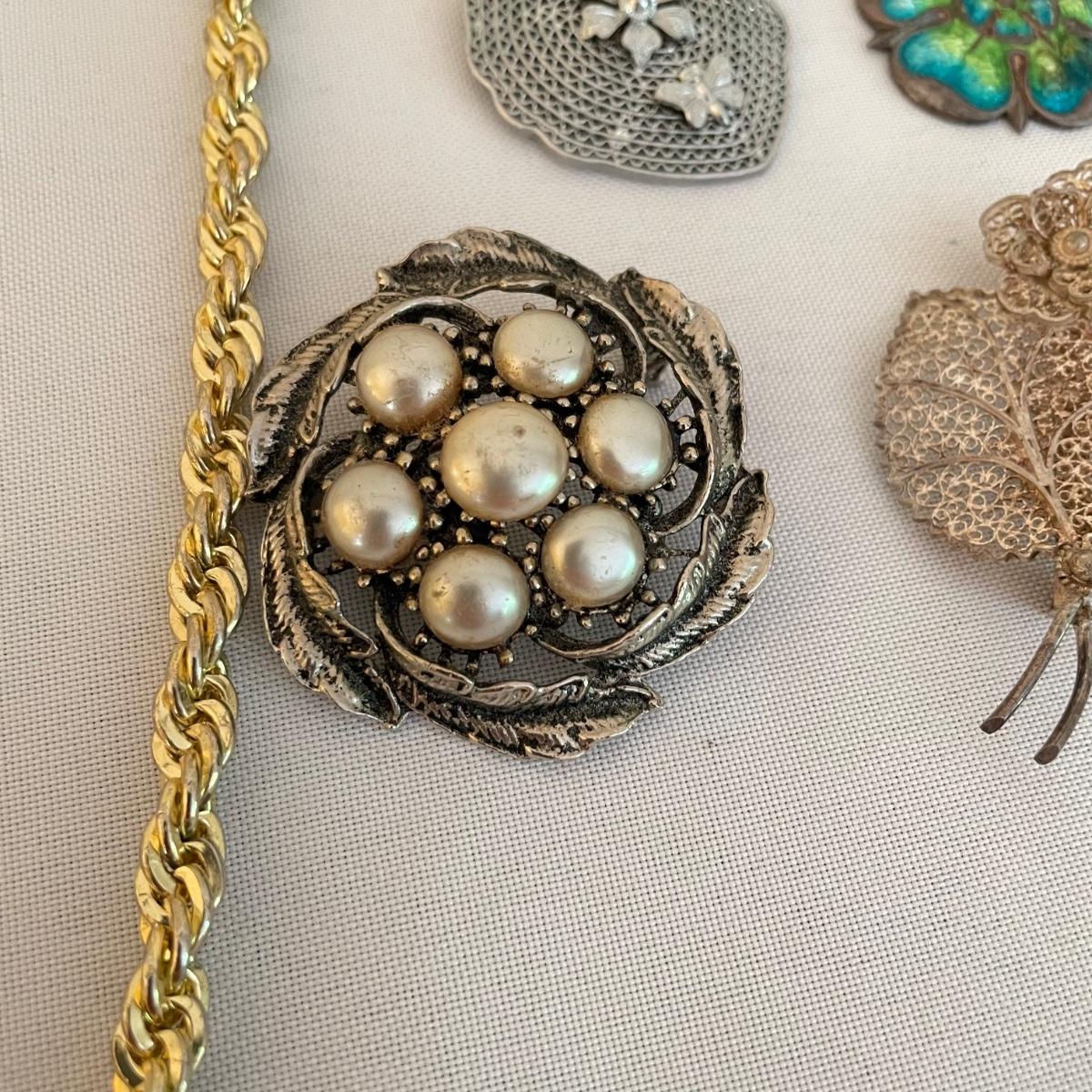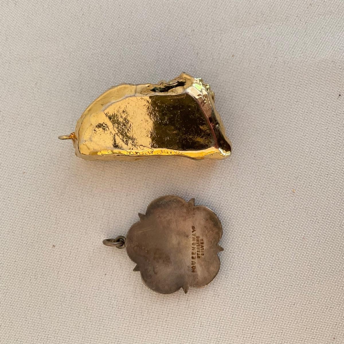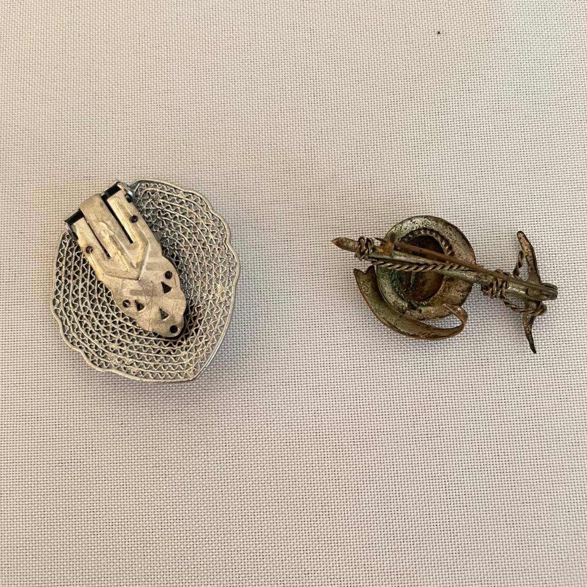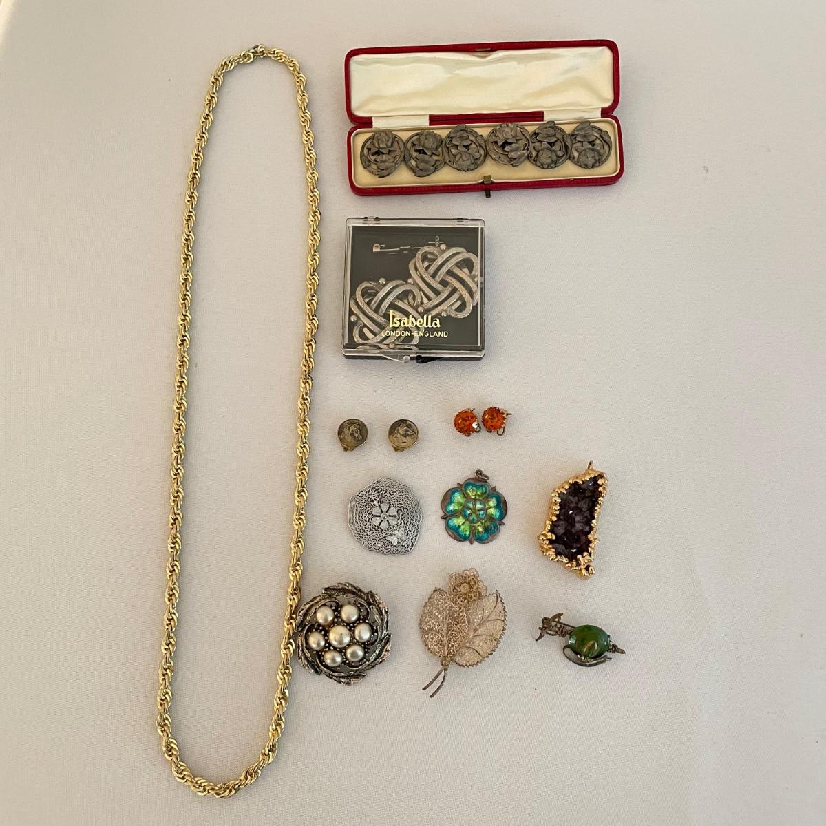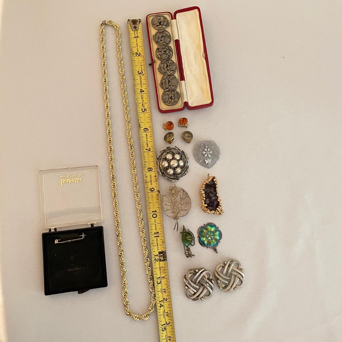 Vintage jewelry including a Sterling and enamel pendant by McQueen Way, two pairs of clip earrings, multiple brooches, three clips, six vintage buttons, and a long thick bright gold colored chain. See images. Shipping available.