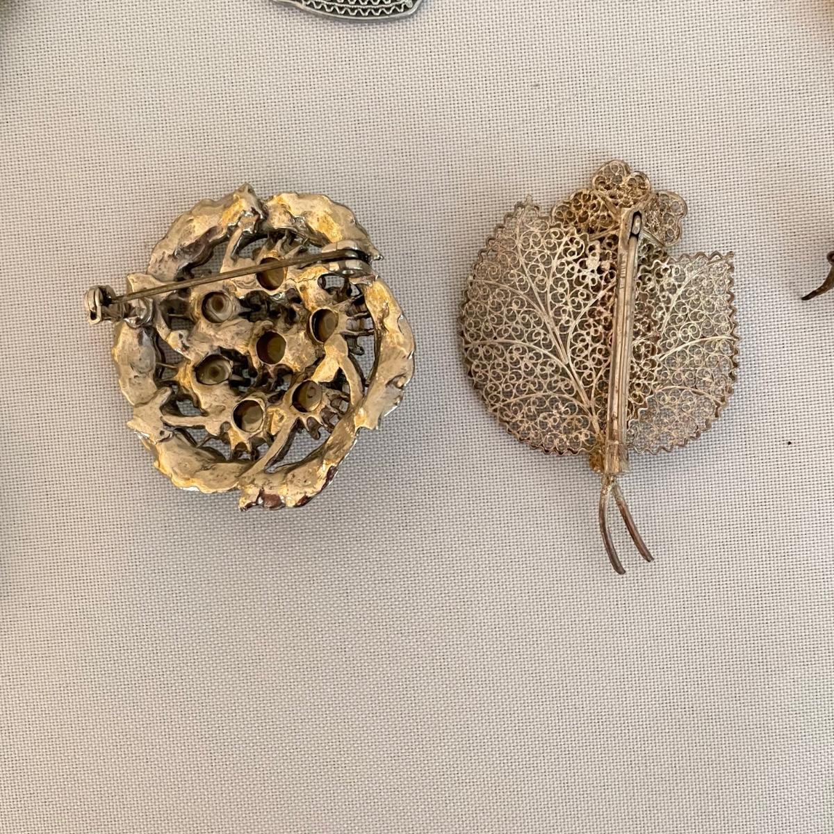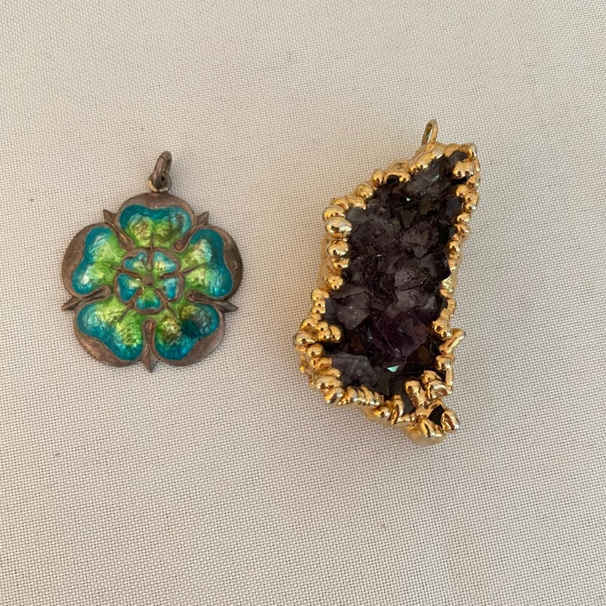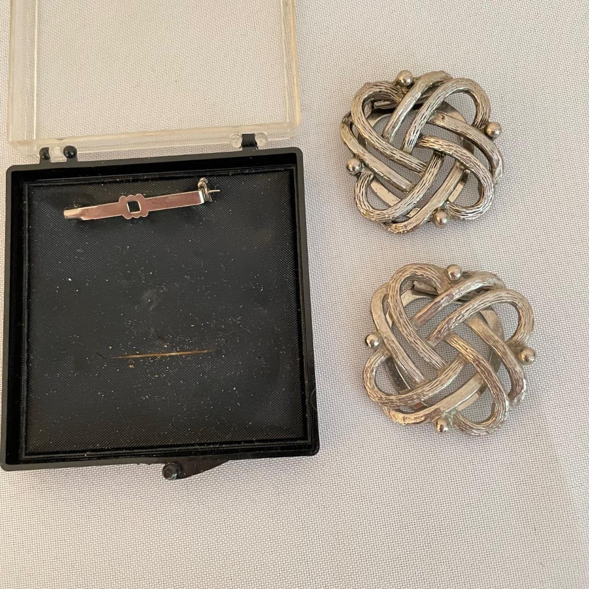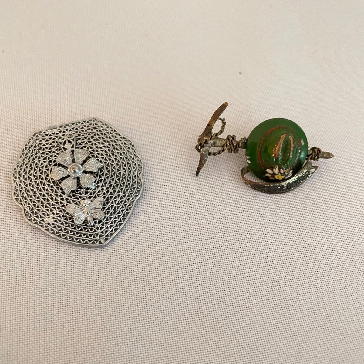 Vintage jewelry including a Sterling and enamel pendant by McQueen Way, two pairs of clip earrings, multiple brooches, three clips, six vintage buttons, and a long thick bright gold colored chain. See images. Shipping available.