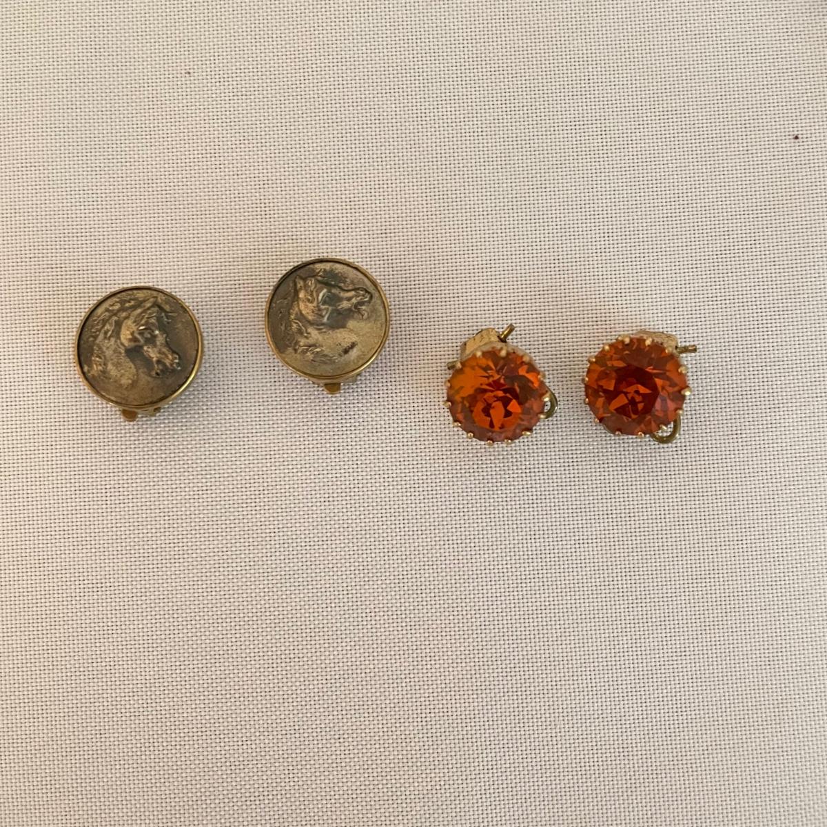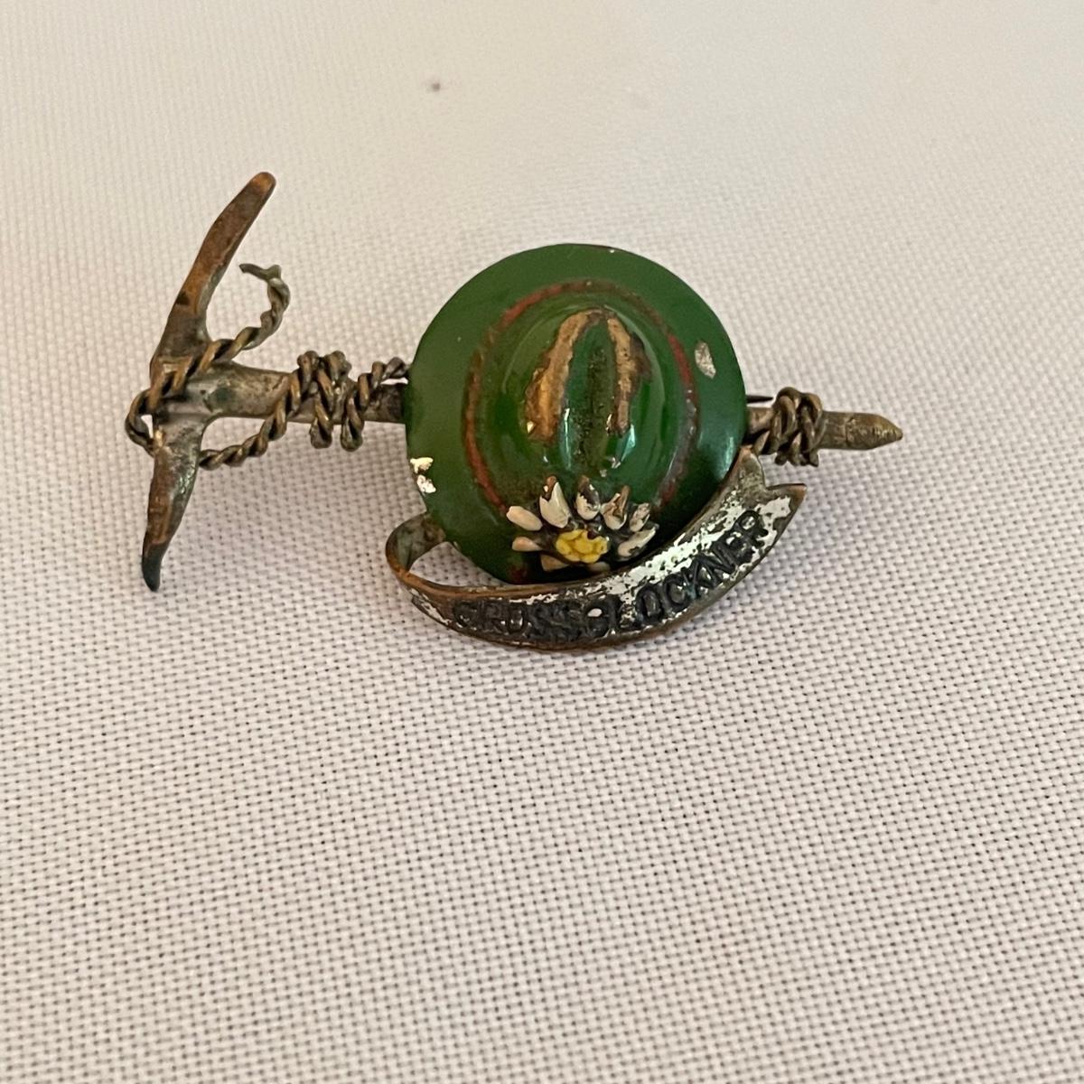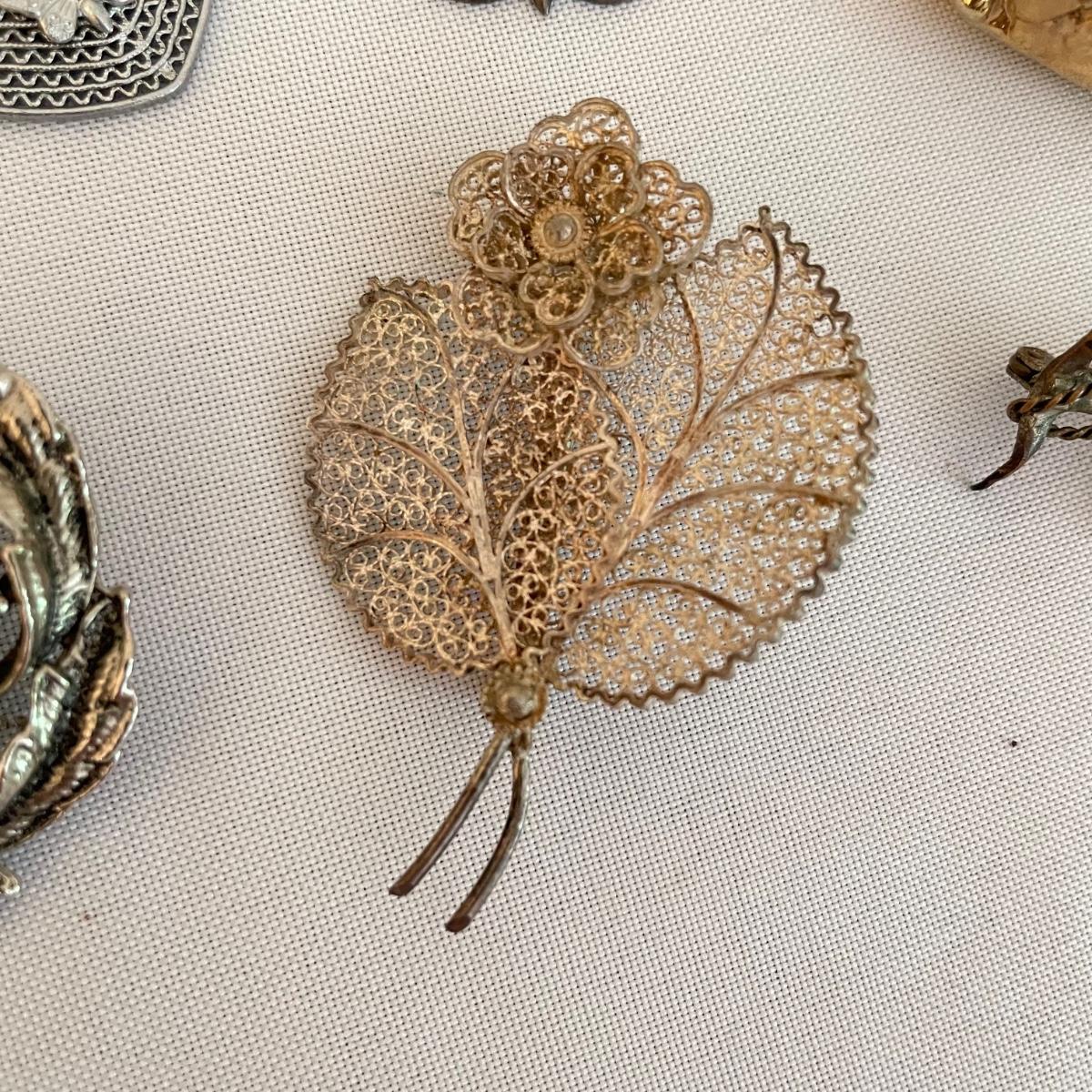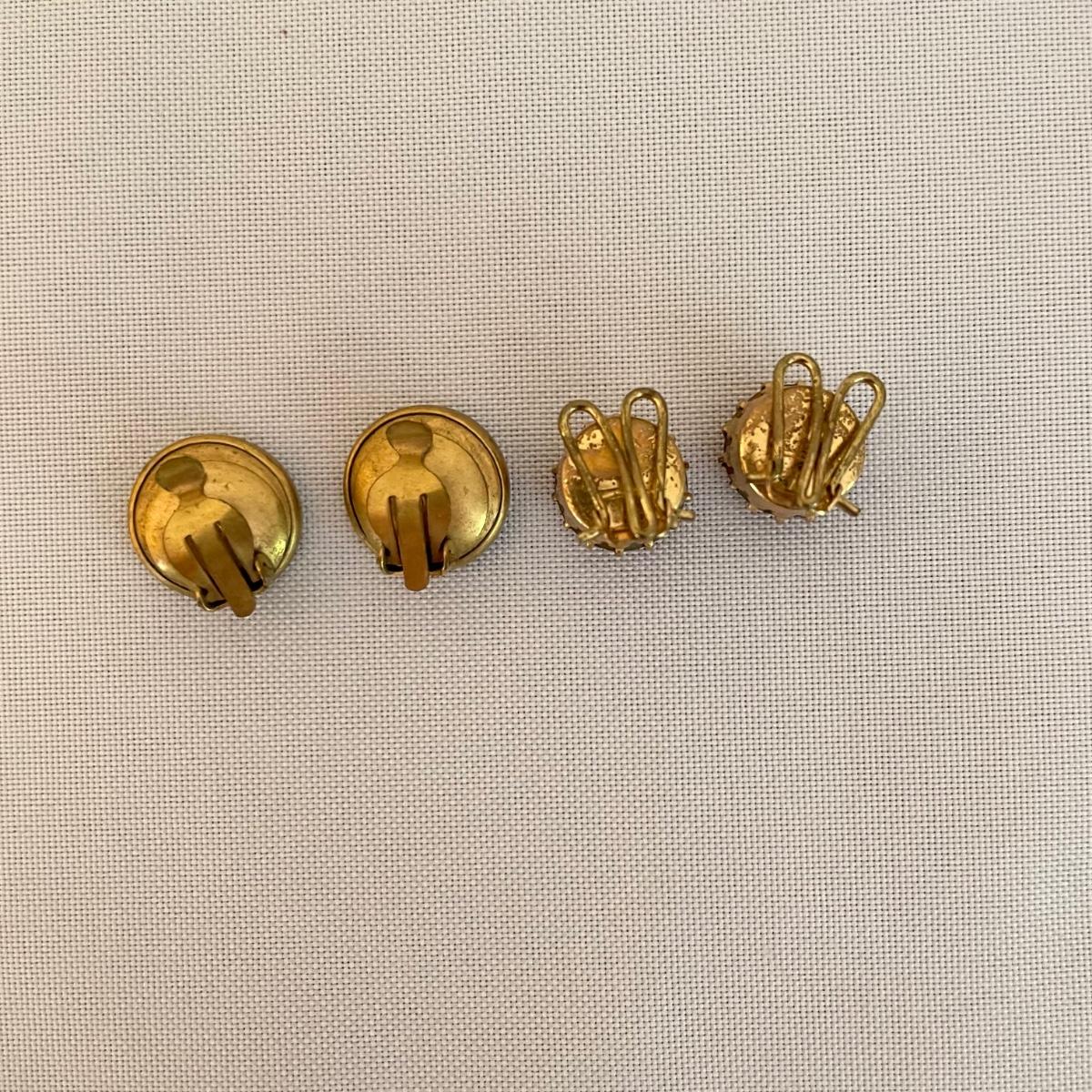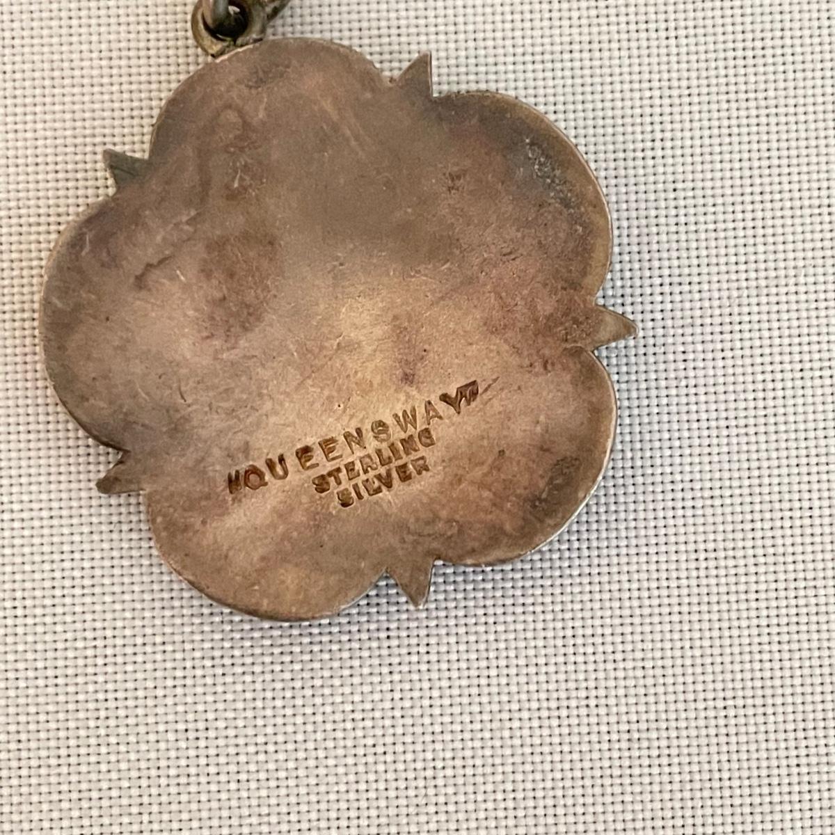 Vintage jewelry including a Sterling and enamel pendant by McQueen Way, two pairs of clip earrings, multiple brooches, three clips, six vintage buttons, and a long thick bright gold colored chain. See images. Shipping available.